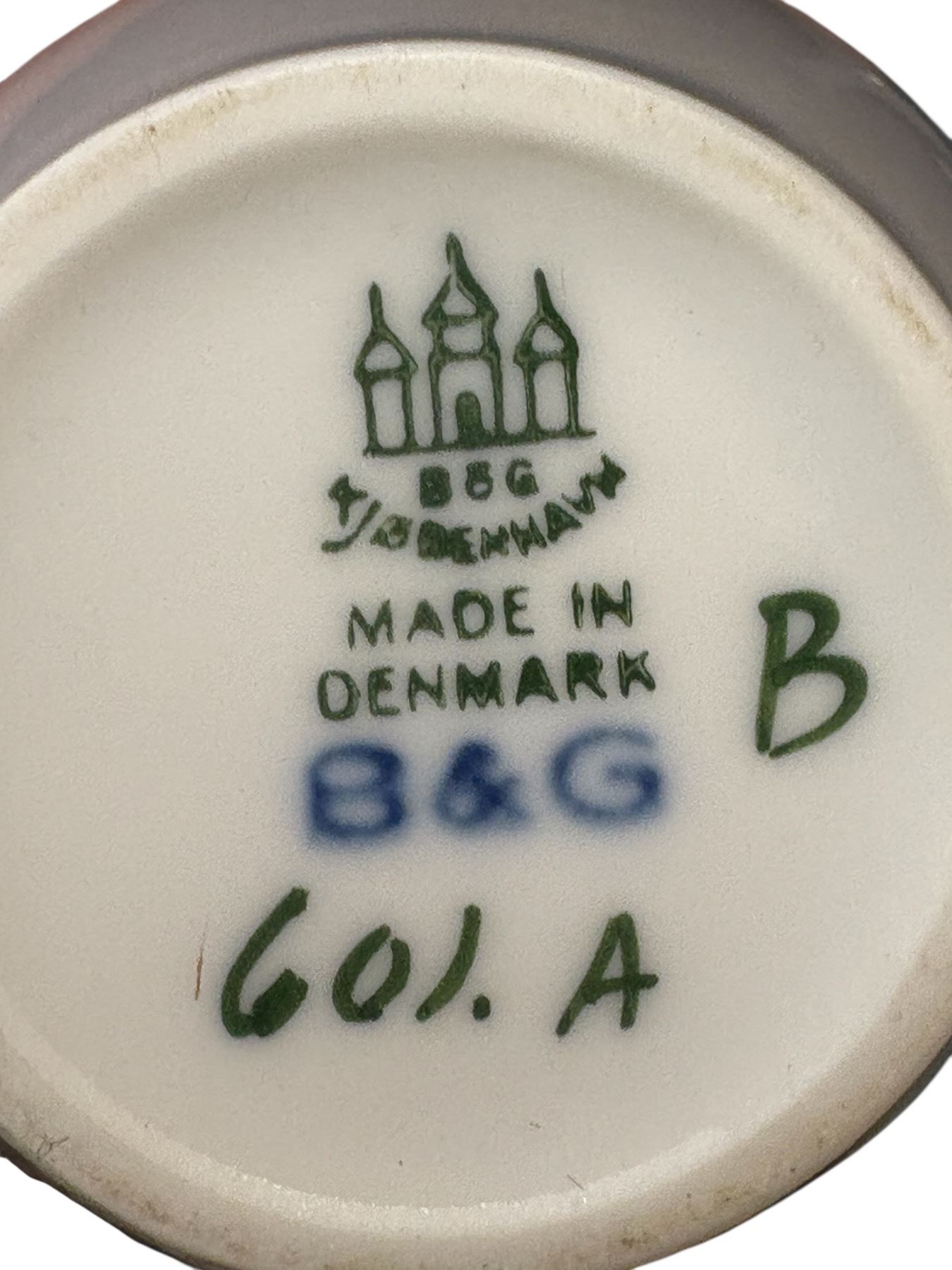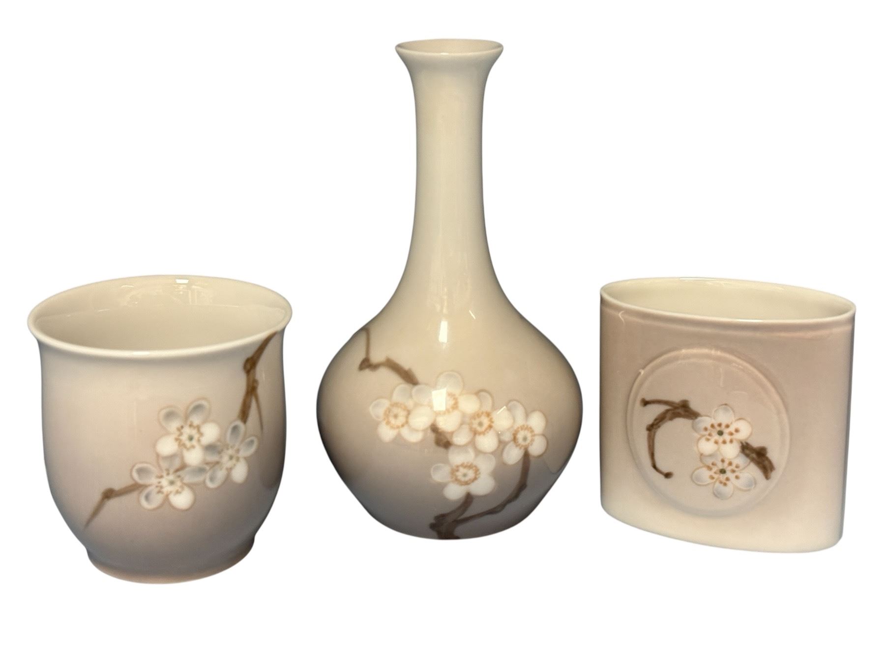 Bing & Grondahl bud vase in the Apple Blossom pattern with matching plate, made in Denmark. Vase is 5 inches tall, crafted from porcelain with detailed floral design. Plate complements the vase with matching decoration. B&G hallmark present on the base, denoting quality Danish craftsmanship.