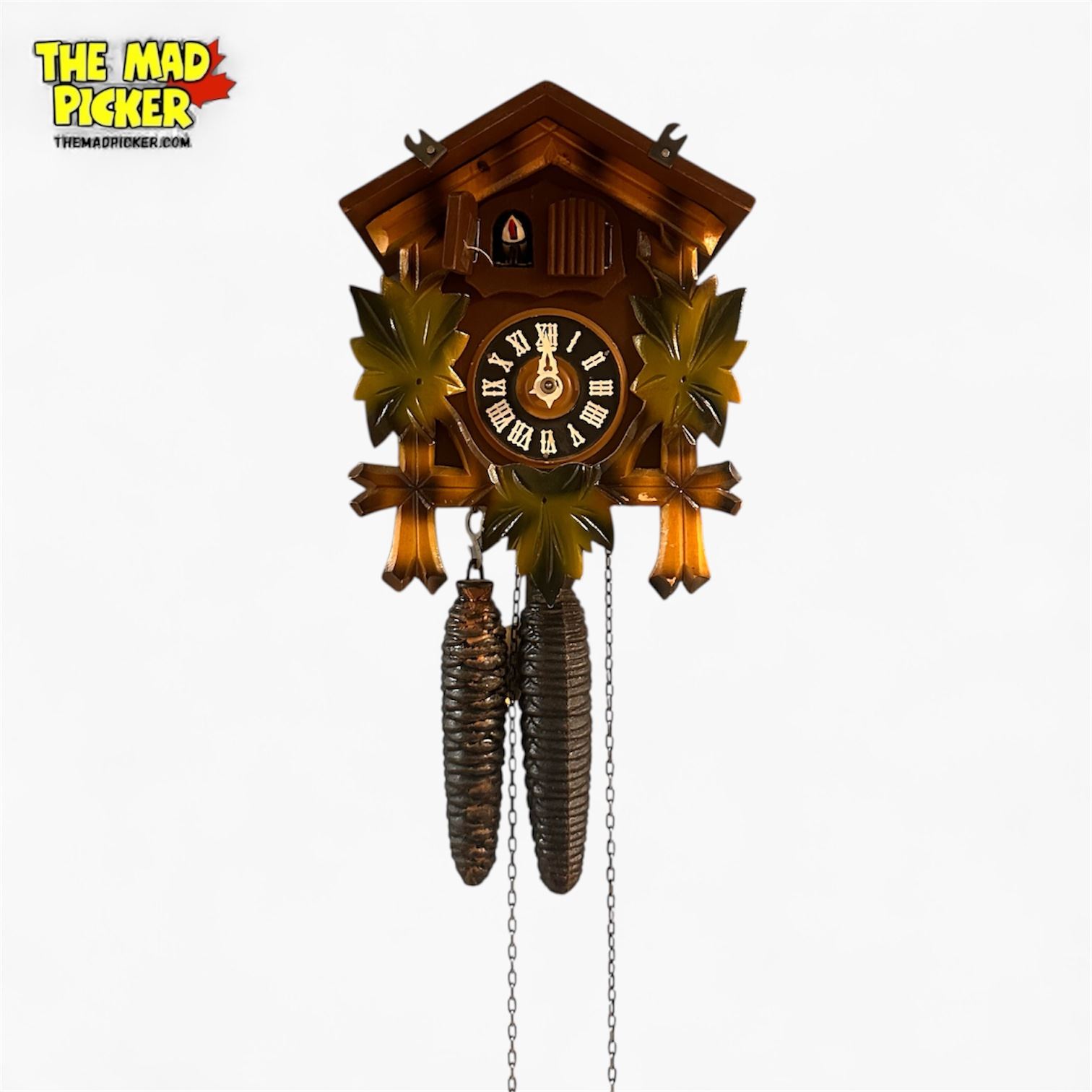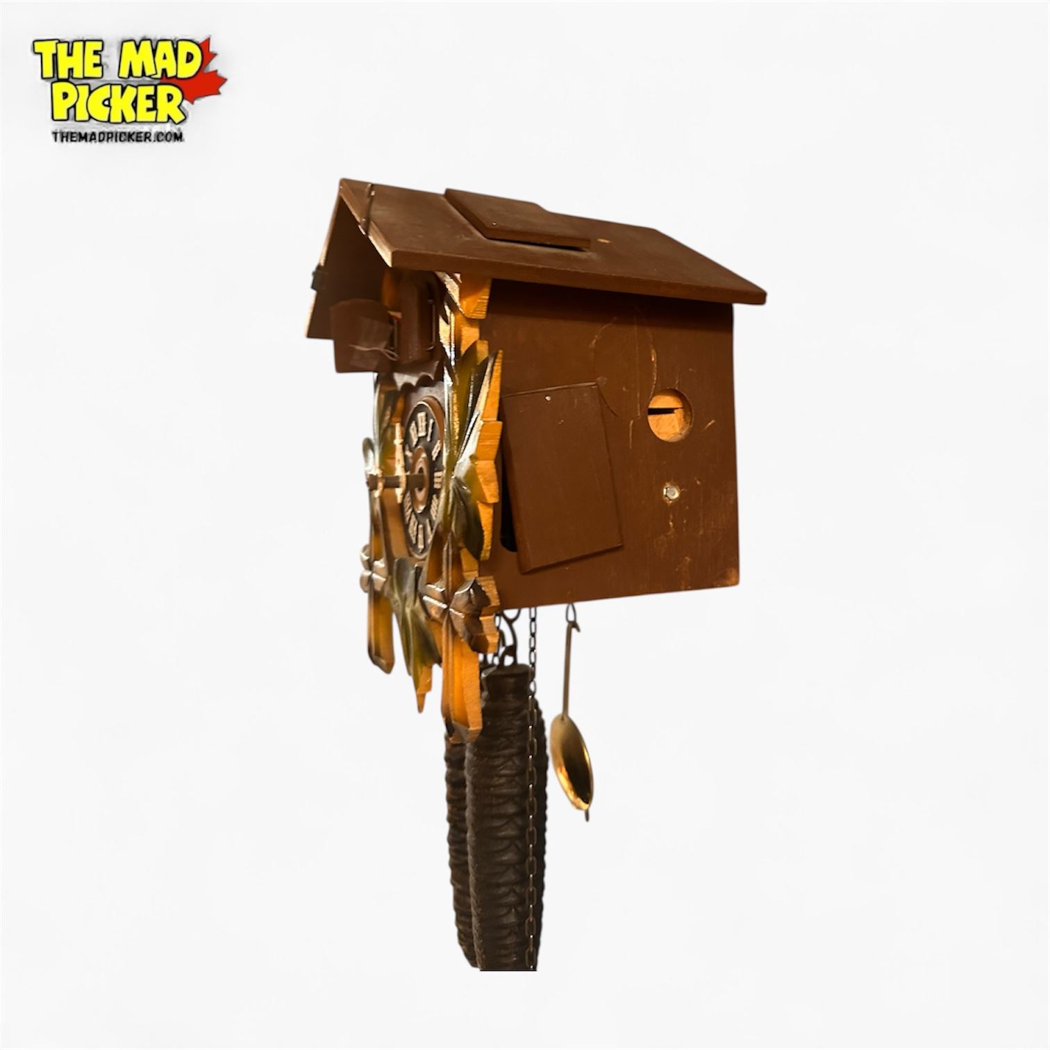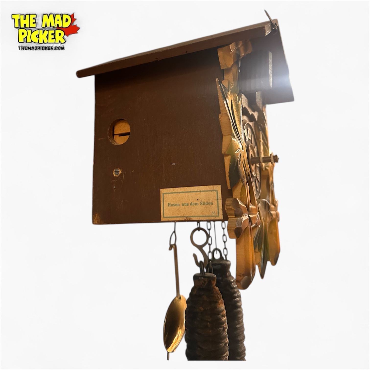 Working Condition, needs some repaird. Handcrafted Black Forest chalet-style cuckoo clock made in Germany. Features intricate bird and leaf carvings and traditional cuckoo mechanism. Measures 11 1/2 inches tall. Includes weights for operation. Classic design representing traditional German craftsmanship.
