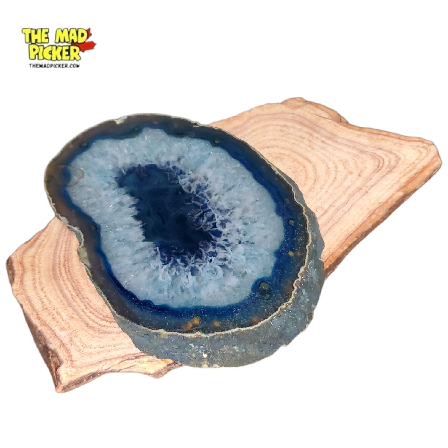 Set includes one blue dyed agate slice and one petrified wood slice. The agate features natural banding with vibrant blue dye, while the petrified wood showcases preserved wood grain in neutral tones. Suitable as coasters or decorative accents. Dimensions and sources not specified.