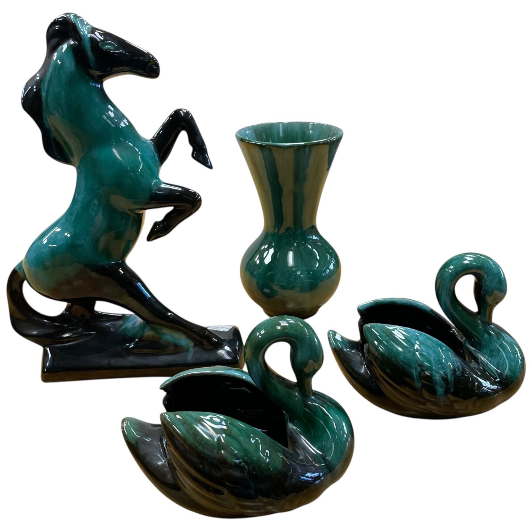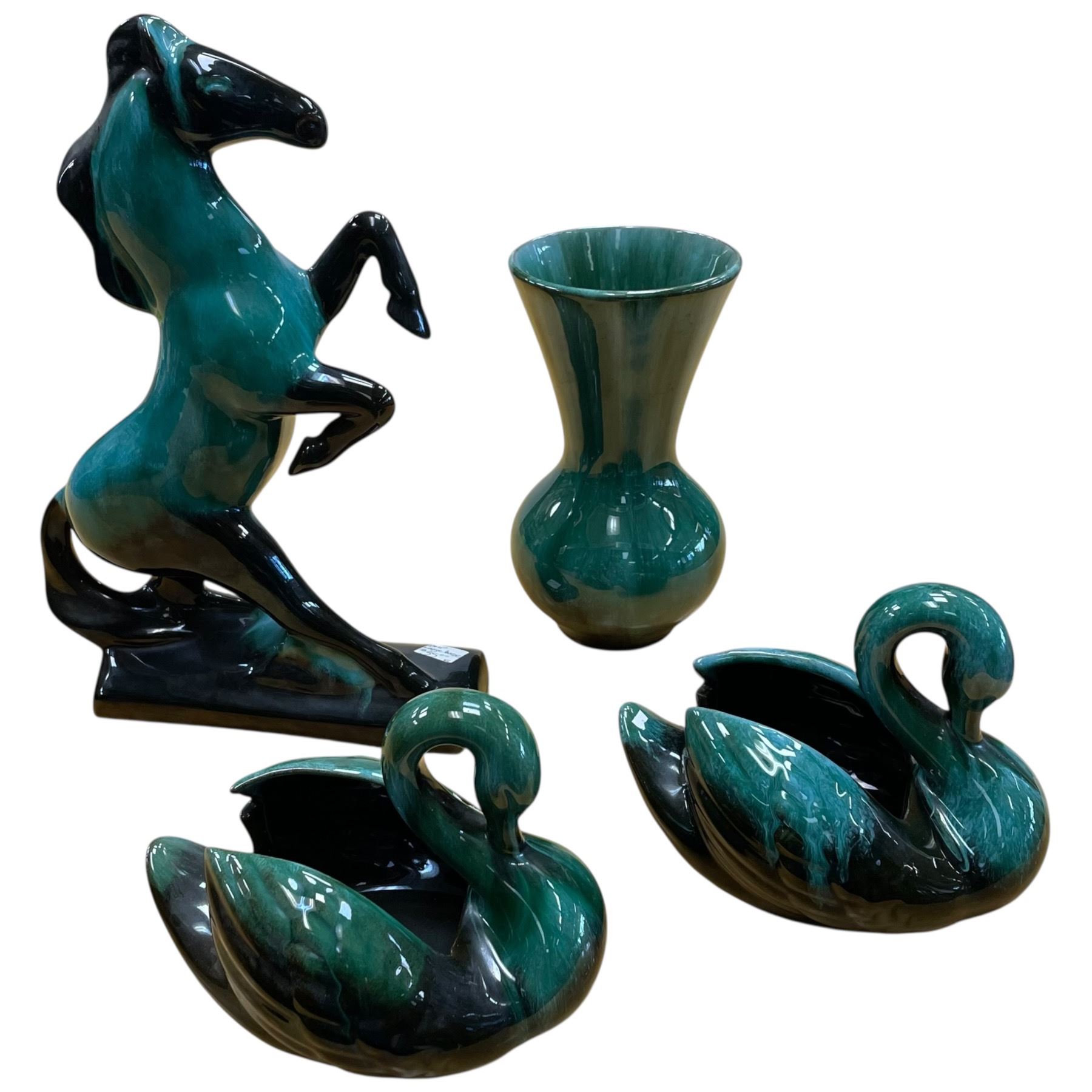 Collection of Blue Mountain Pottery items including 2 swan platters, a vase, and a horse sculpture measuring 14-Inch tall. Known for its signature drip glaze technique, Blue Mountain Pottery was manufactured in Canada until production ceased in 2004. Items are as pictured.