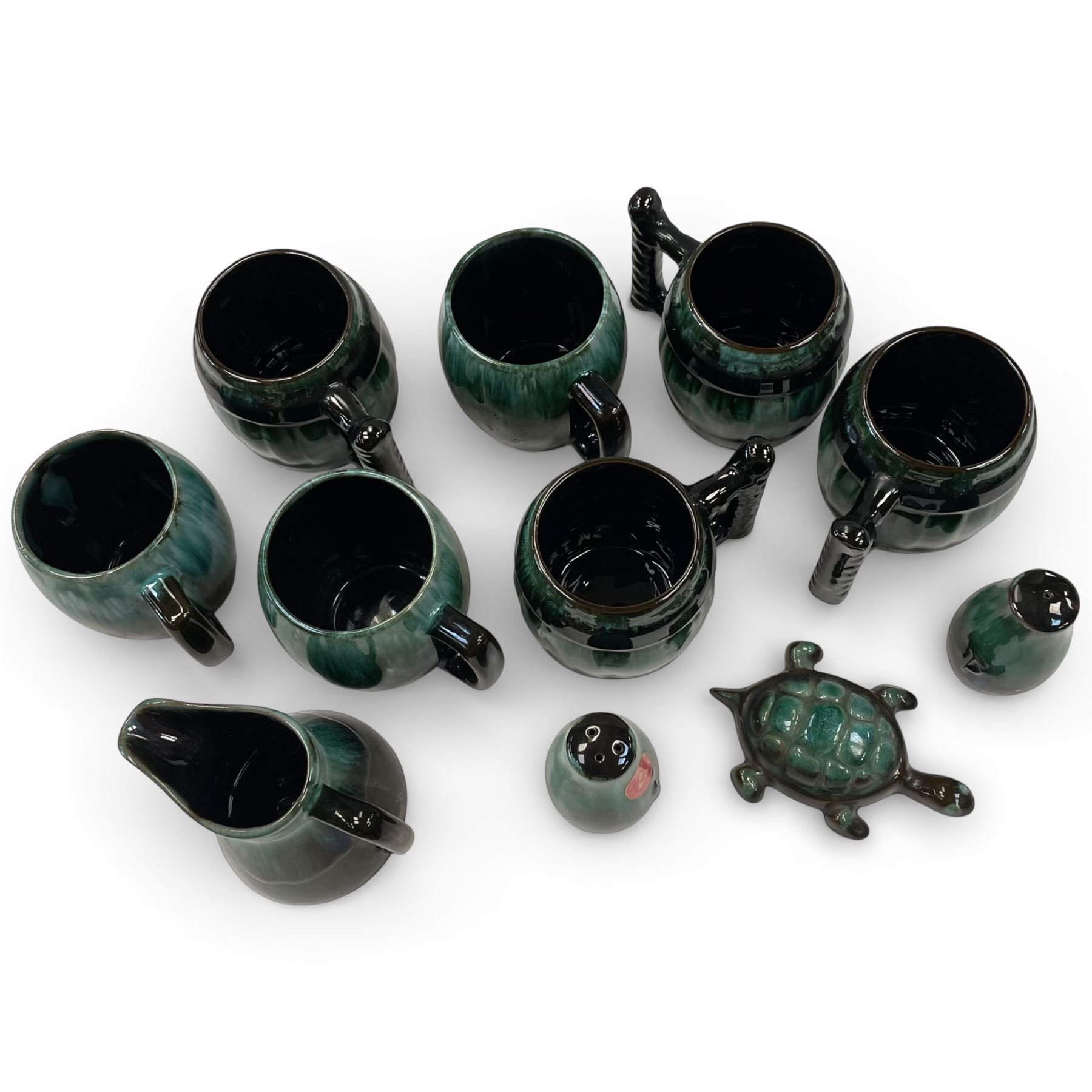Collection of Blue Mountain Pottery items including mugs, jug, salt & pepper shakers, and a random turtle figurine. Pieces feature the iconic drip glaze finish and were made in Canada. Item is as pictured.