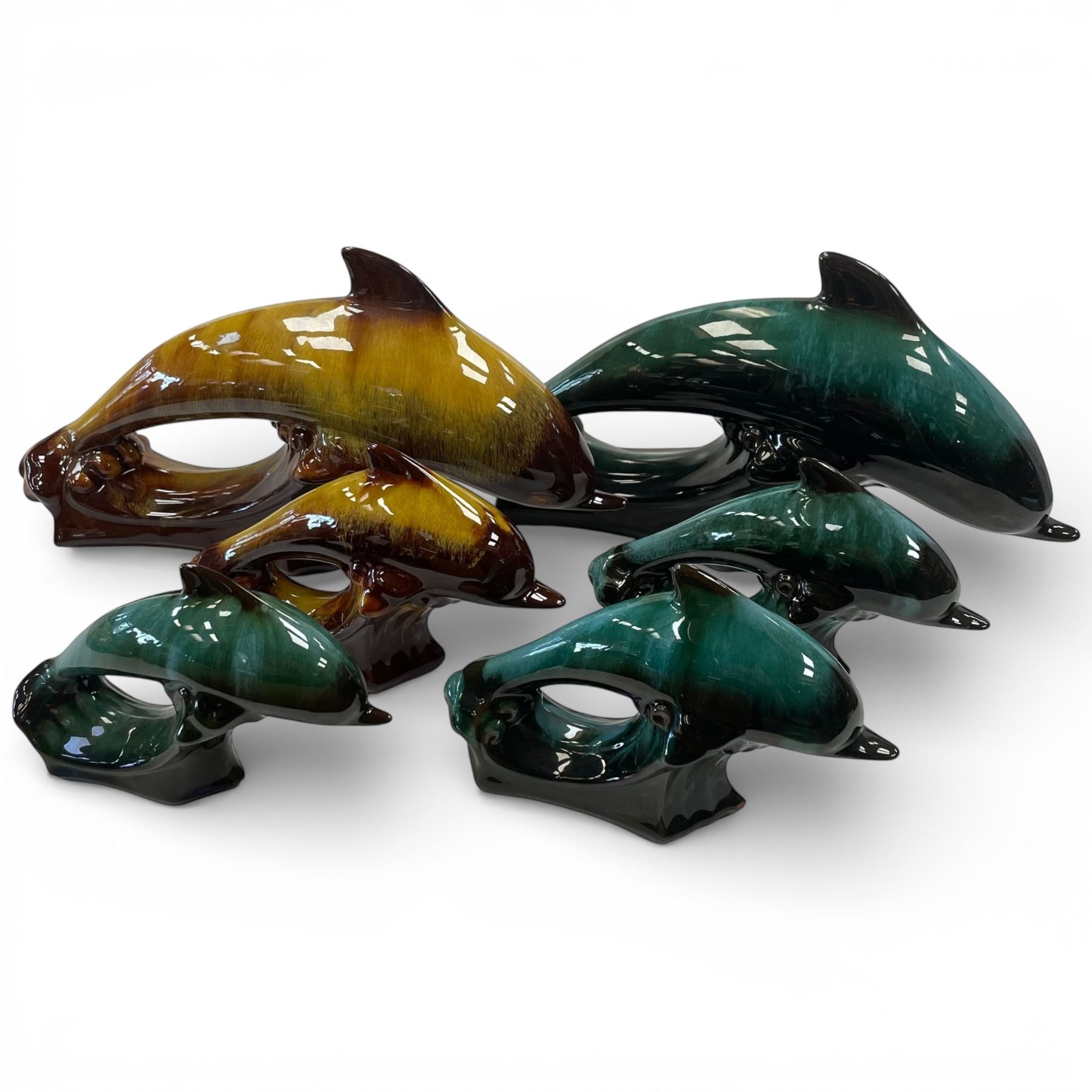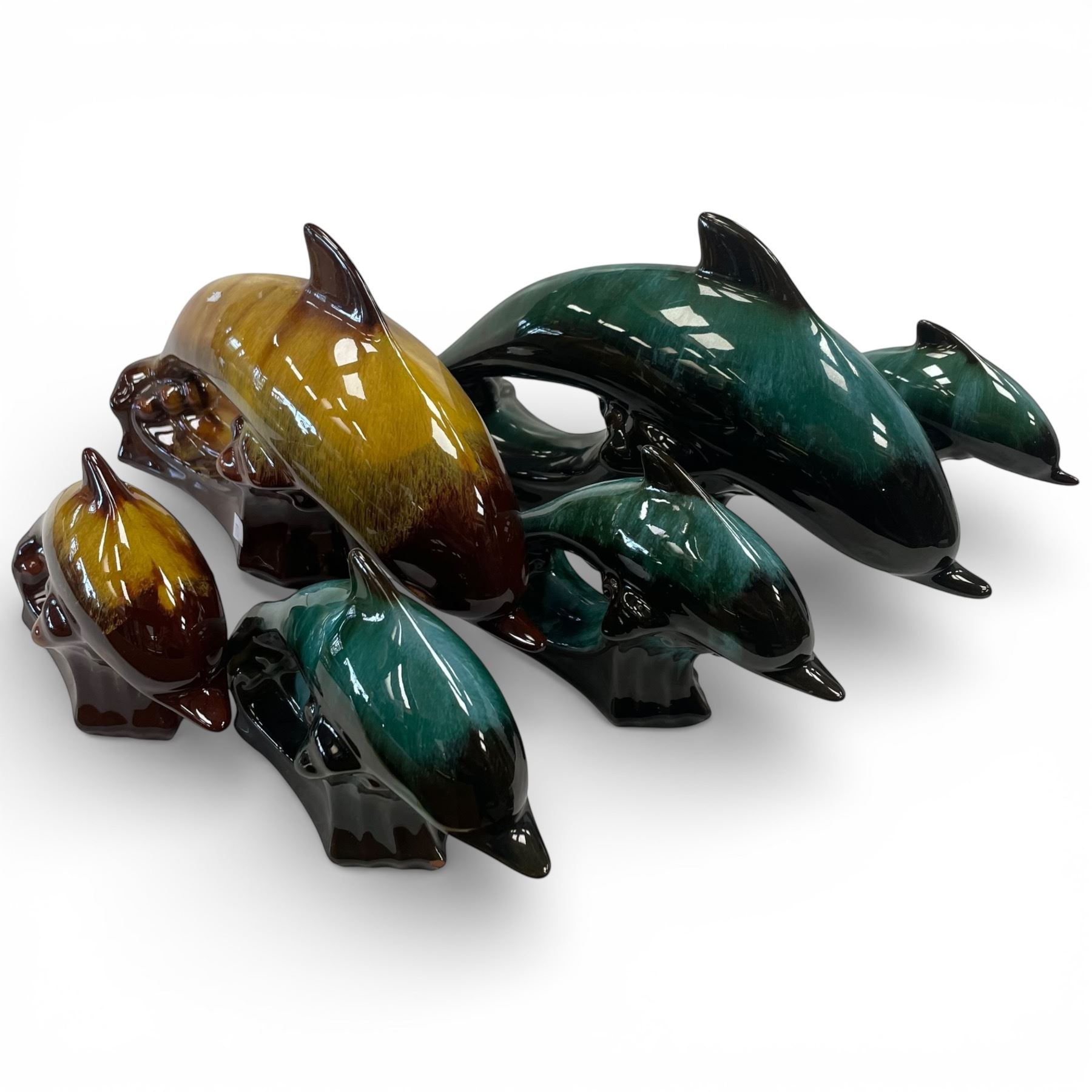 Pod of 6 Blue Mountain Pottery dolphins featuring 4 small dolphins measuring 6-Inch long and 2 medium dolphins measuring 12-Inch long. Crafted in green and brown glazes characteristic of Blue Mountain Pottery. Known for their unique drip glaze technique, Blue Mountain Pottery operated in Canada from 1953 to 2004.