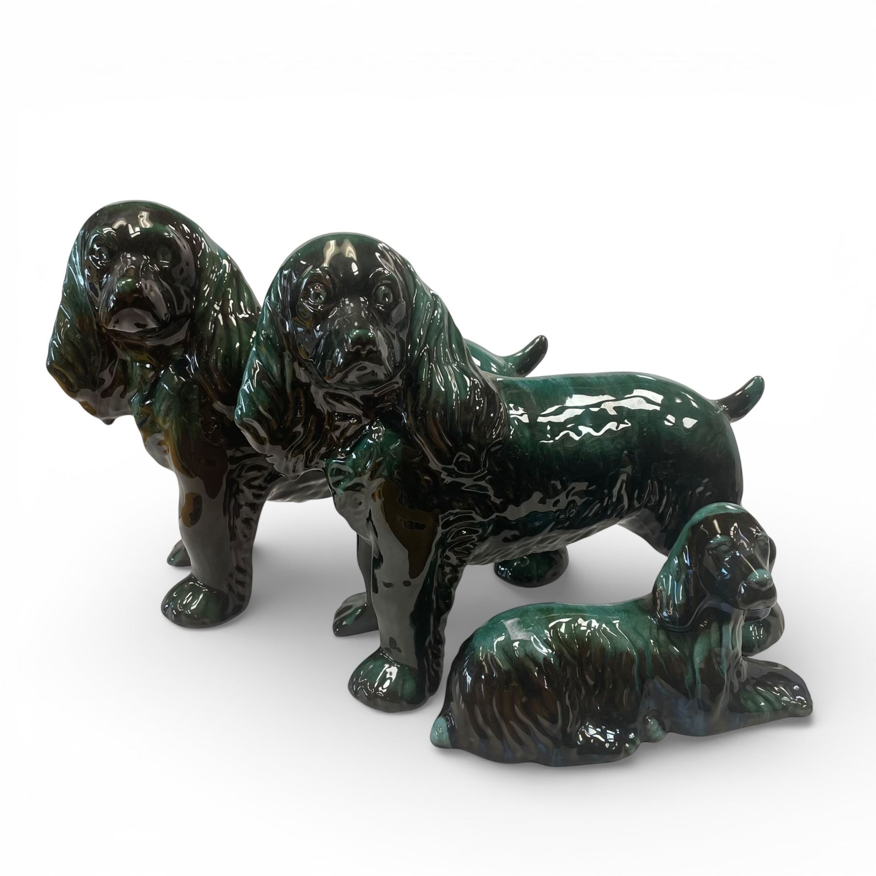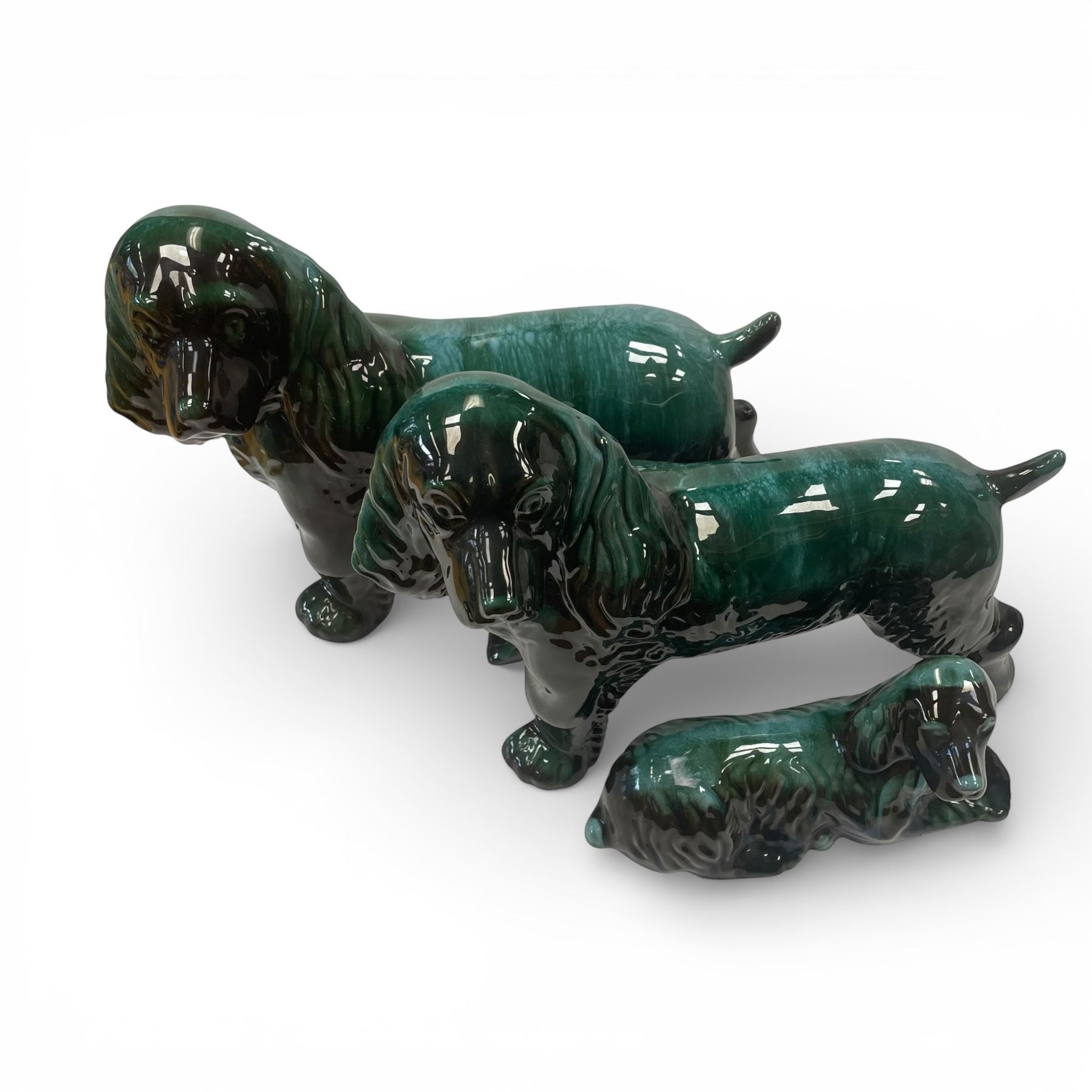 Trio of Blue Mountain Pottery ceramic Cocker Spaniel pieces featuring the trademark drip glaze design. The largest piece in the set measures 14-Inch long. Blue Mountain Pottery was produced in Collingwood, Ontario, from 1947 to 2004, known for its distinctive glazes and collectible designs. Item is as pictured.