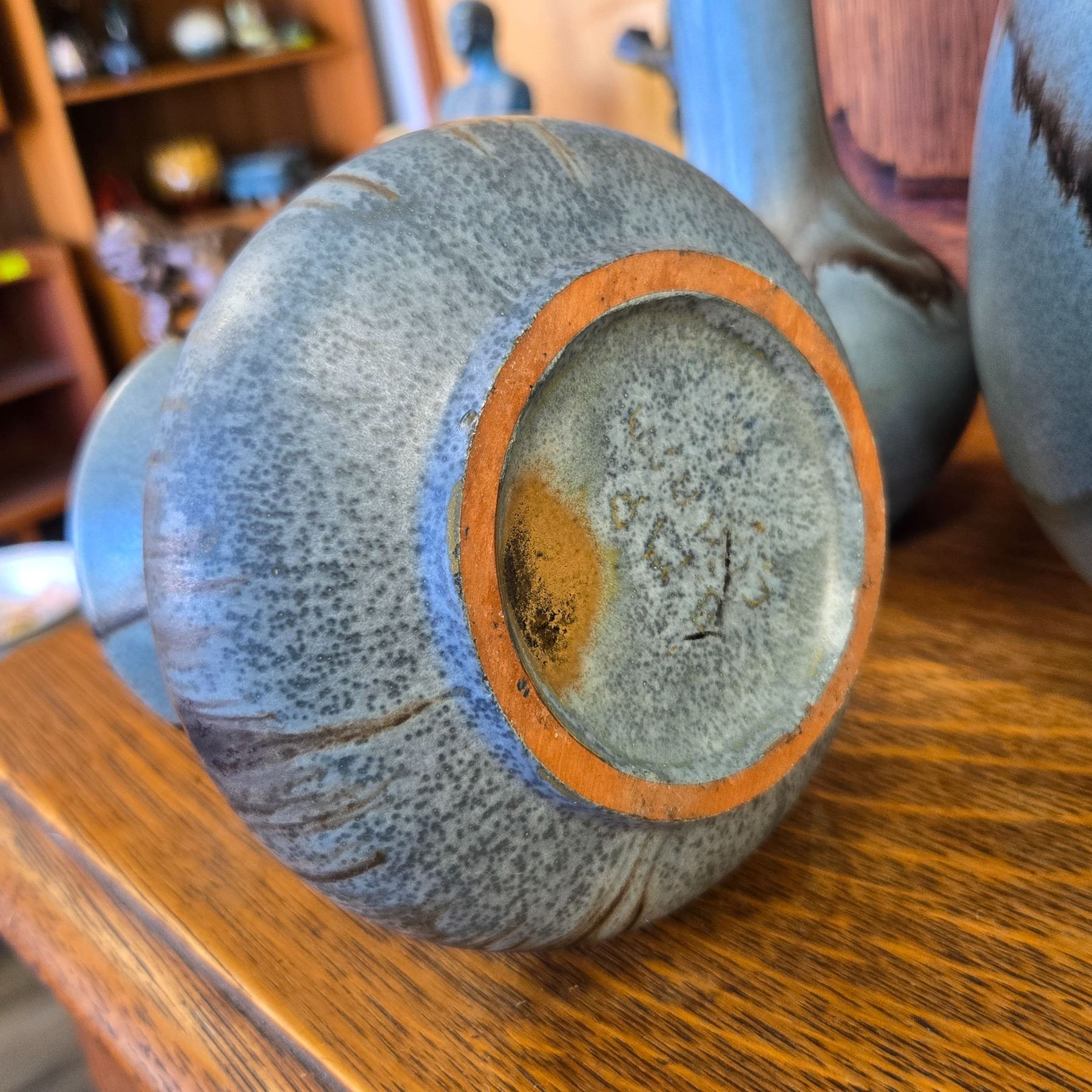 Trio of Blue Mountain Pottery pieces featuring a granite or slate glaze. Includes two vases and one pitcher. The pitcher measures 10.5-Inch tall. Crafted in Canada by Blue Mountain Pottery prior to its closure in 2004. Known for signature drip glaze technique and collectible ceramic designs. Items are as pictured.