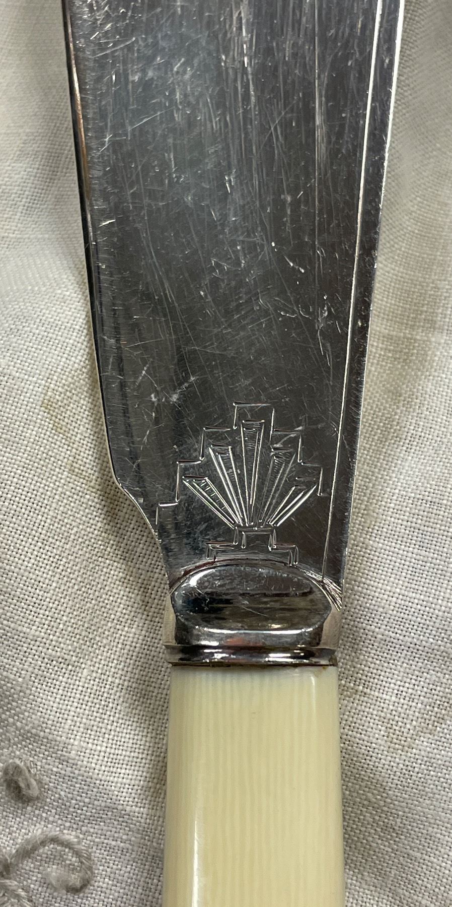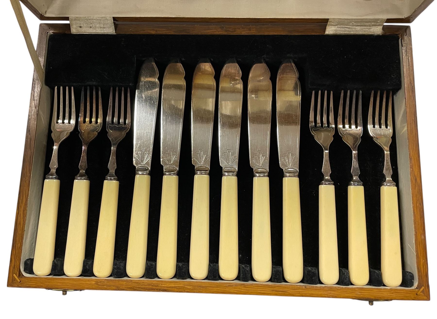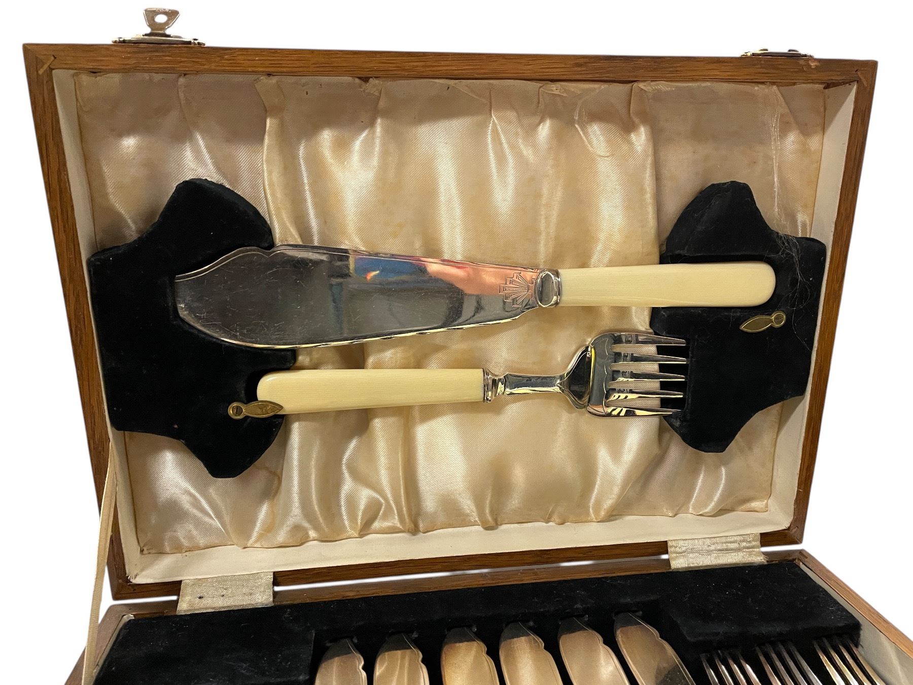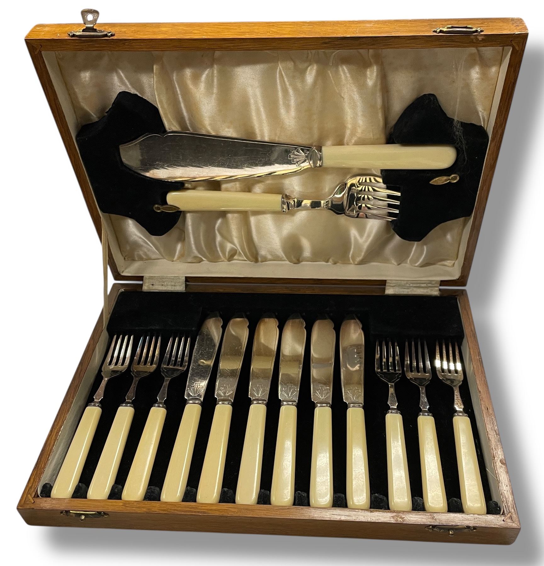 Bone Handled Antique Fish Knives and Fork Set with Serving Pieces - 6 Place settings in fitted wood case