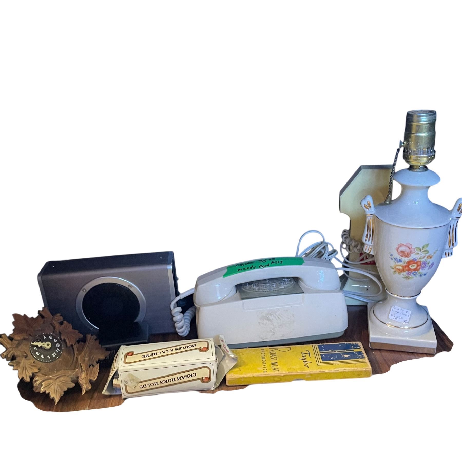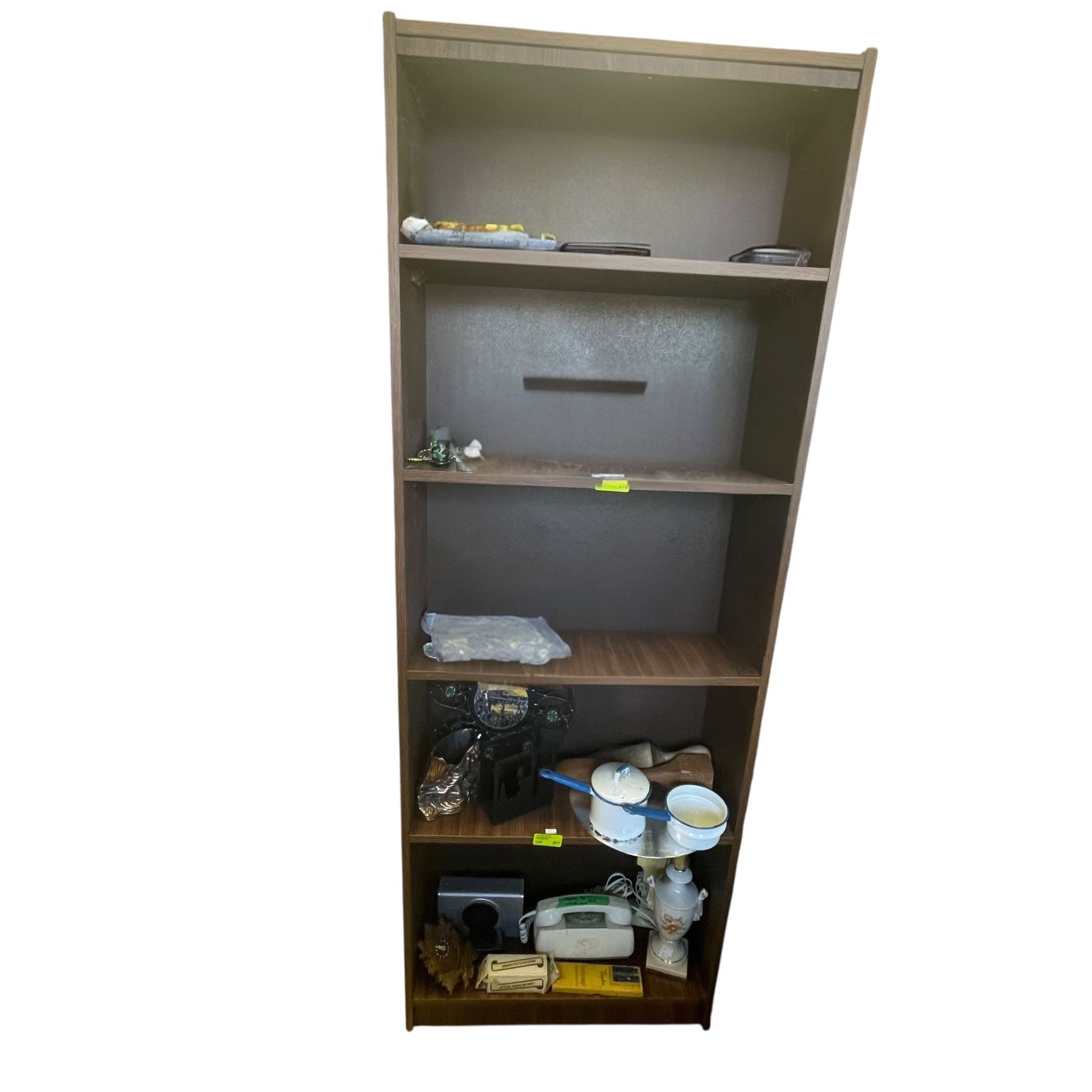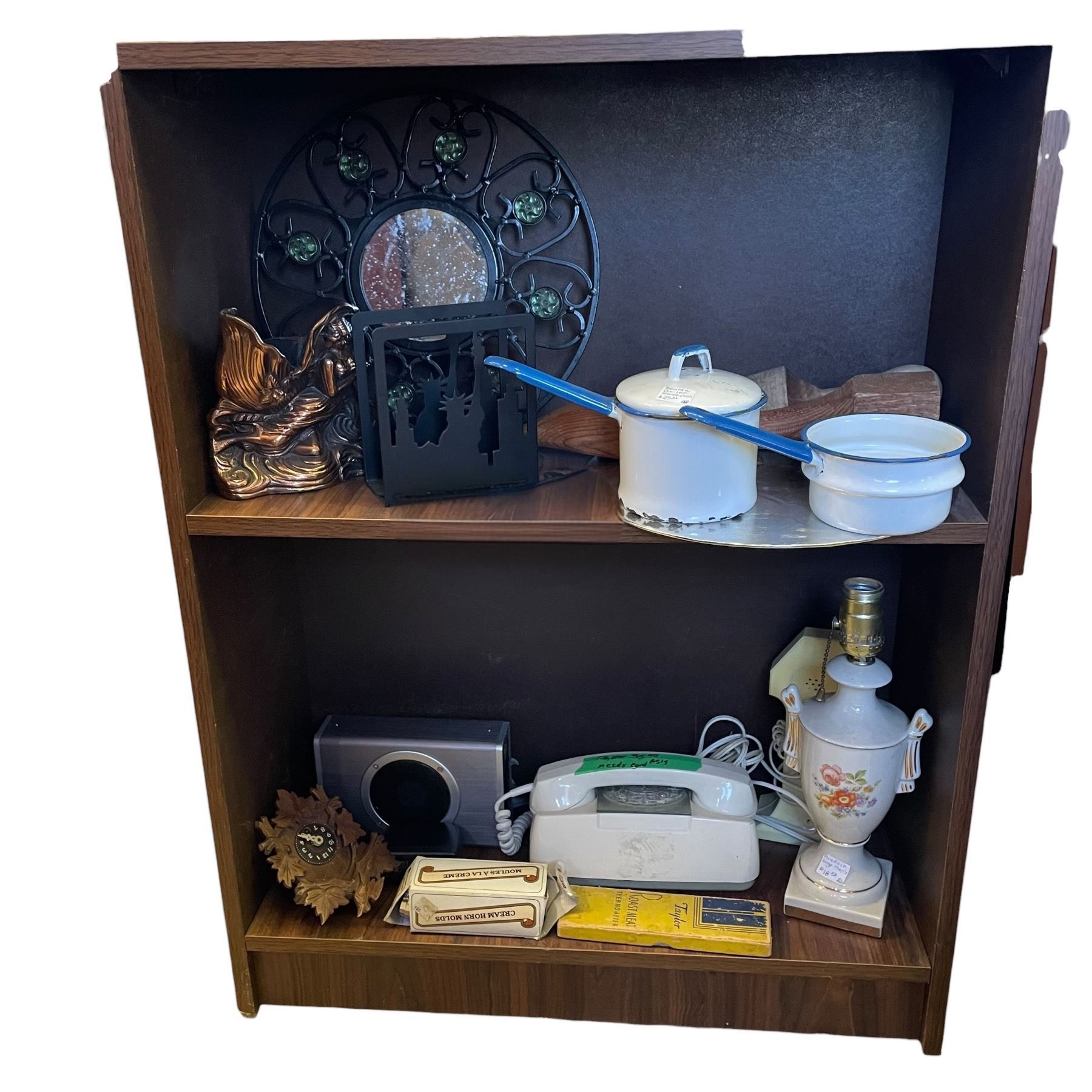 Book Shelf with 2 Shelves of Vintage Kitchenware & Mini Cuckoo Clock (Shelf is 9" x 24" x 66" tall)