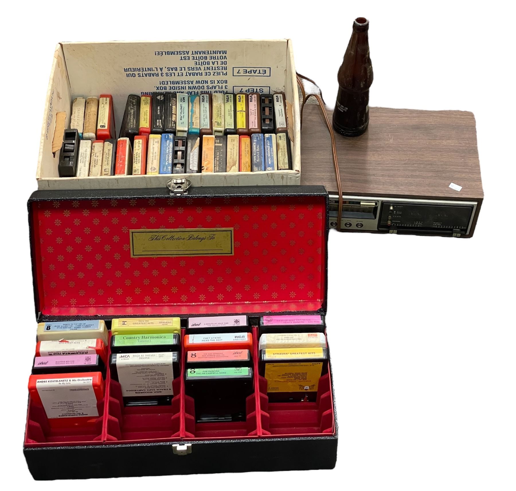 Box Full Of Assorted 8 Tracks With 8 Track Player & Vintage Ginger Beer Bottle