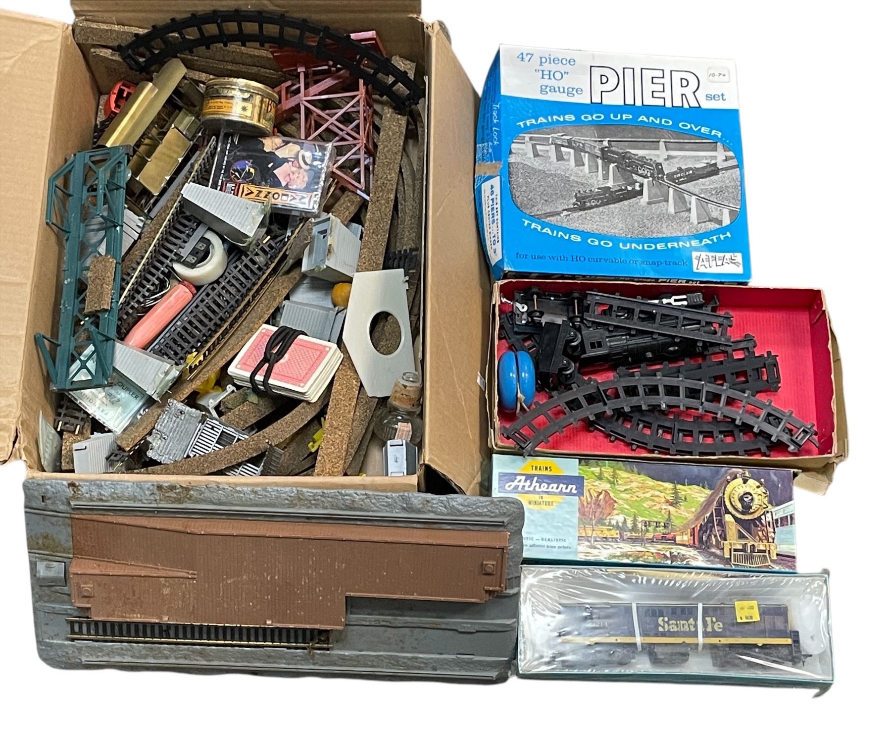Box Full Of Assorted Model Train Equipment, Tracks, Carts, Etc..