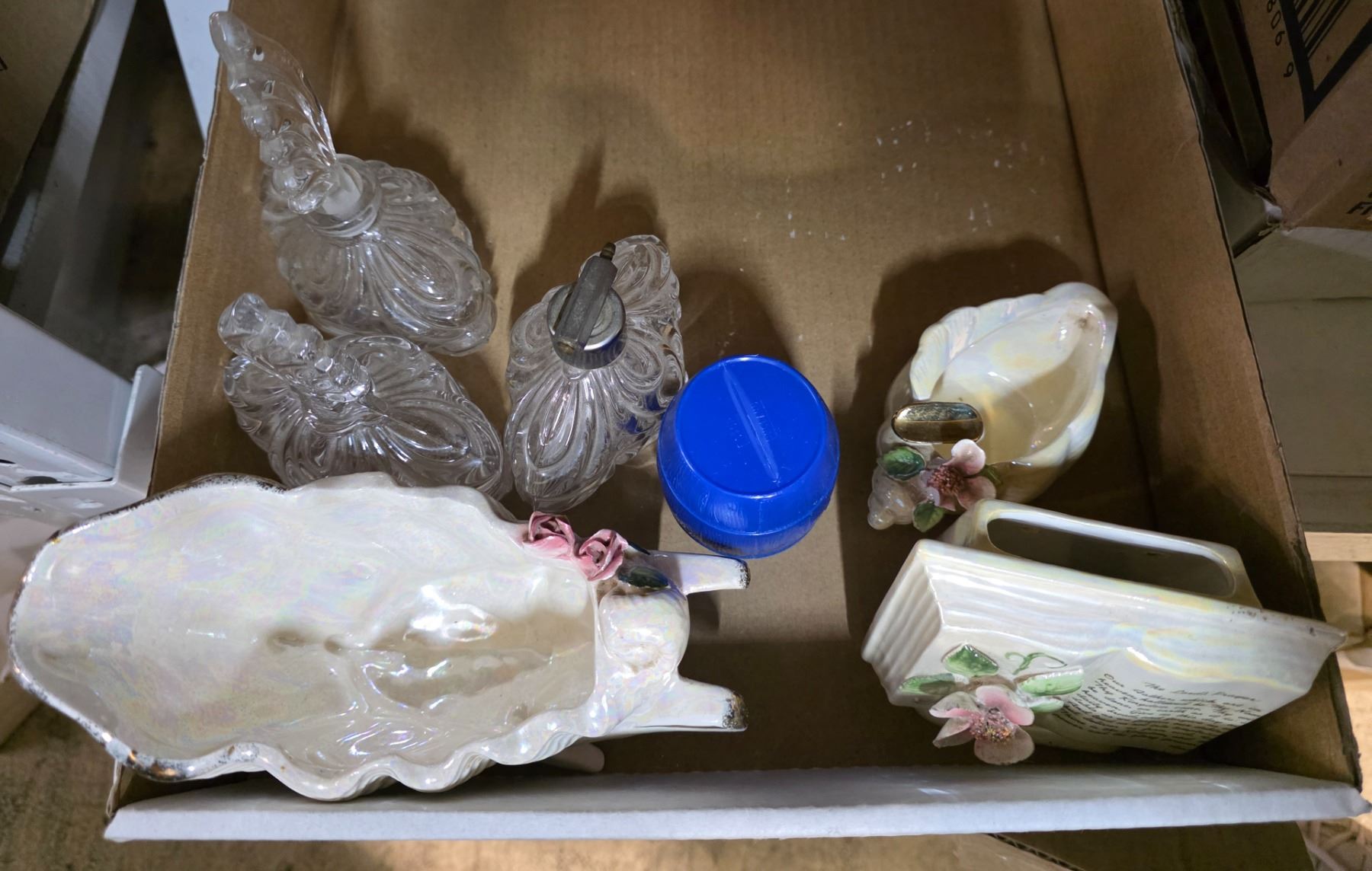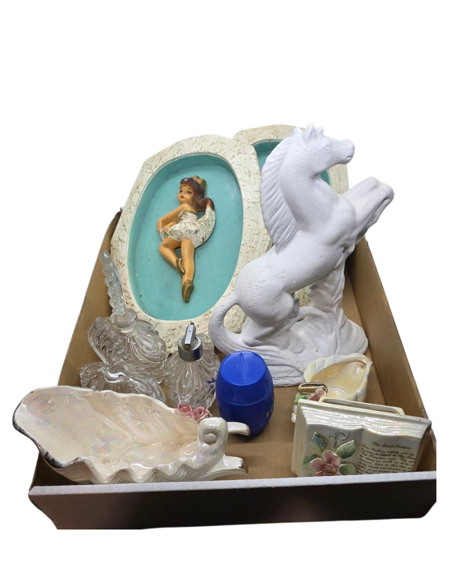 Box Lot of Chalkware Wall Art, Glass Perfume Bottles & Porcelain Vases