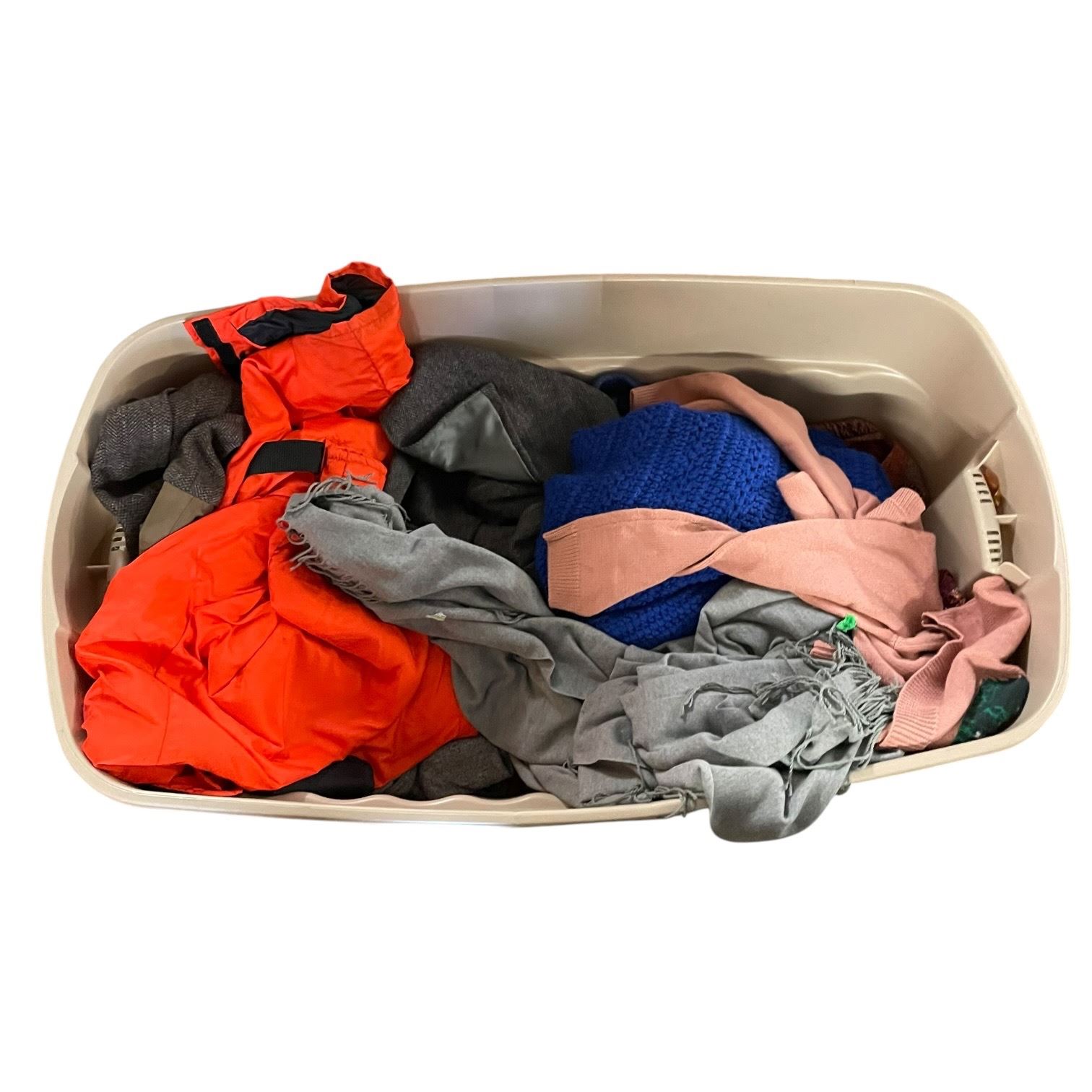 Box Lot of Clothing: Blankets, Fireman's Jacket, Deerskin and More