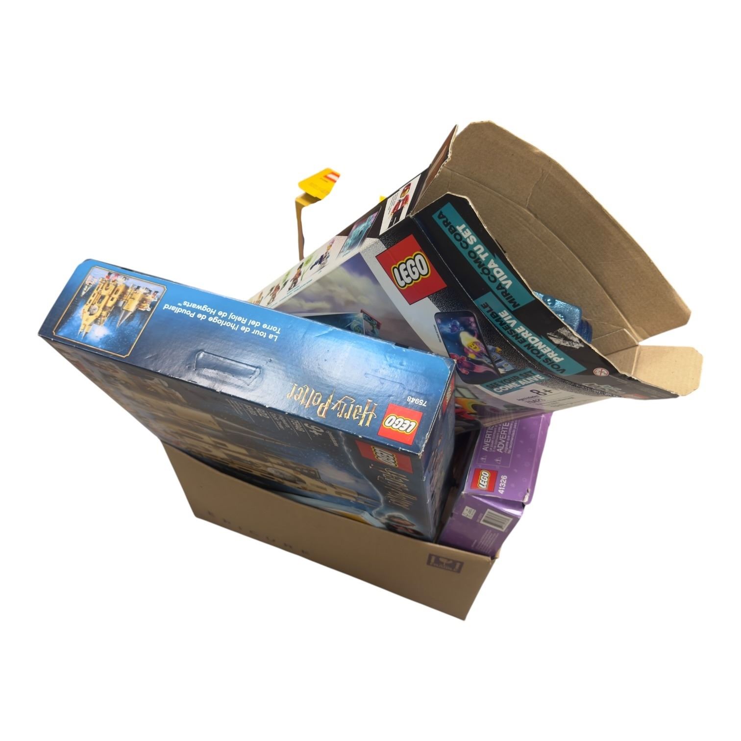 Lot includes a collection of LEGO items with opened boxes and assembled models spanning assorted genres. Contents vary with mixed themes as pictured. Item is as pictured.