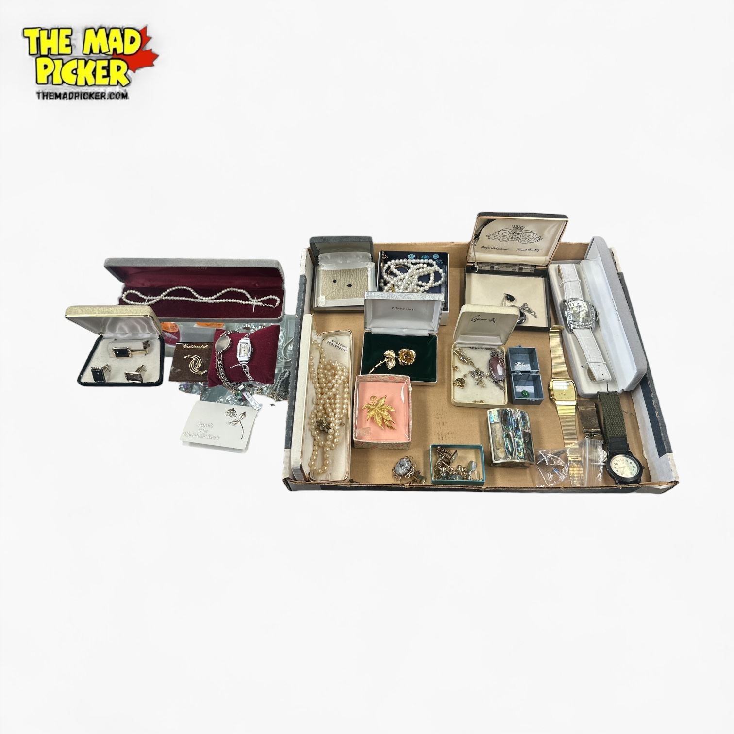 Box Lot of Vintage Fashion Jewelry and Watches (Faux Pearls, Black Alaska Diamond Necklace & Earrings Set, Brooches, Cufflinks and more)