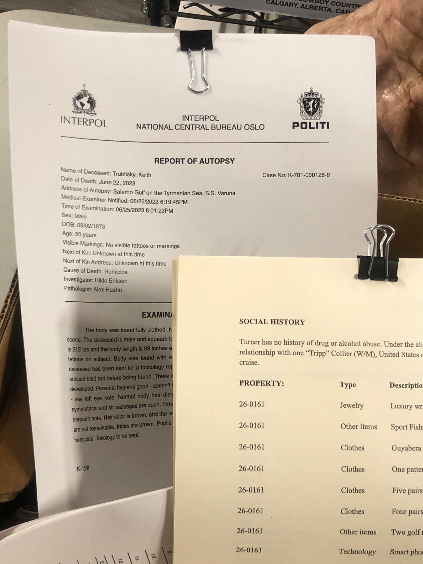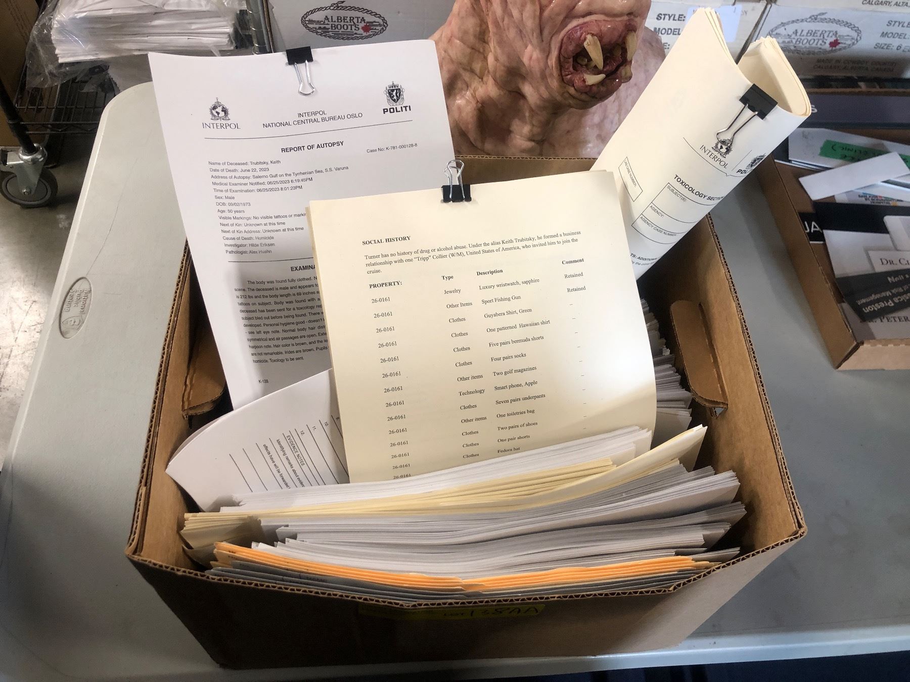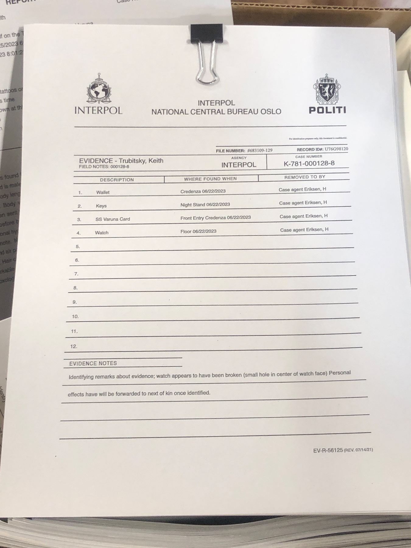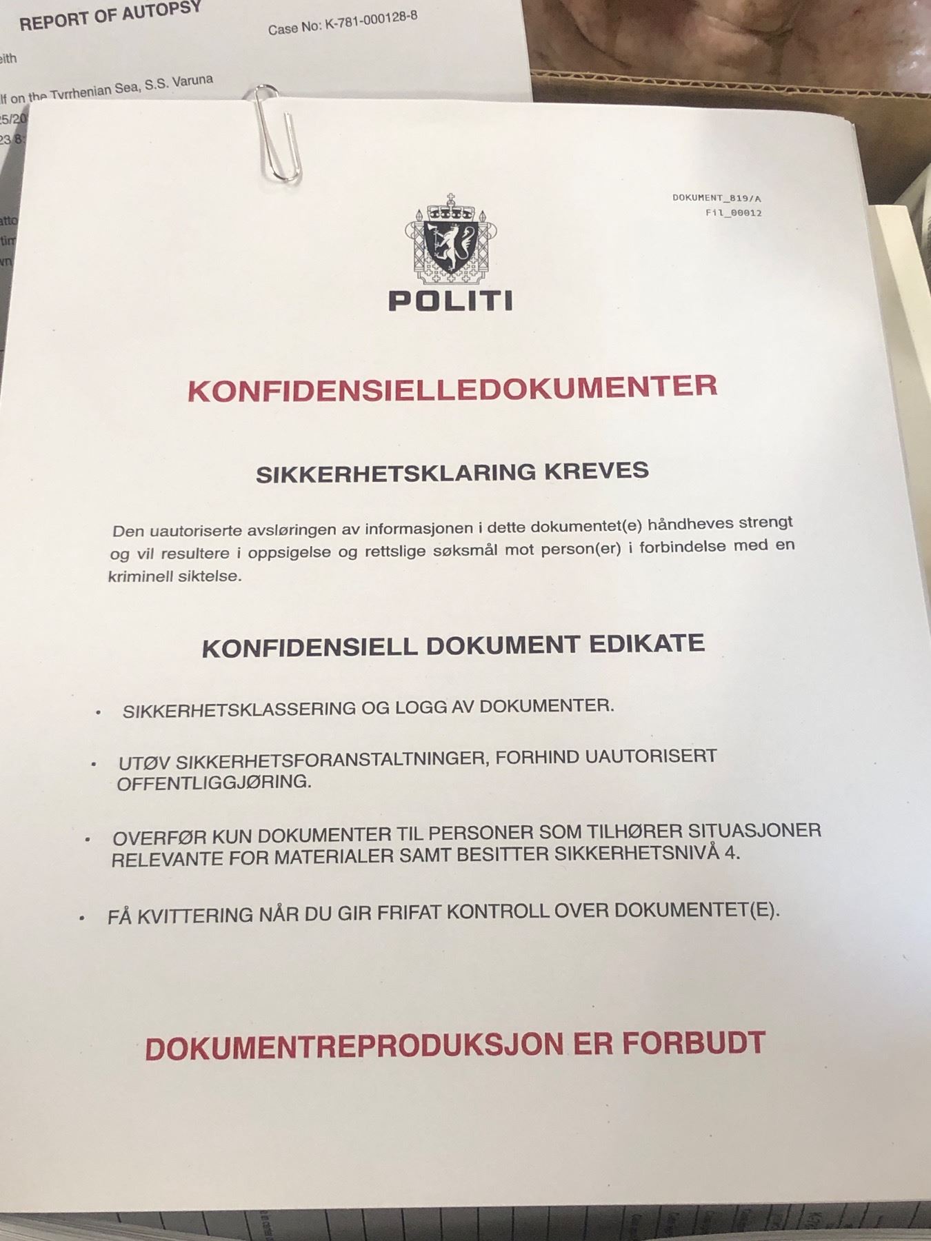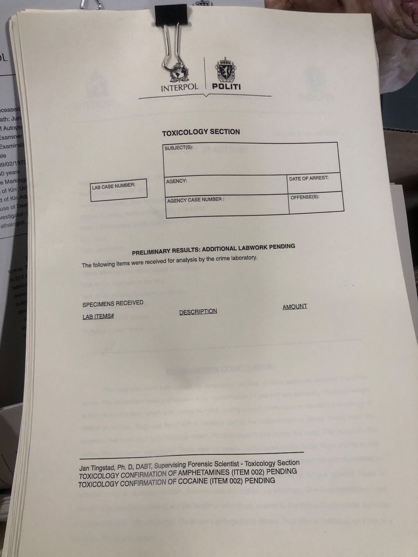Box full of Interpol Politi paperwork - Evidence forms, Autopsy reports, Toxicology Section forms etc.