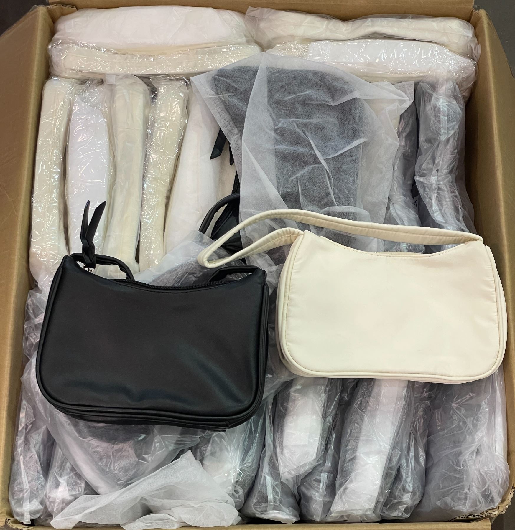 Box full of assorted small nylon black & beige shoulder purses (approx 50 pcs)