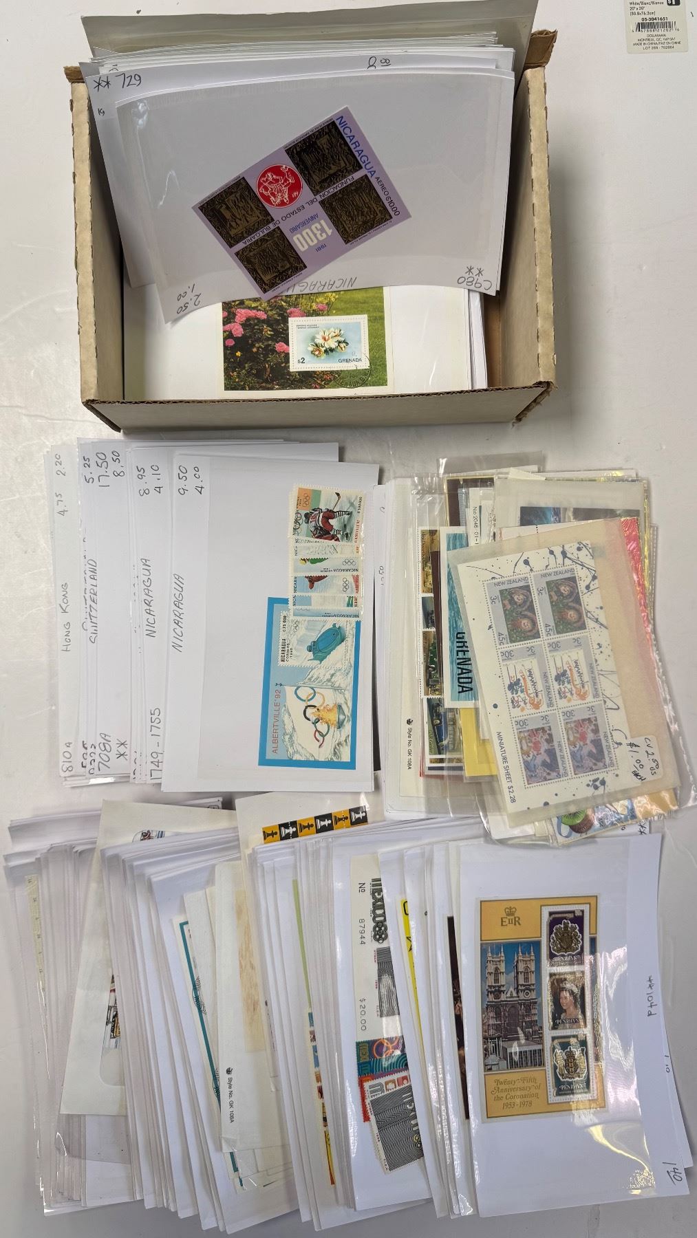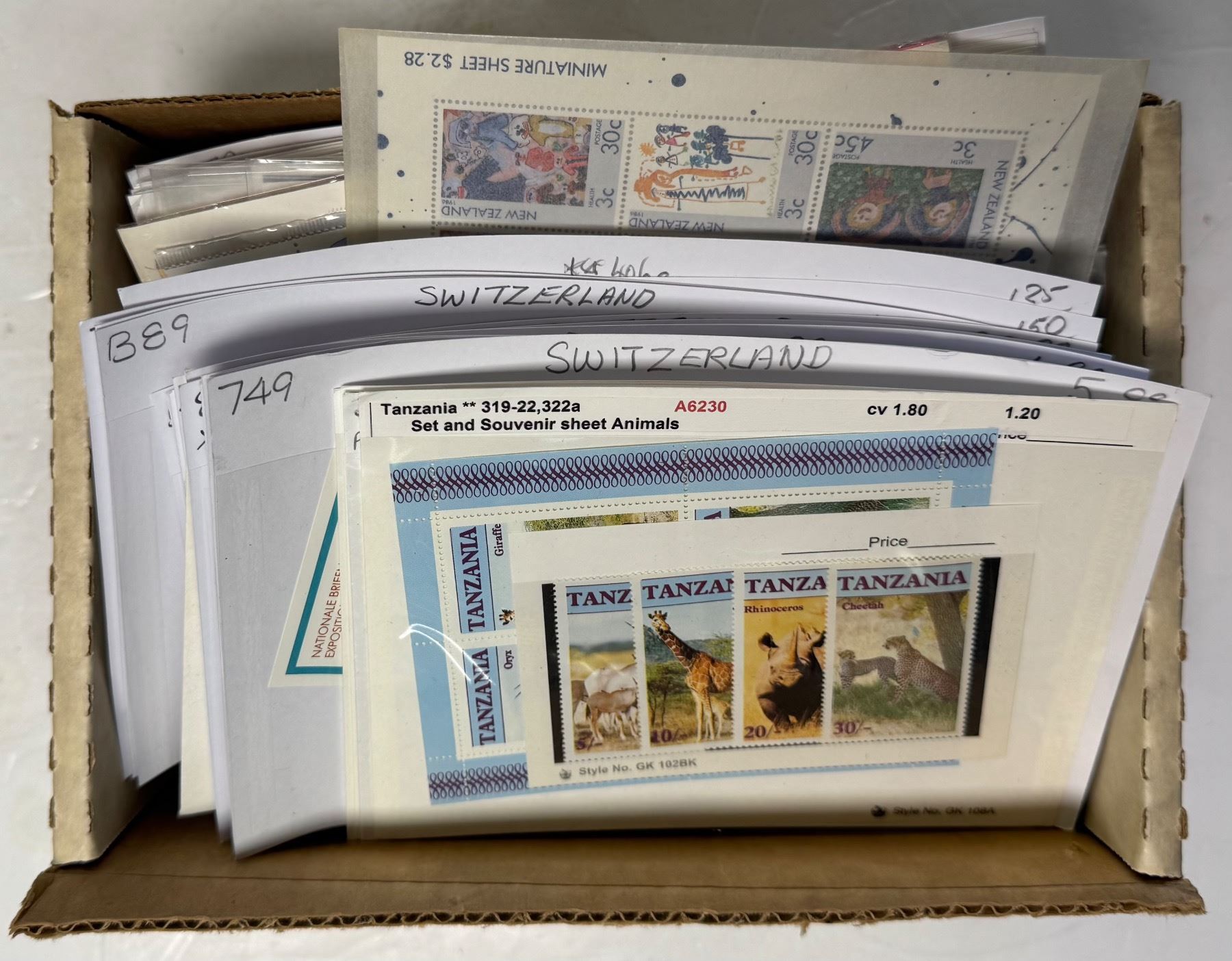 Box of 150 Carded Mint Blocks, Bullseye and Used World Stamps * Tanzania, New Zealand, Great Britian, Switzerland, Burkina Faso and More. Approximate Count.