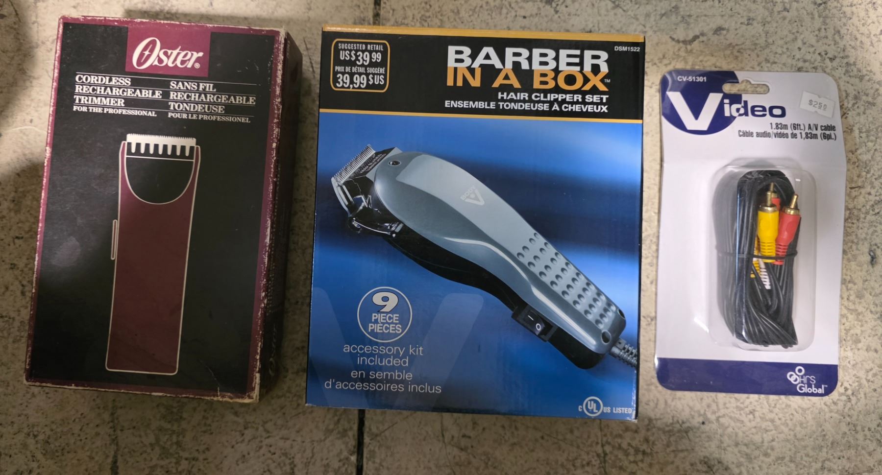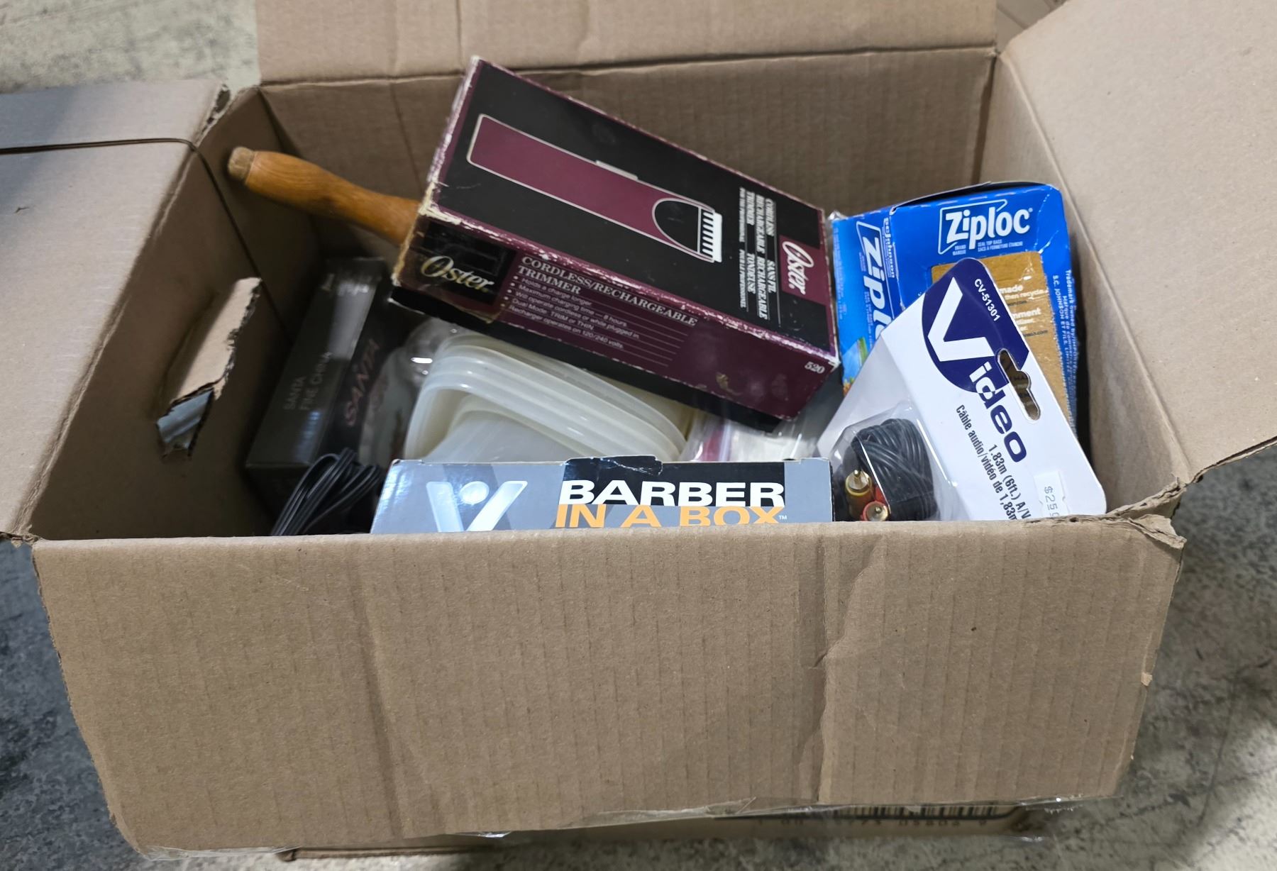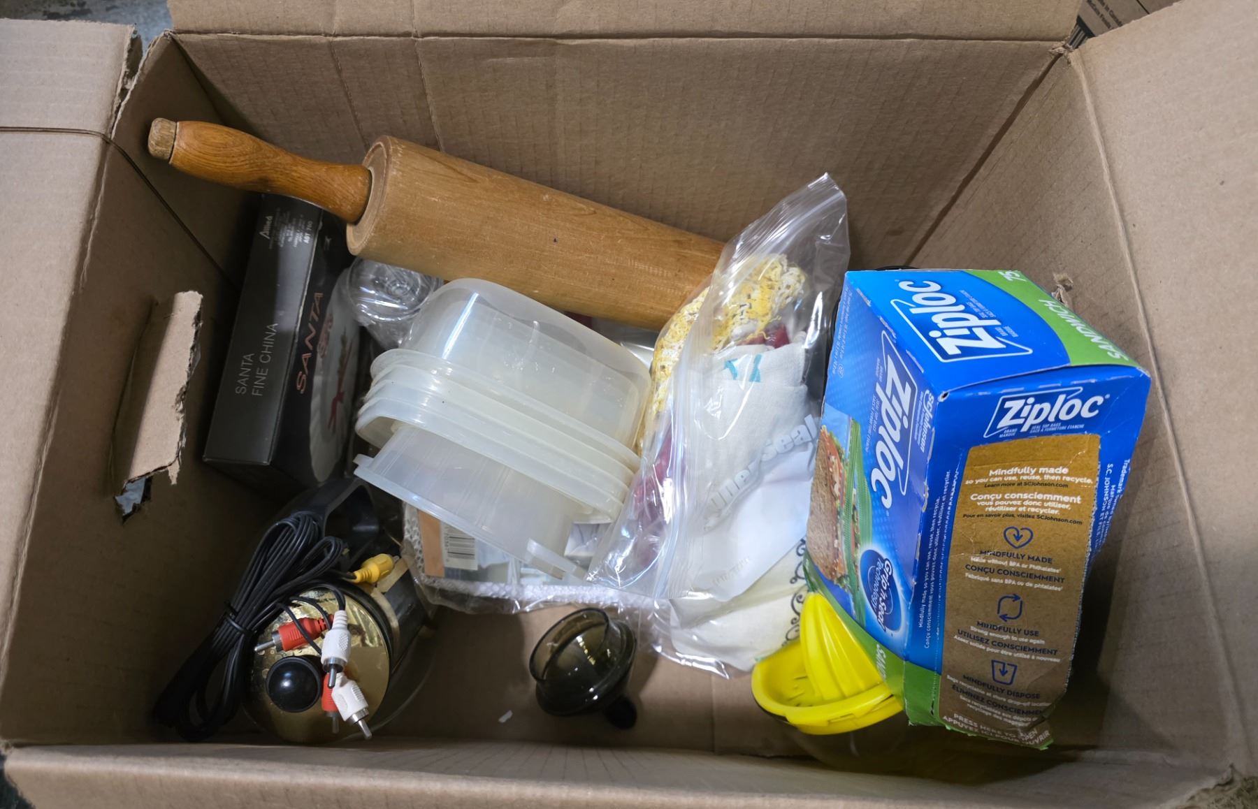 Box of Assorted Household Goods - Vintage Razor, Wood Rolling Pin, New Electronics Cables, and more
