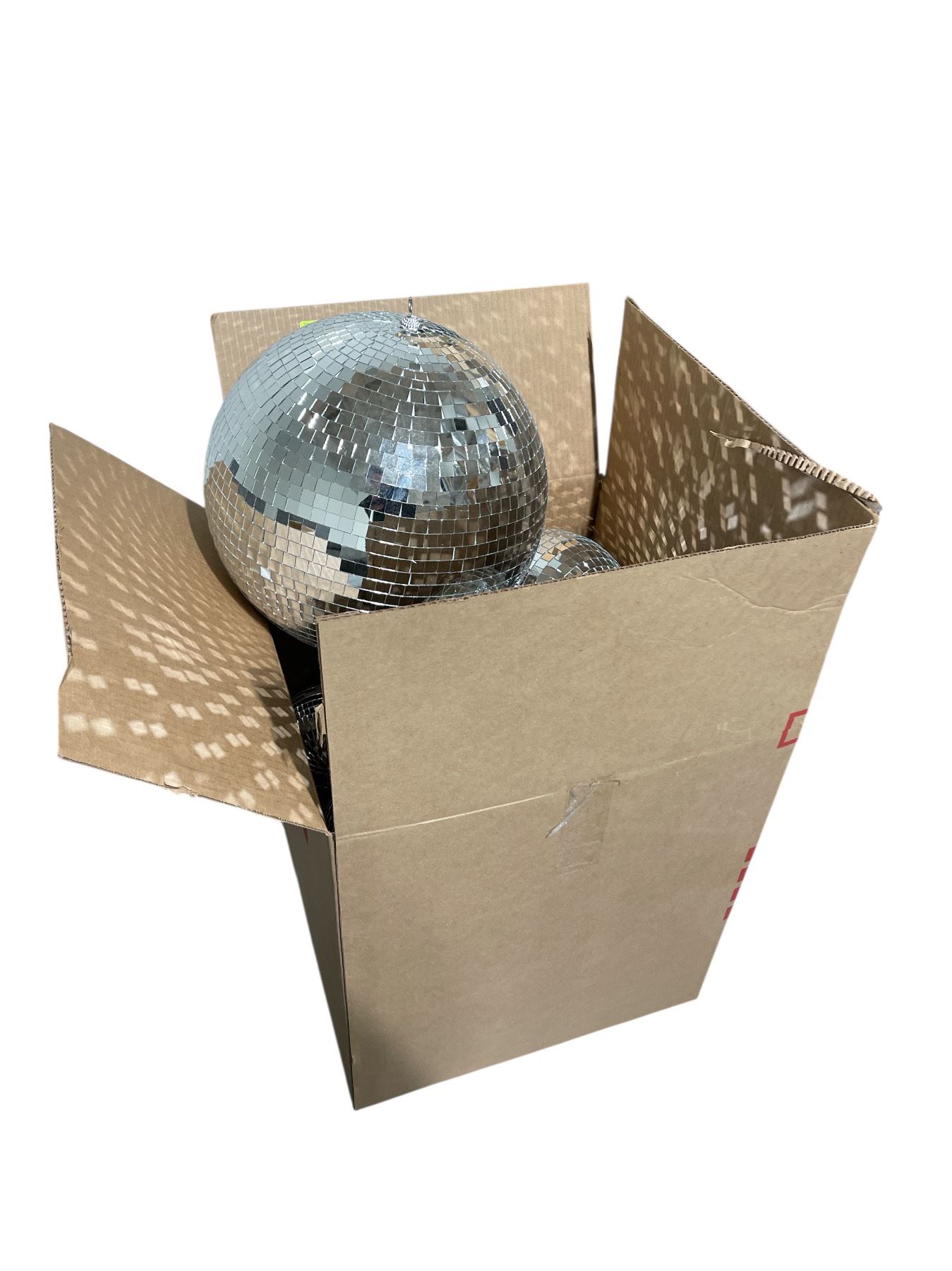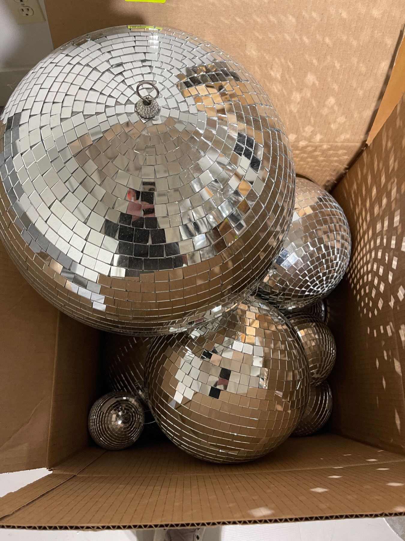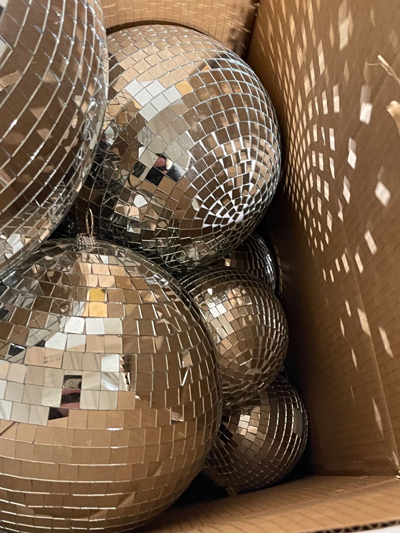 Box of Assorted Mirrored Disco Balls (smallest is 7" diameter and largest is 16" diameter )