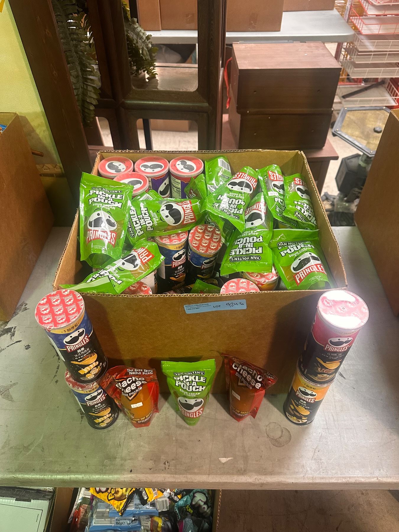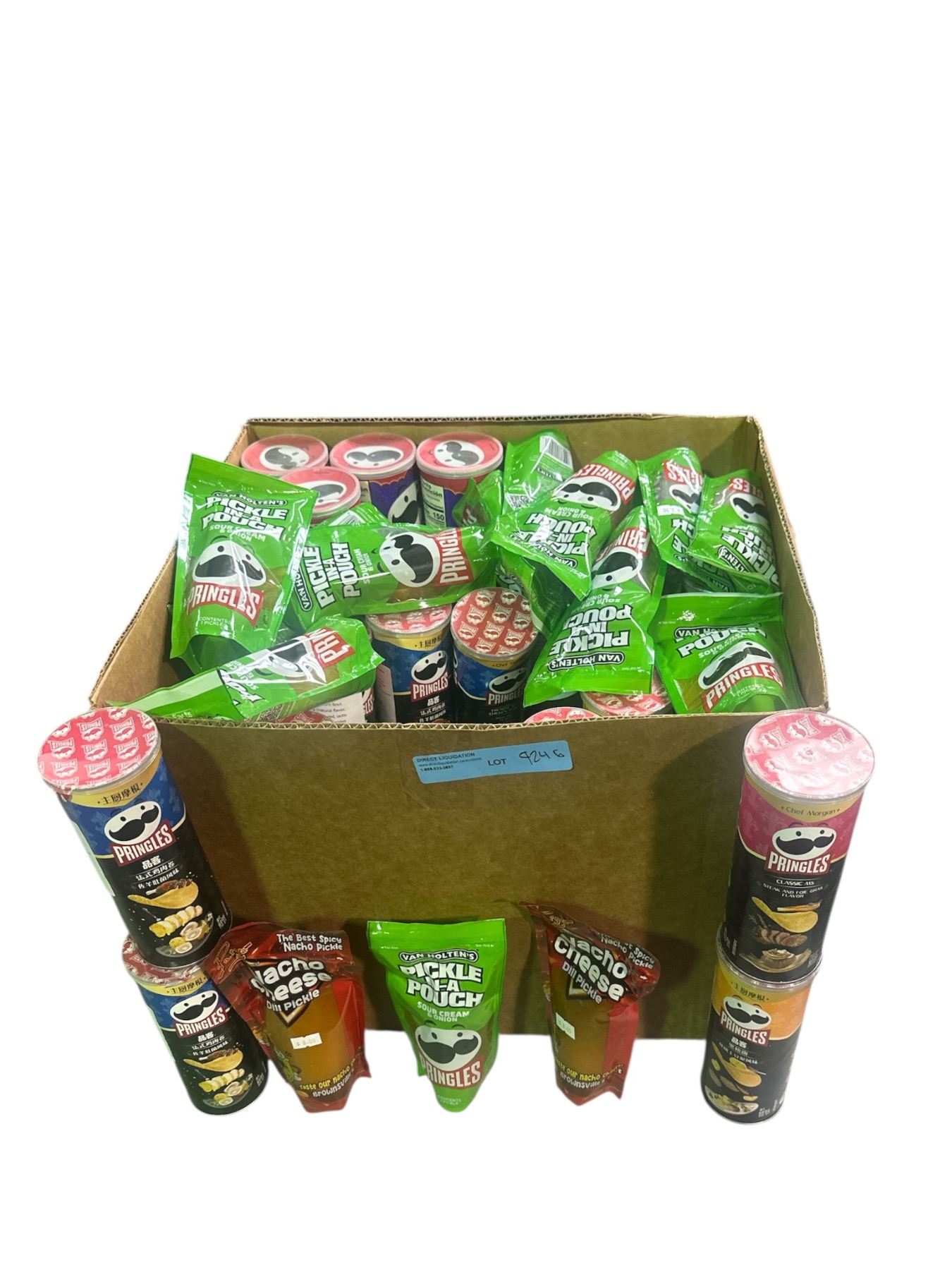 Box of Misc - Pickle in a Pouch - Pringle. Nacho Cheese & Pringles Enchilada Chips