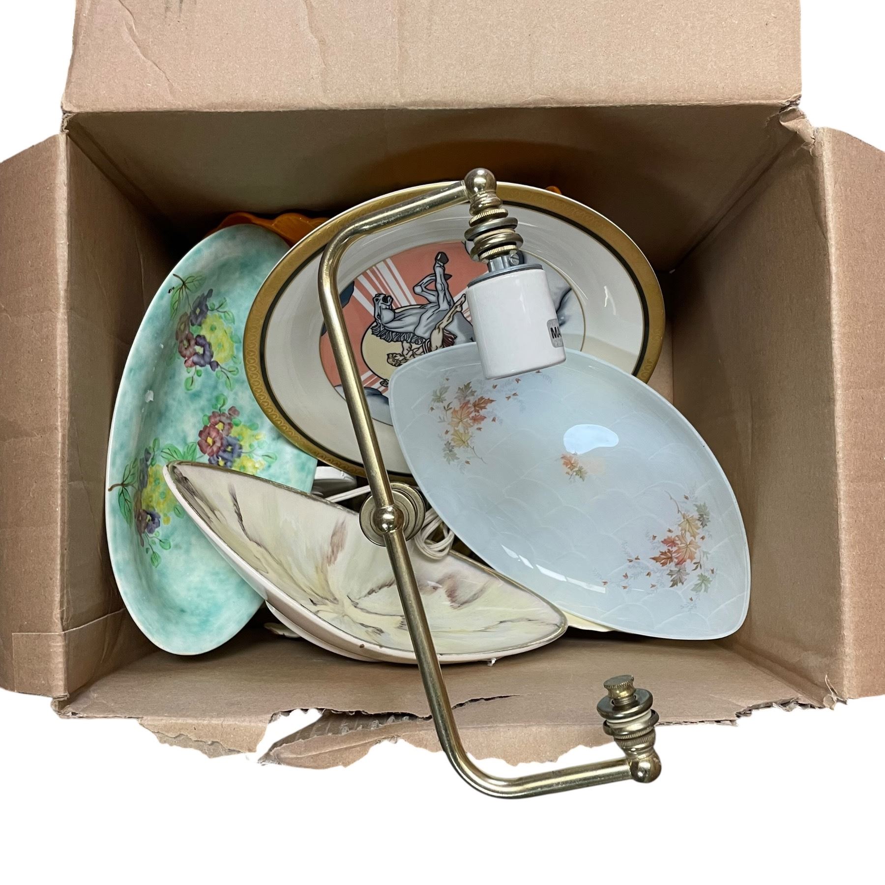 Box of Misc. Plates and a Lamp