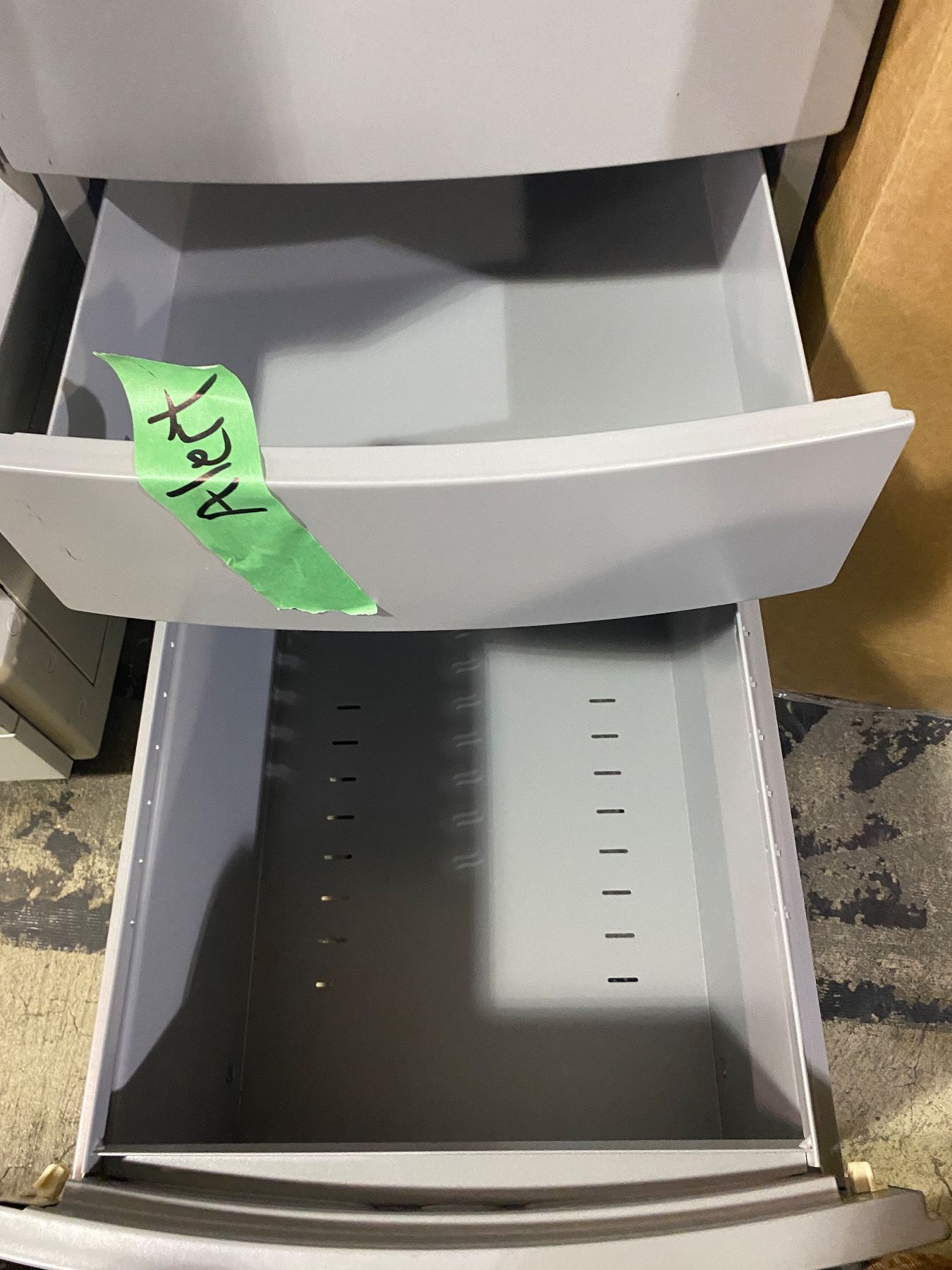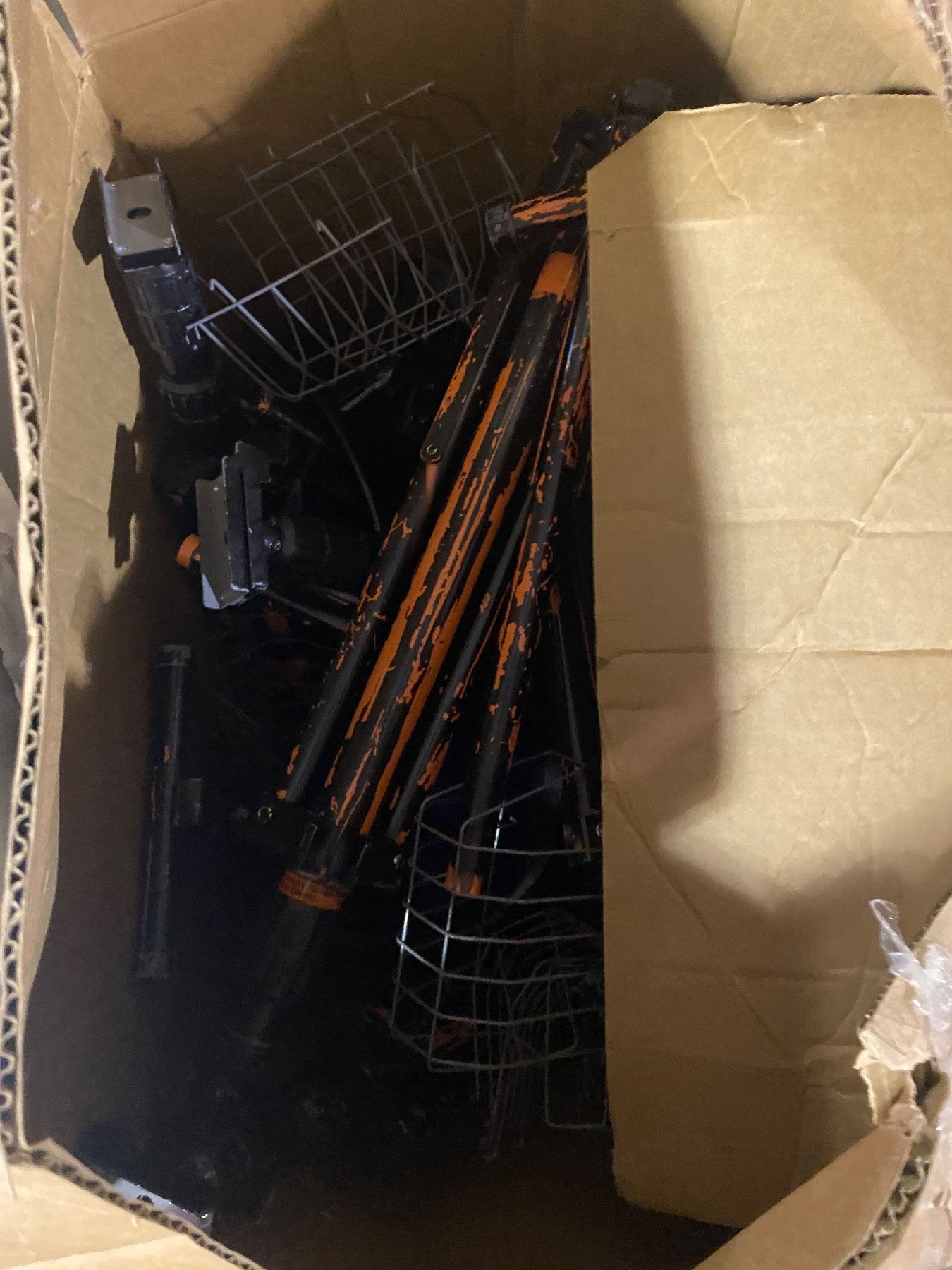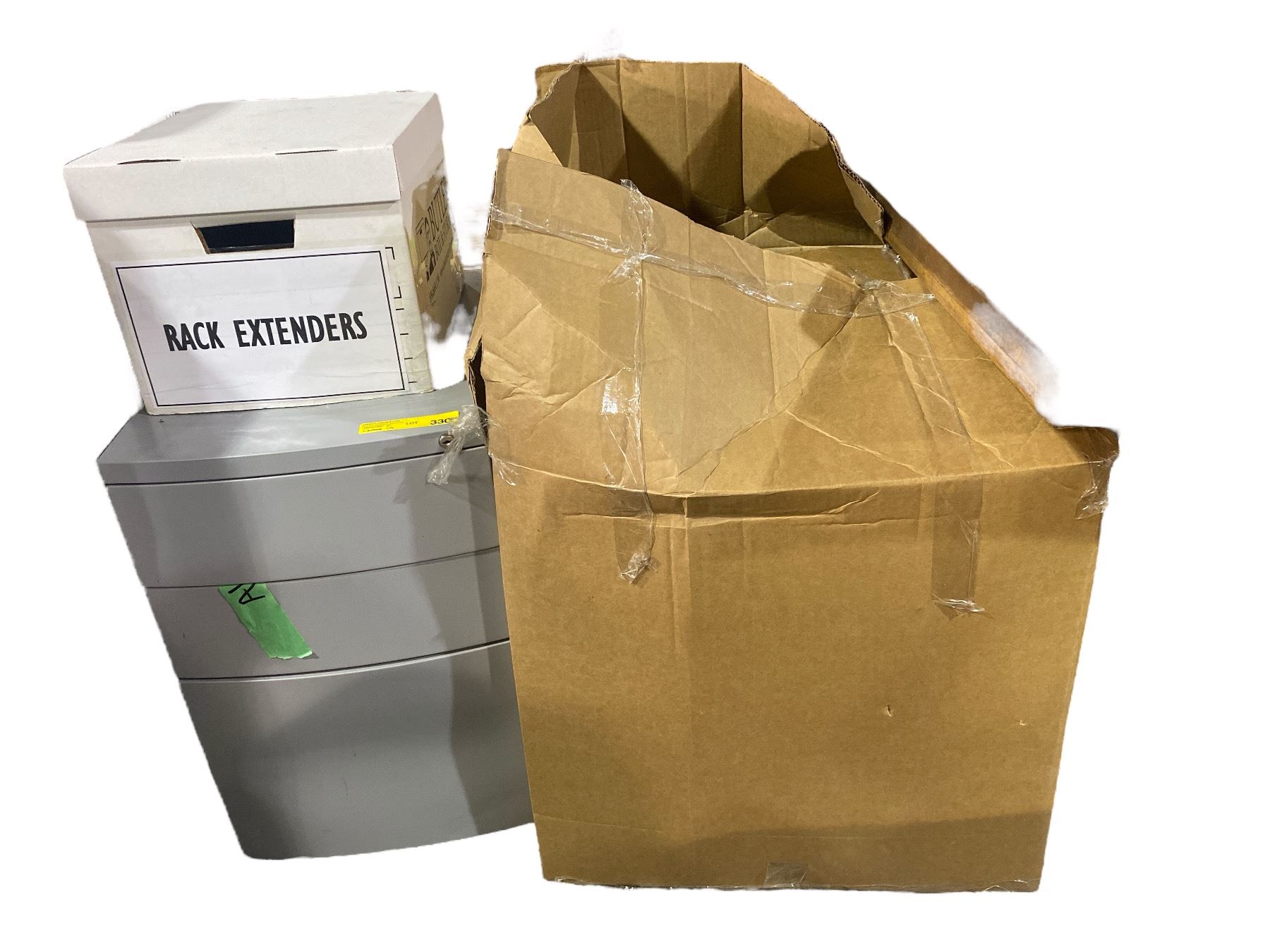 Box of Tiki Torches, Box of Rack Extenders, & Metal Desk Side File No key.