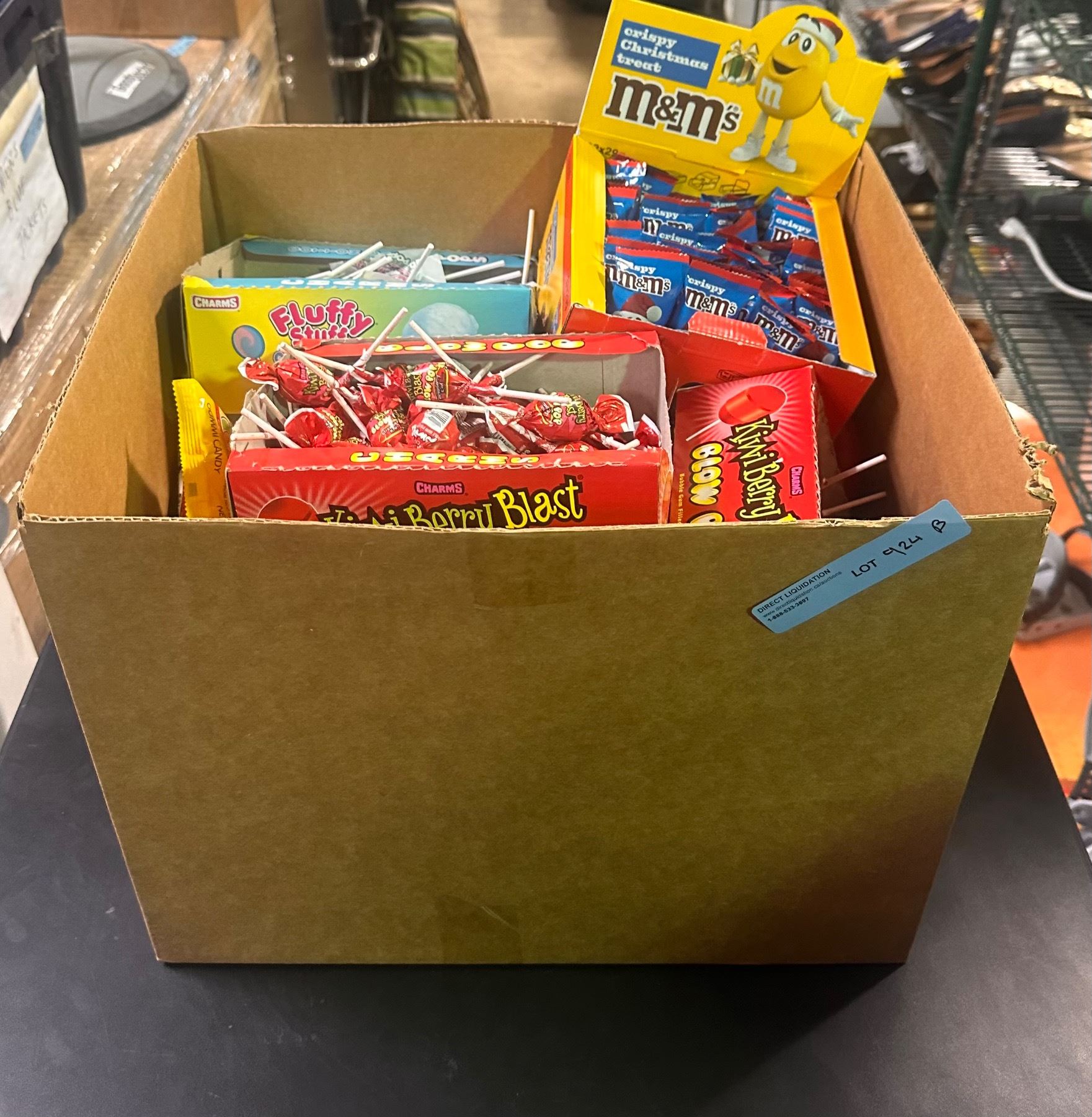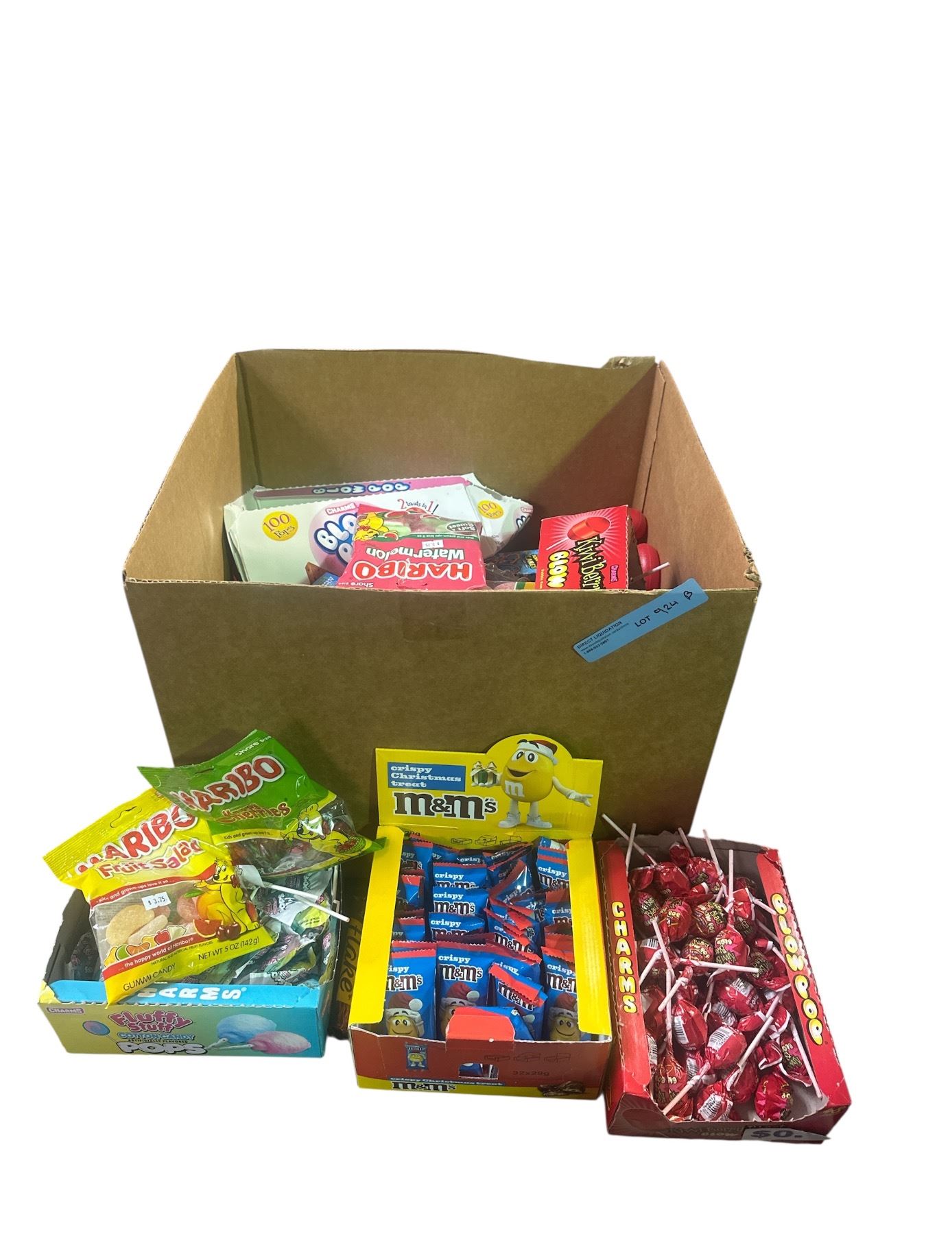 Box of Various Candy/Chocolate - Fluffy Cotton Candy POPs, M&M's, Haribo, Etc.