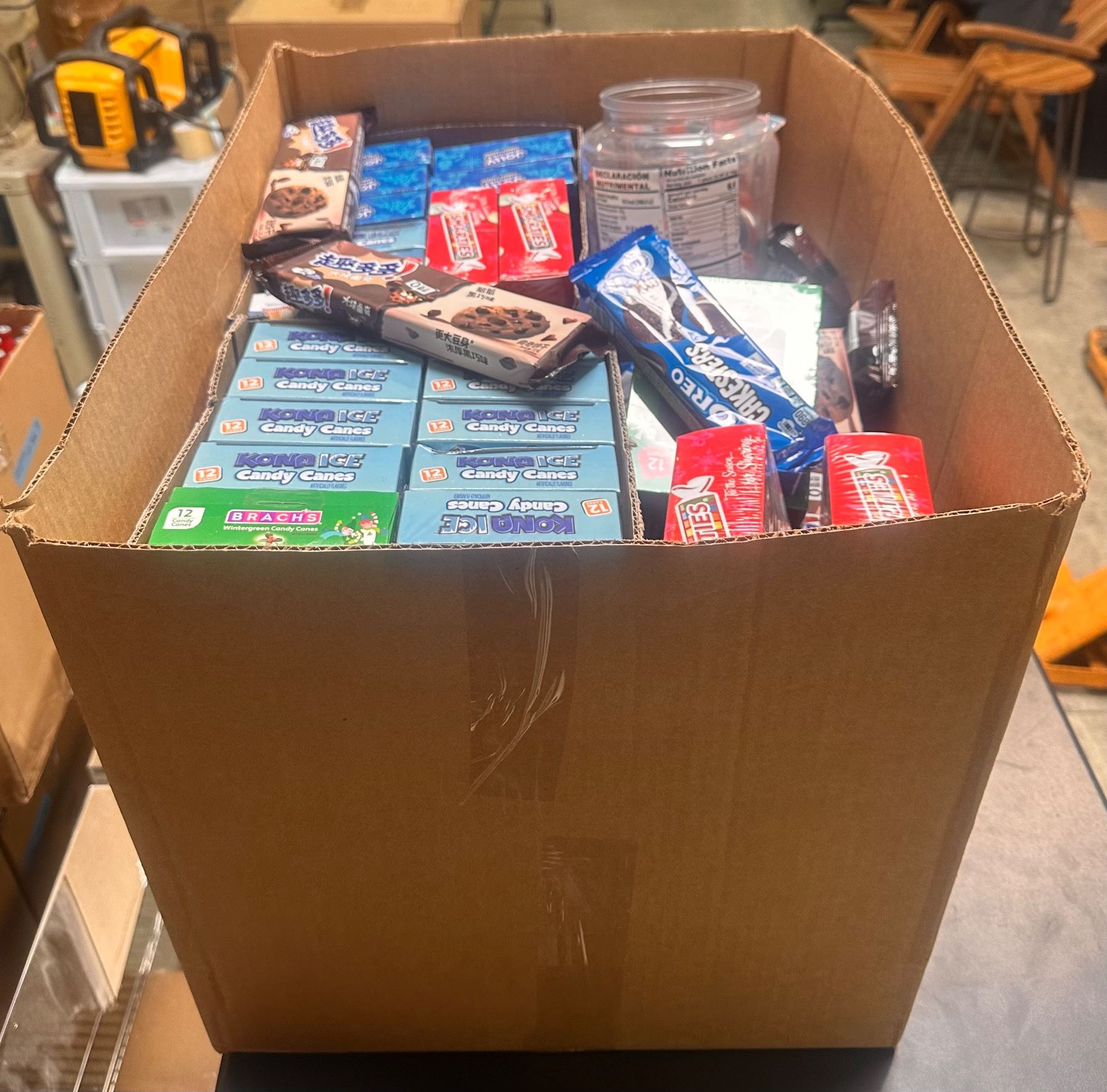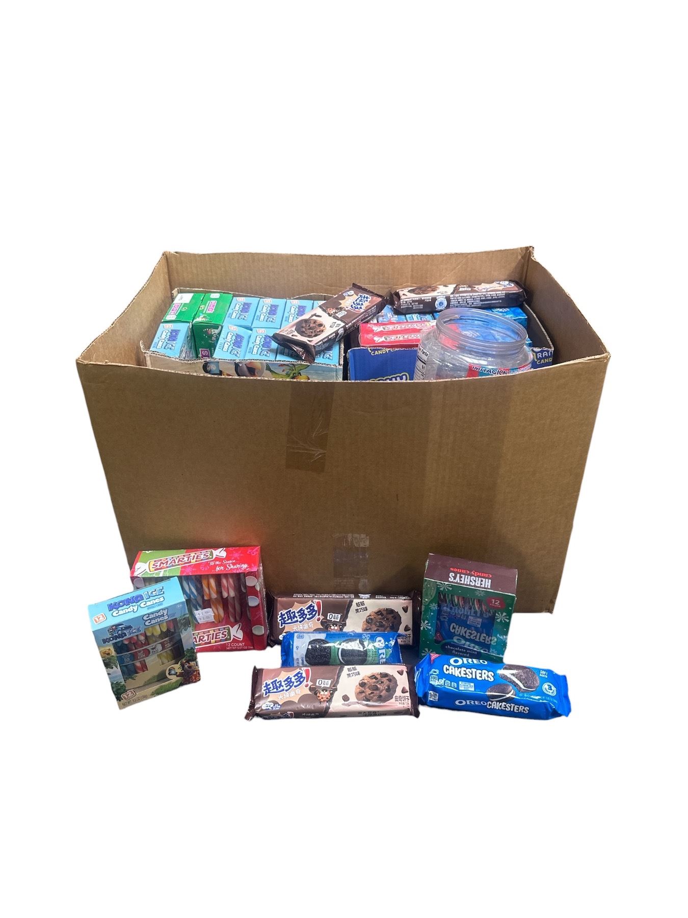Box of Various Candy/Chocolate - Smarties Candy, Kona Ice Candy Cane, Chocolate Cookies, Hershey's Candy Cane, Etc.