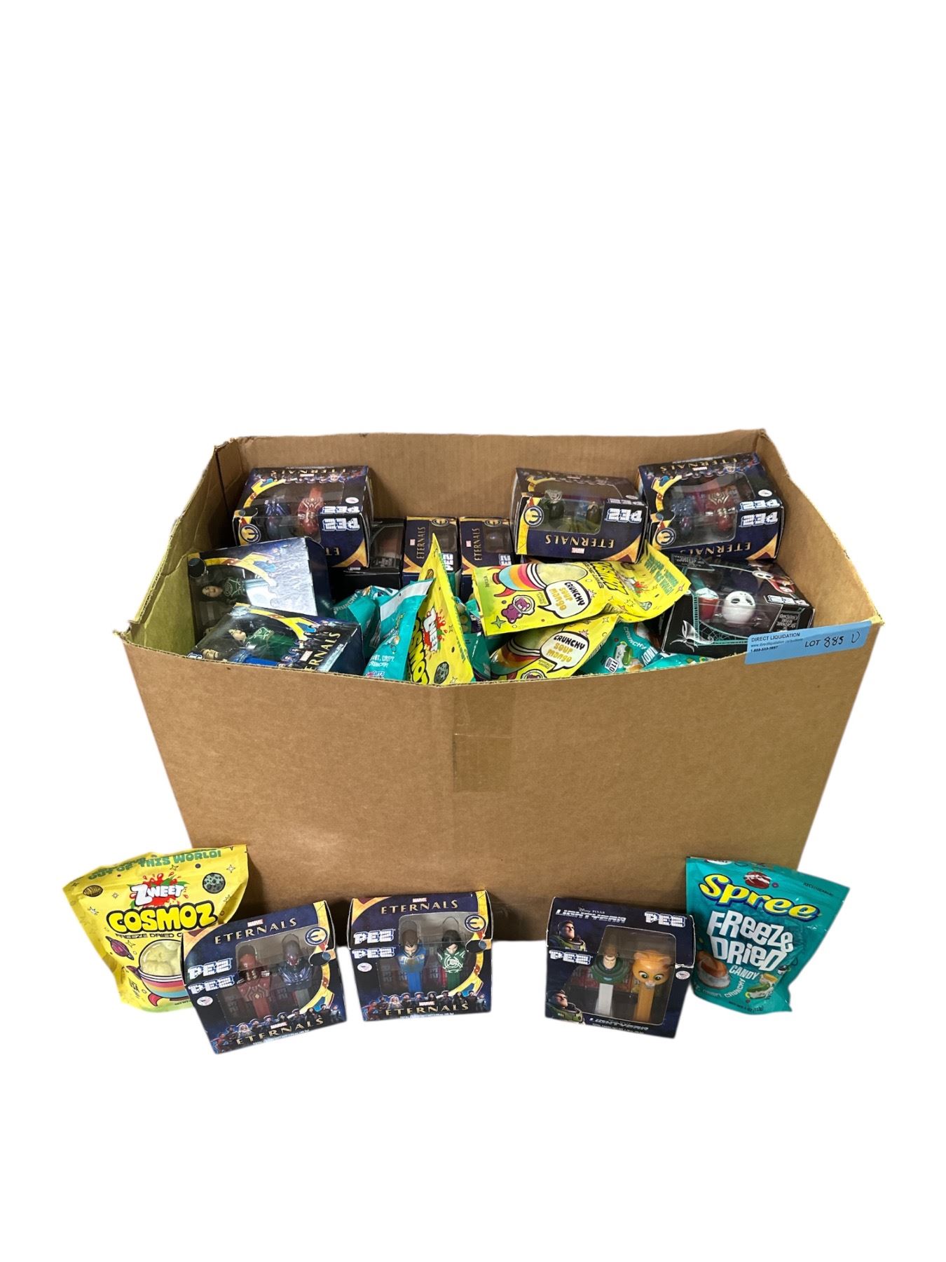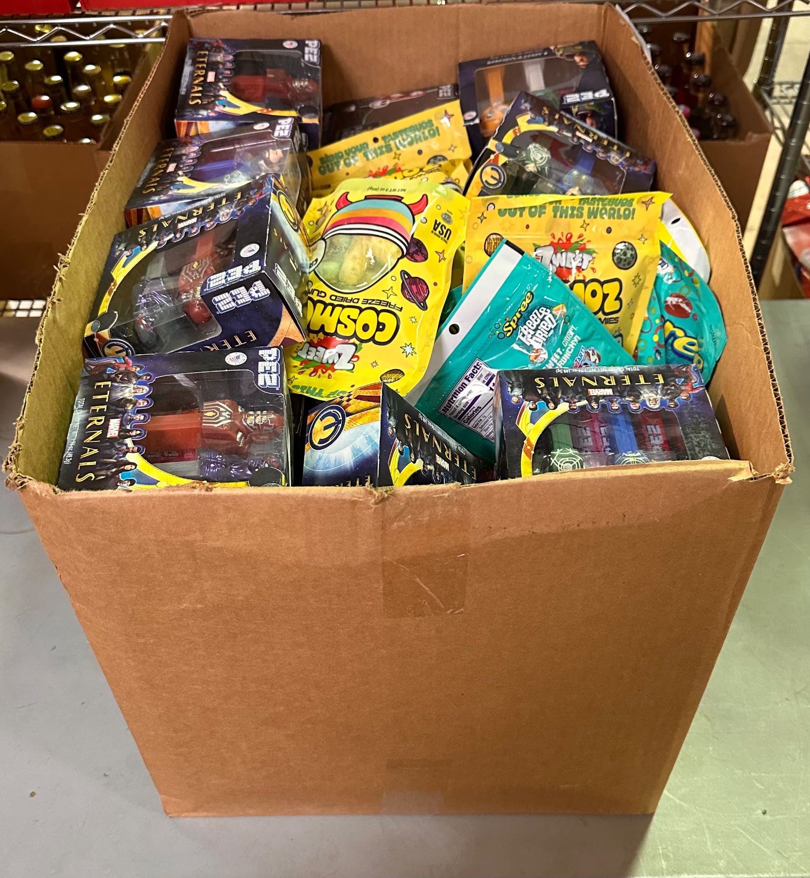 Box of Various Candy - Eternals PEZ, Cosmoz Dried Gummies, Spree Freeze Dried Candy, Etc.