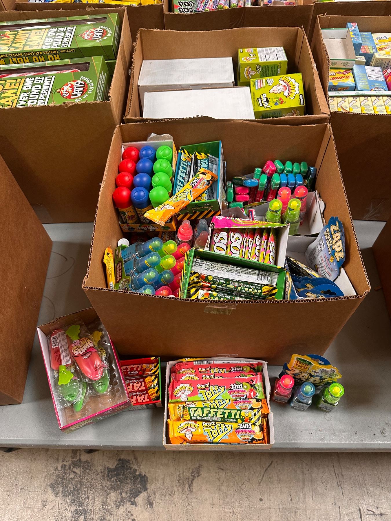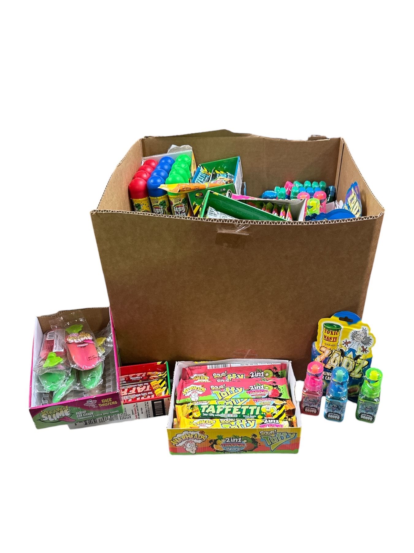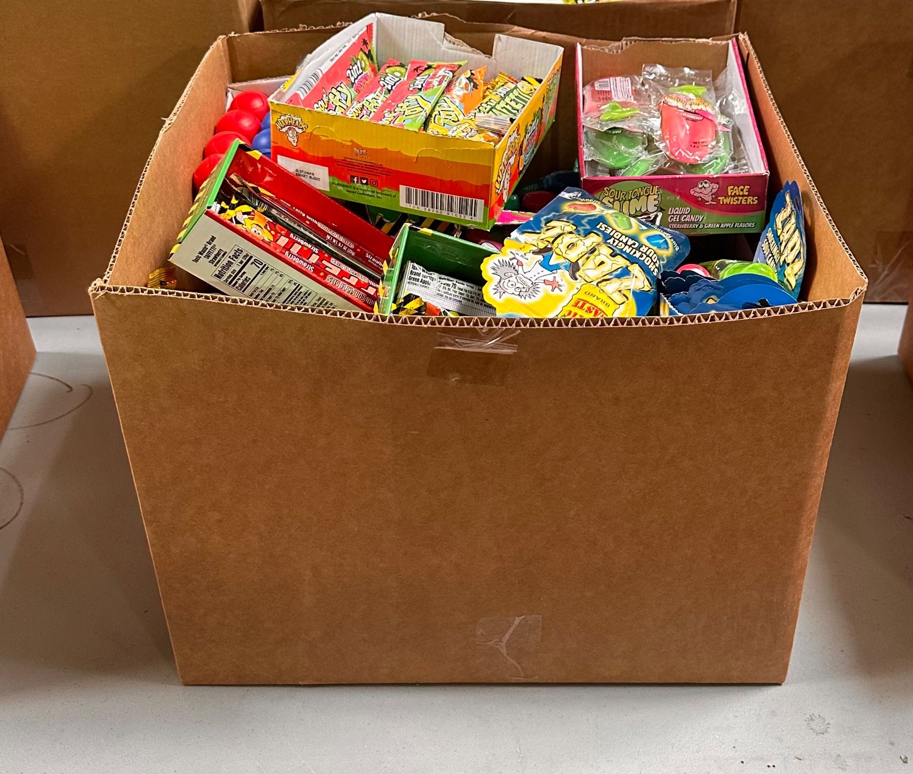 Box of Various Candy - WarHeads Sour Taffy, Sour Tongue, Toxic Waste Zapz, Etc.