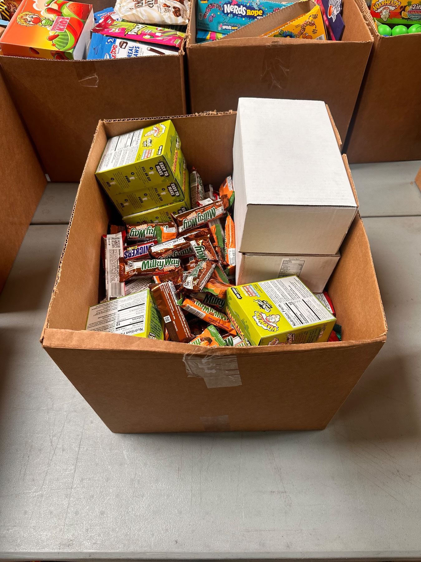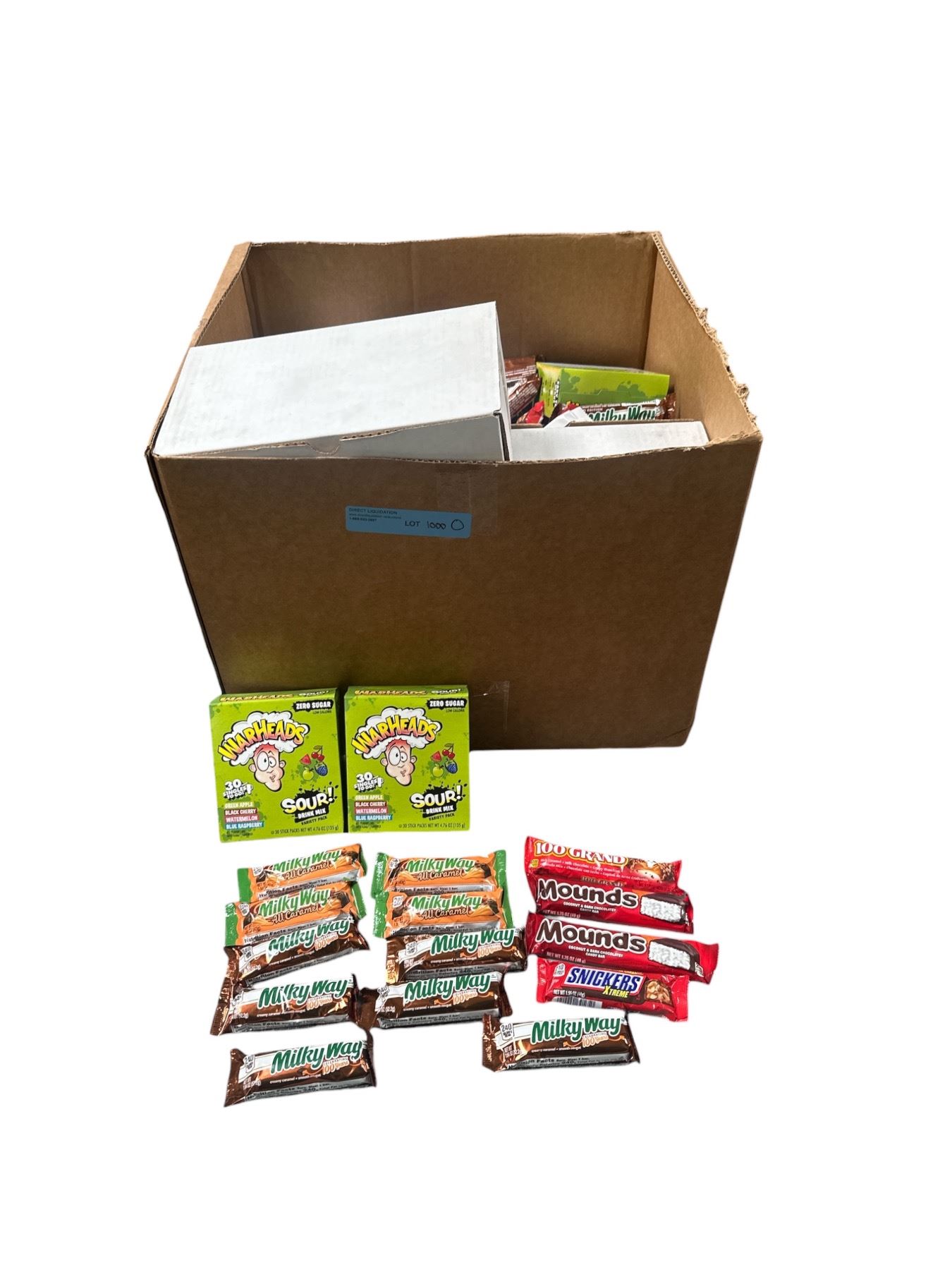 Box of Various Candy - Warheads Sour Drink Mix, Candy Brains, Milky Way Chocolate Bar, Etc.