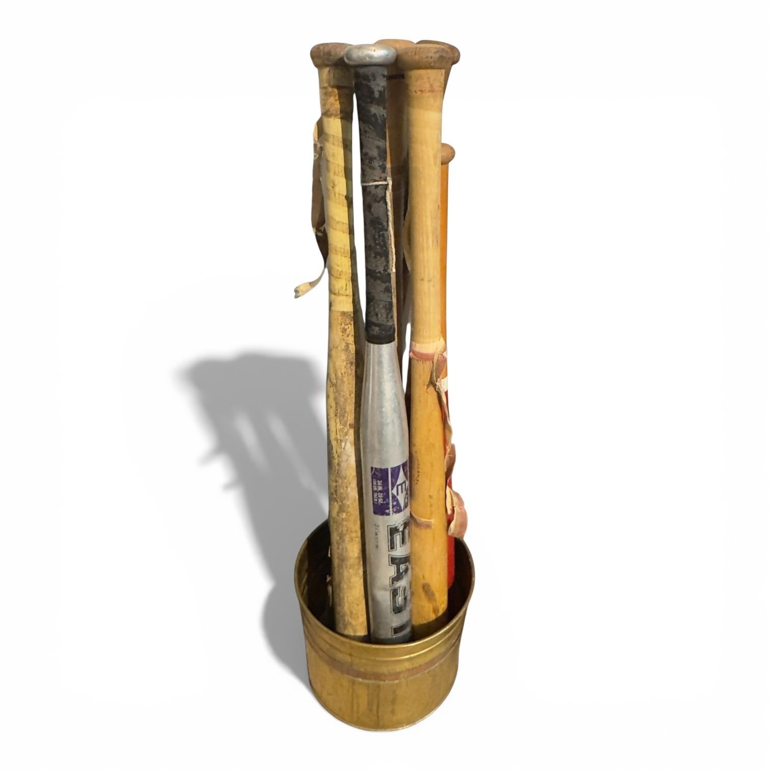 Brass bucket containing 5 vintage wooden baseball bats. Item is as pictured.
