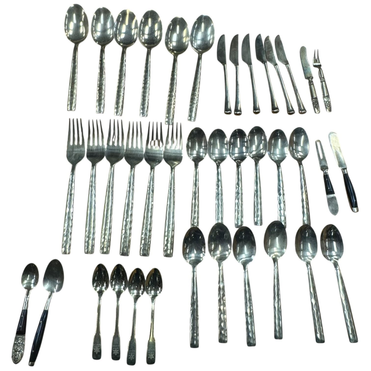 Brass flatware set including forks, spoons, knives designed for a service of 4. Set features brass construction and classic finish. Mostly the same pattern.