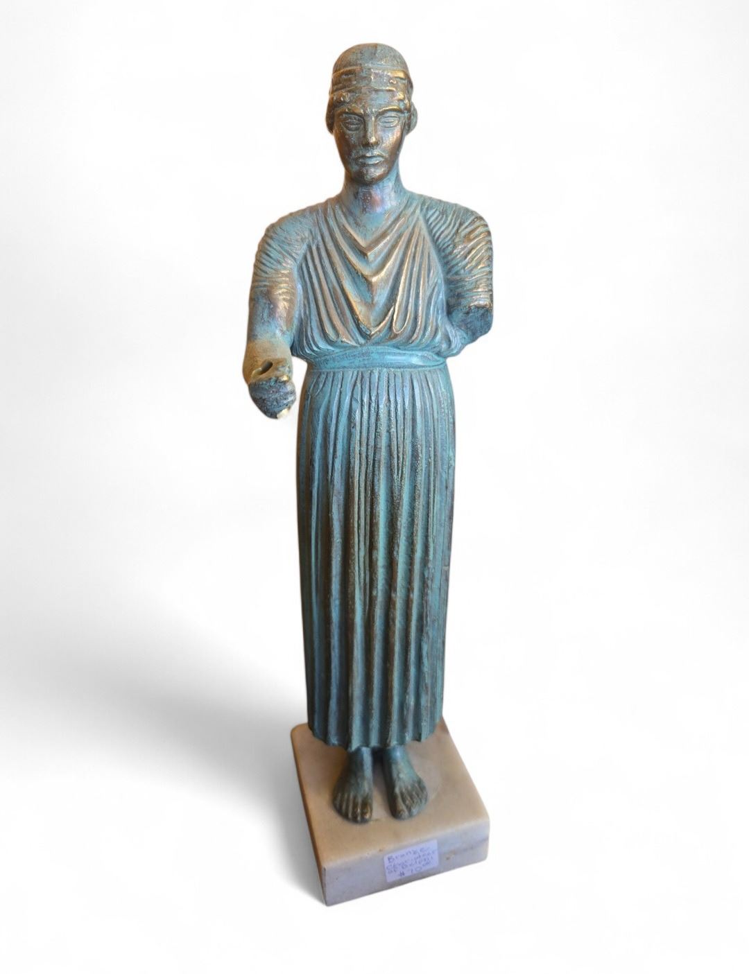 Bronze sculpture depicting the Charioteer of Delphi mounted on a marble base. The piece stands 14-Inch tall and is modeled after the ancient Greek statue discovered at the Delphi Archaeological Site, originally created around 470 BCE. Item is as pictured.