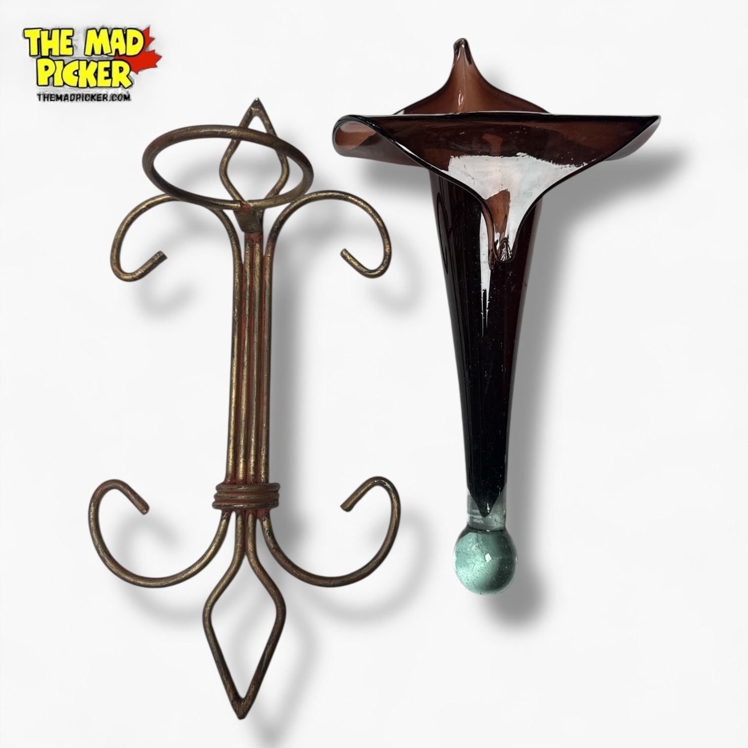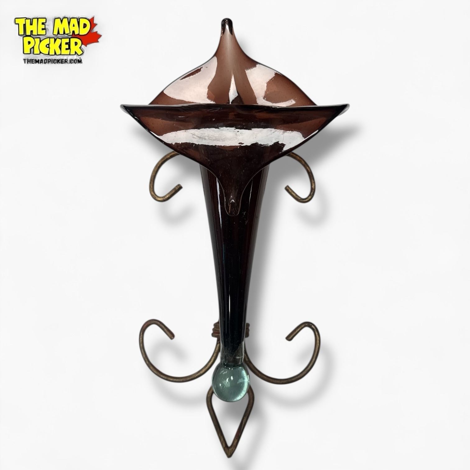 Brown Art Glass "Lily" Wall Vase with Holder - 17" tall