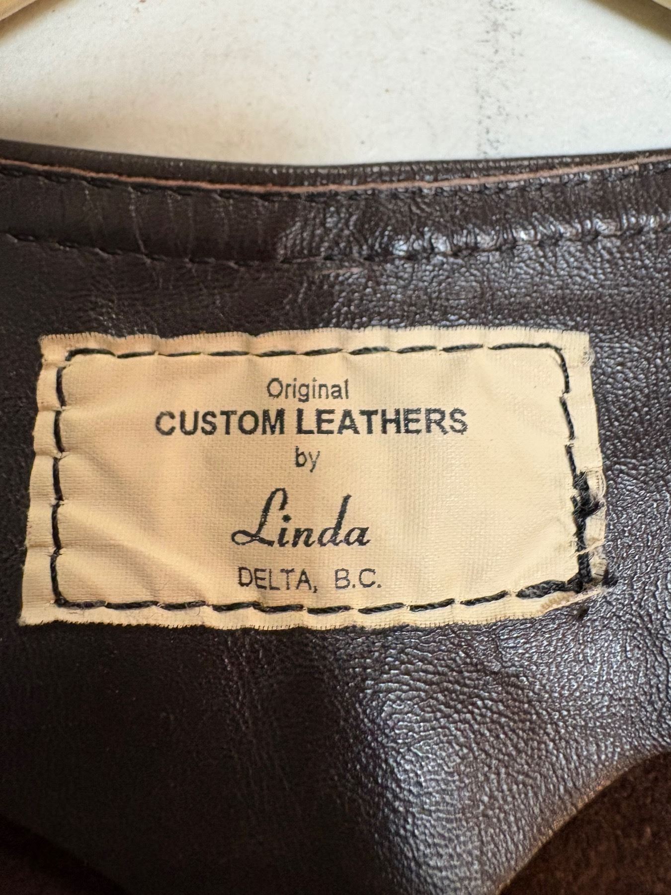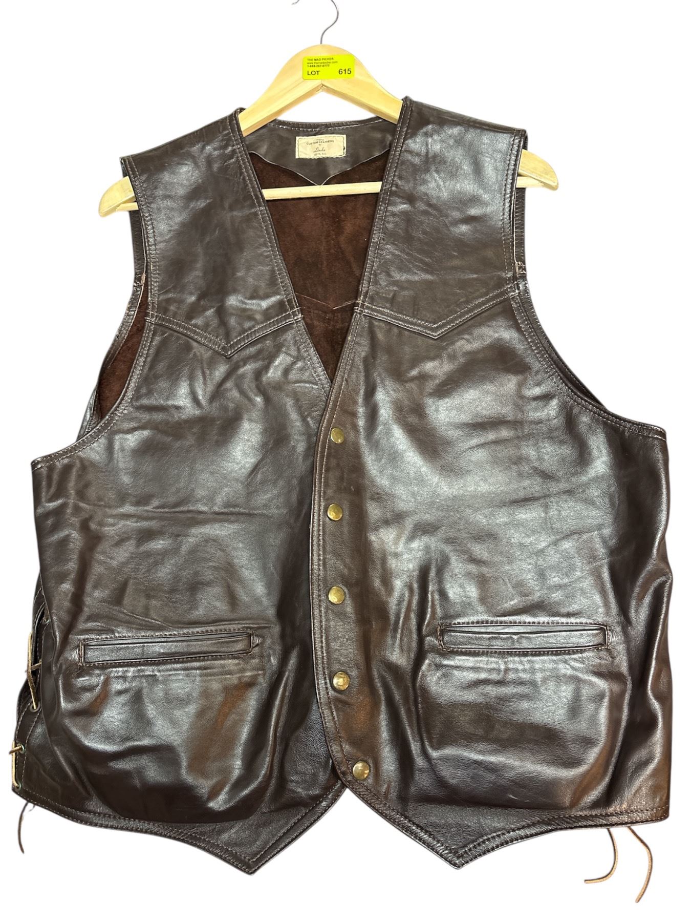 Men's brown leather vest handcrafted by Linda from Delta BC. Features lace-up sides for adjustable fit. Measurements are 24-Inch shoulder length by 15.5-Inch across. Item is as pictured.