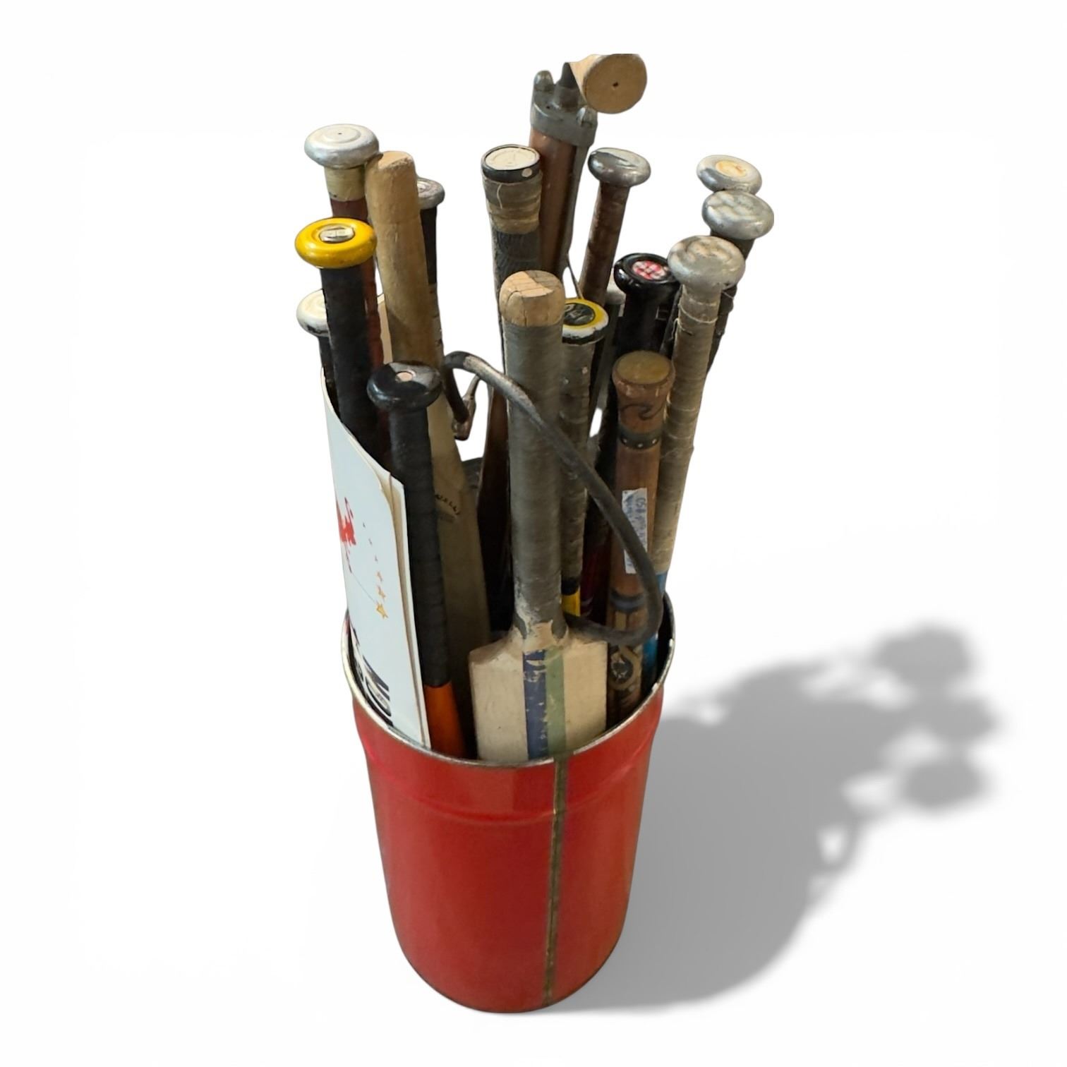 Assorted sports equipment including baseball bats, cricket bats, a bike pump, and a lacrosse stick stored in a bucket. Items are as pictured and feature a mix of equipment suitable for various sports.