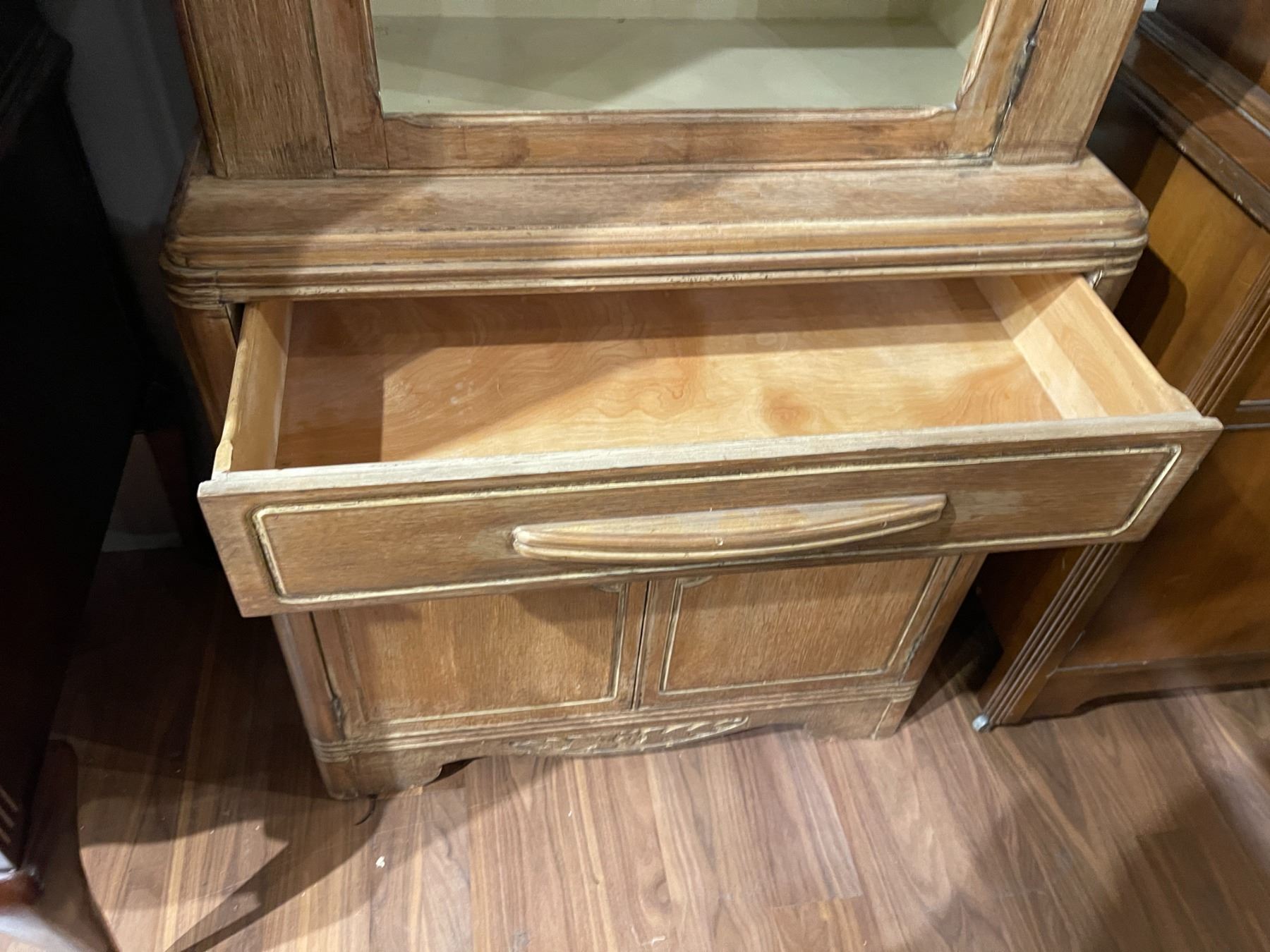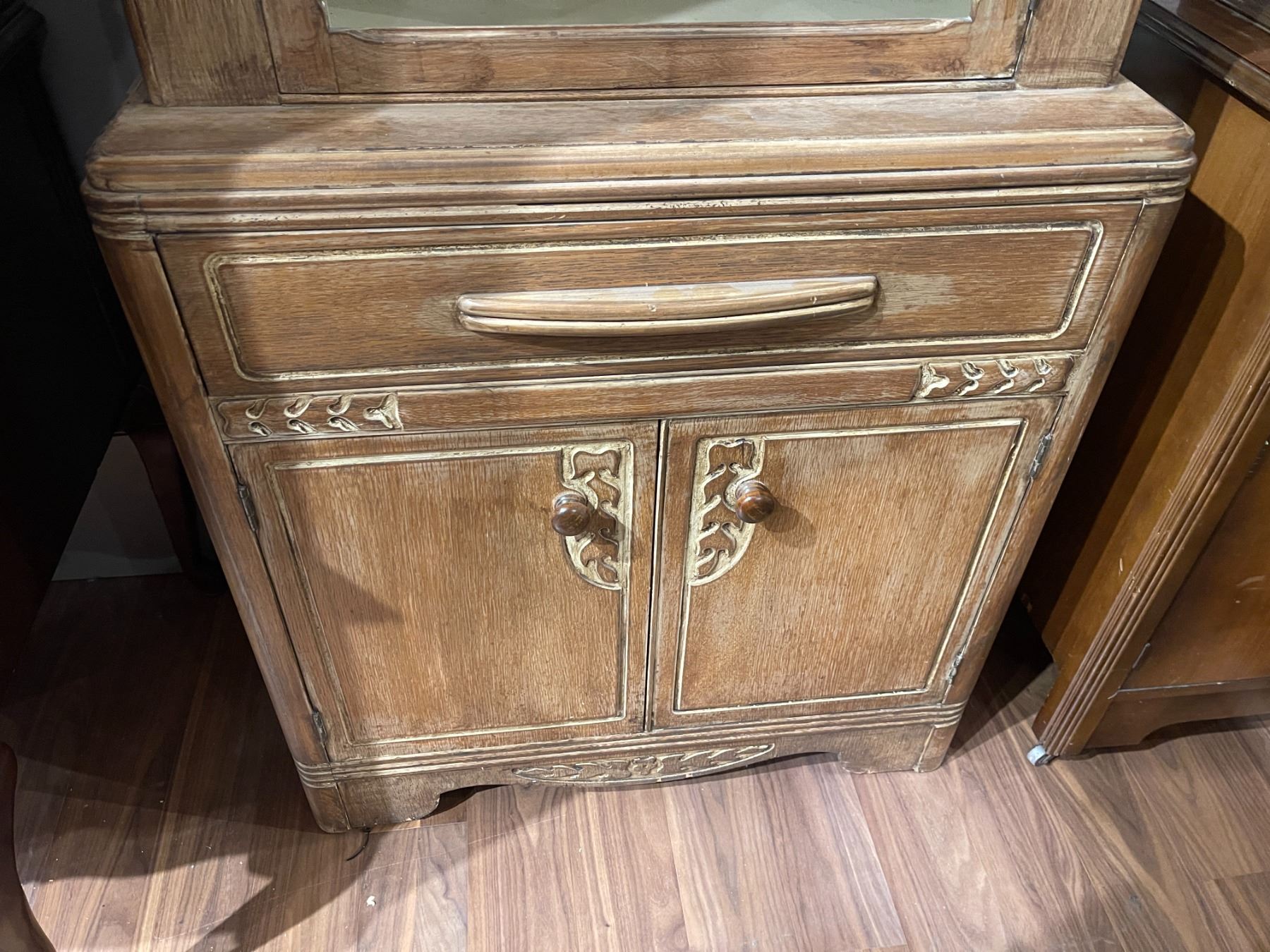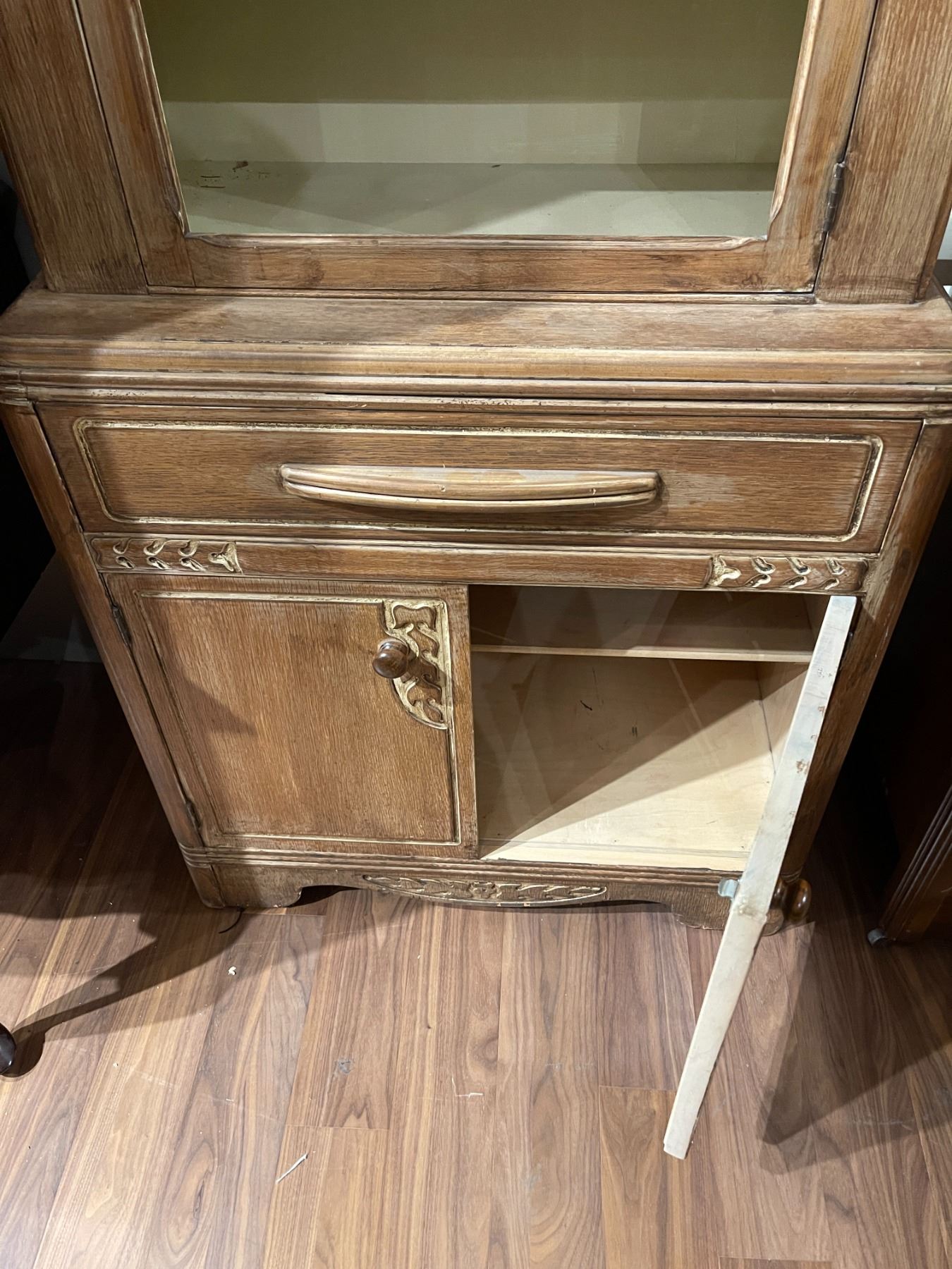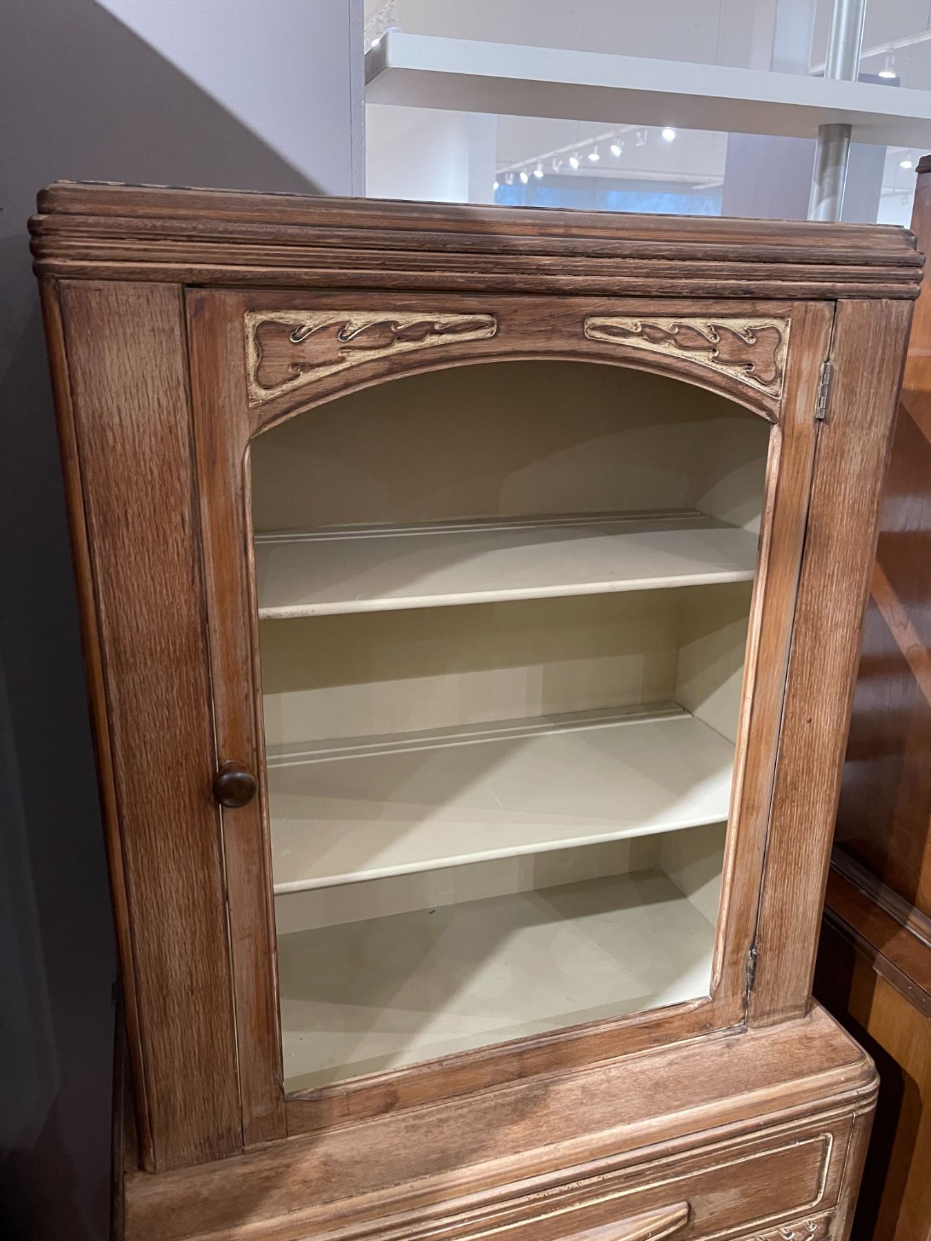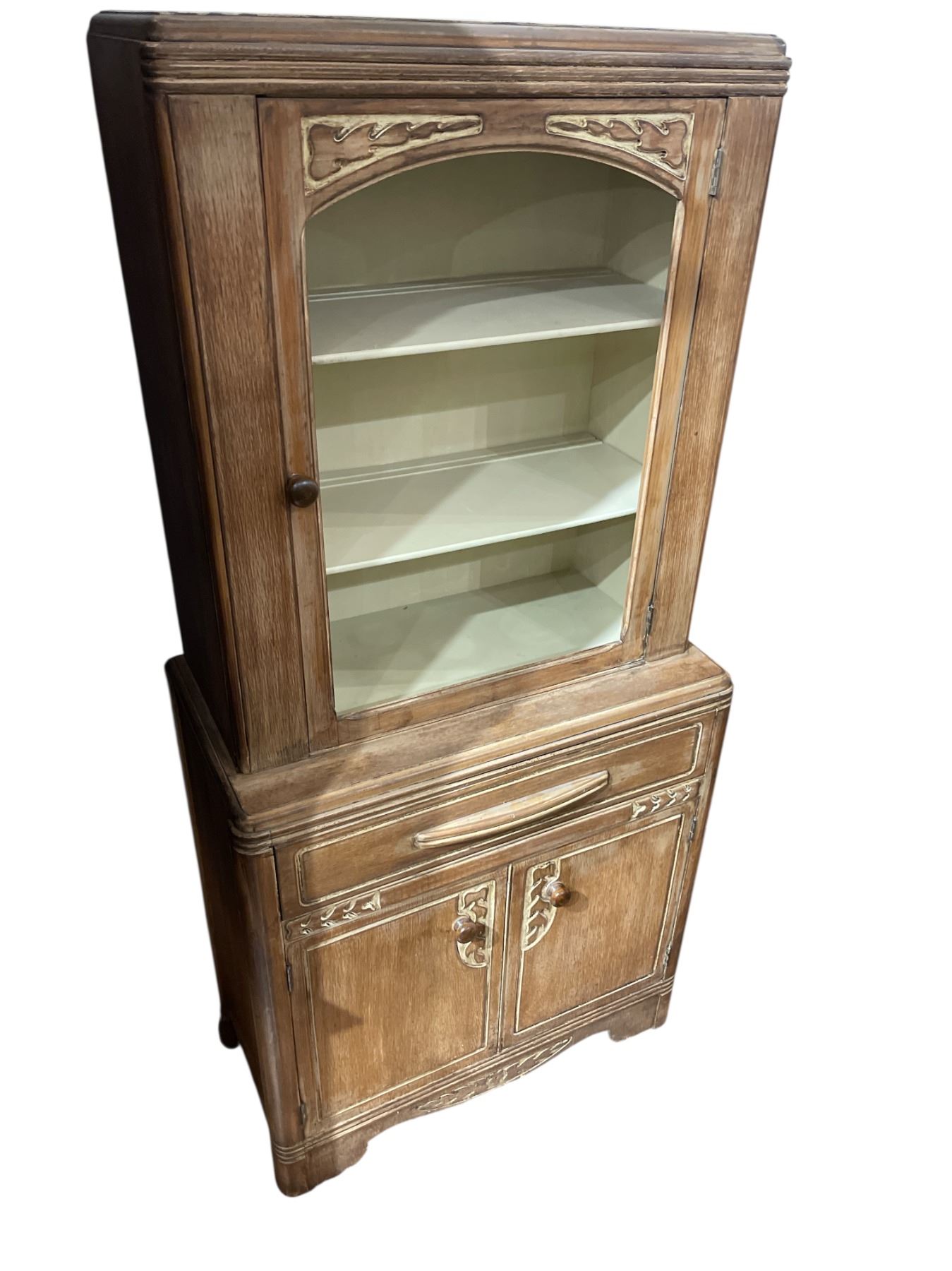 Cabinet hutch by Knechtels Limited featuring dimensions of 30-Inch length, 15.5-Inch width, and 63-Inch height. The piece requires new glass for its front panels. Item is as pictured.
