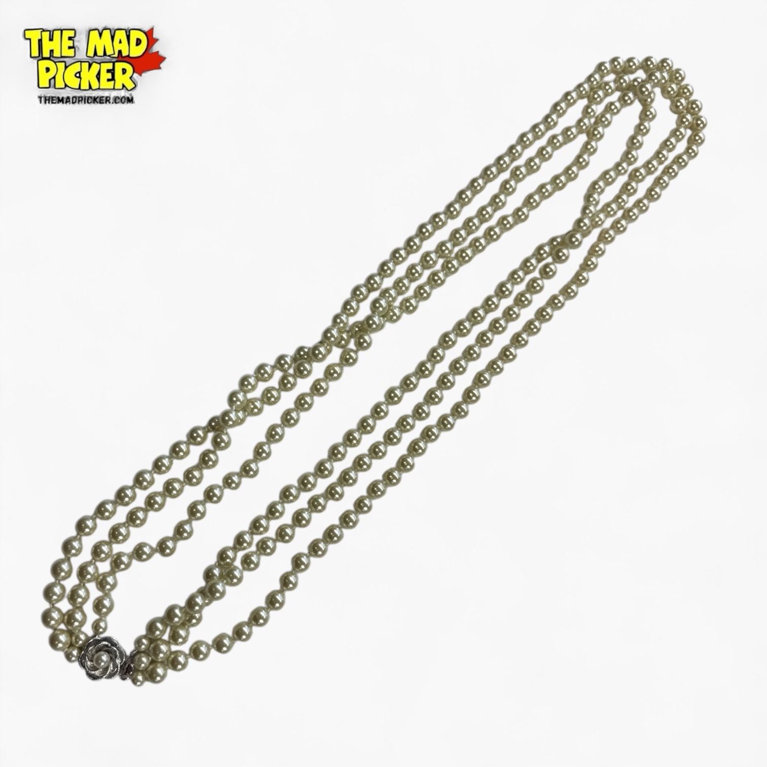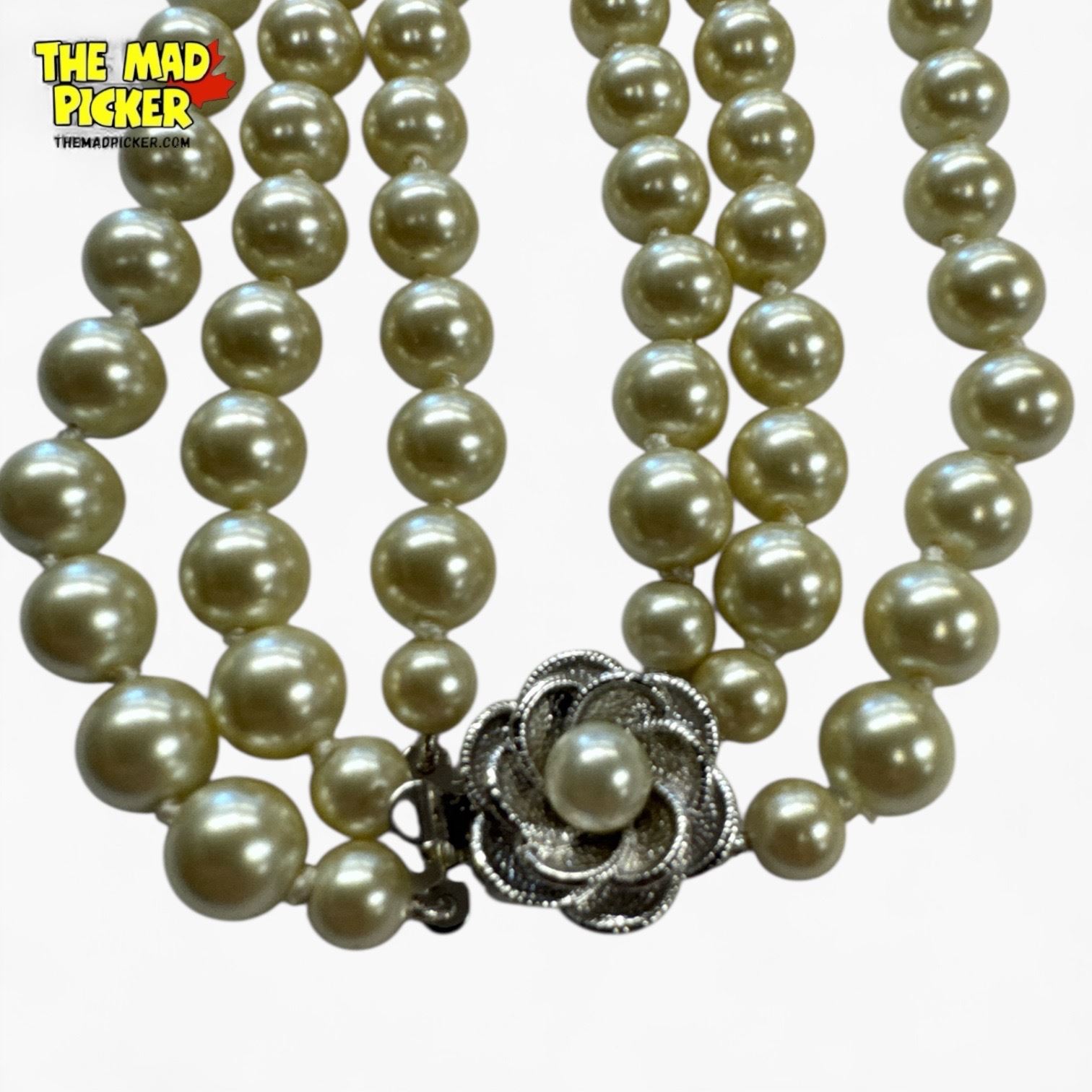 Camrose & Kross J.B.K Triple Strand of Pearls with Floral Box Clasp - 30" necklace with 8mm peals