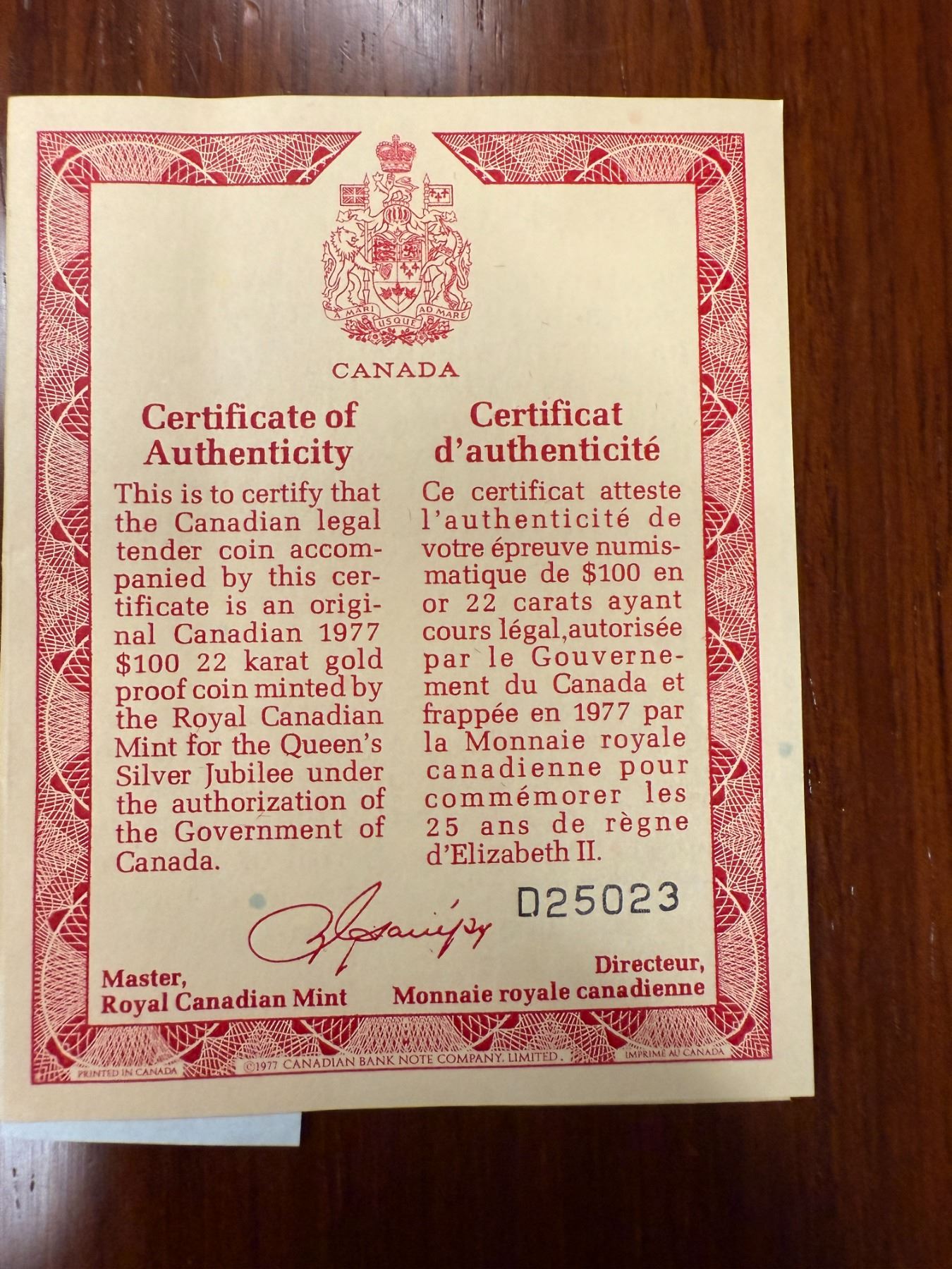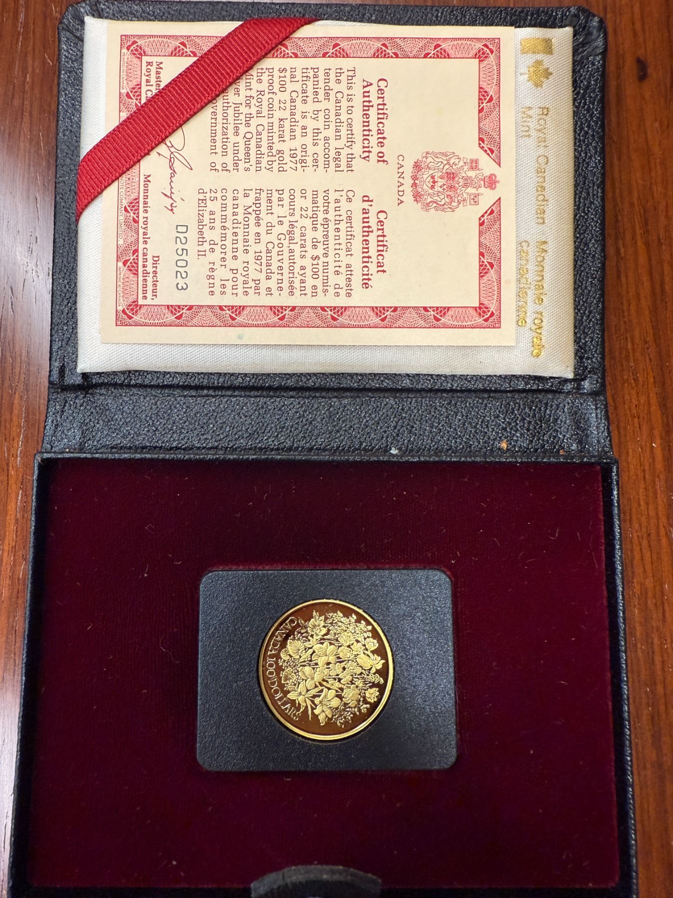 Canadian 1977 Queen Elizabeth II Silver Jubilee Gold Coin - 22 Karat Gold (91.6%) w/ COA - 16.97g