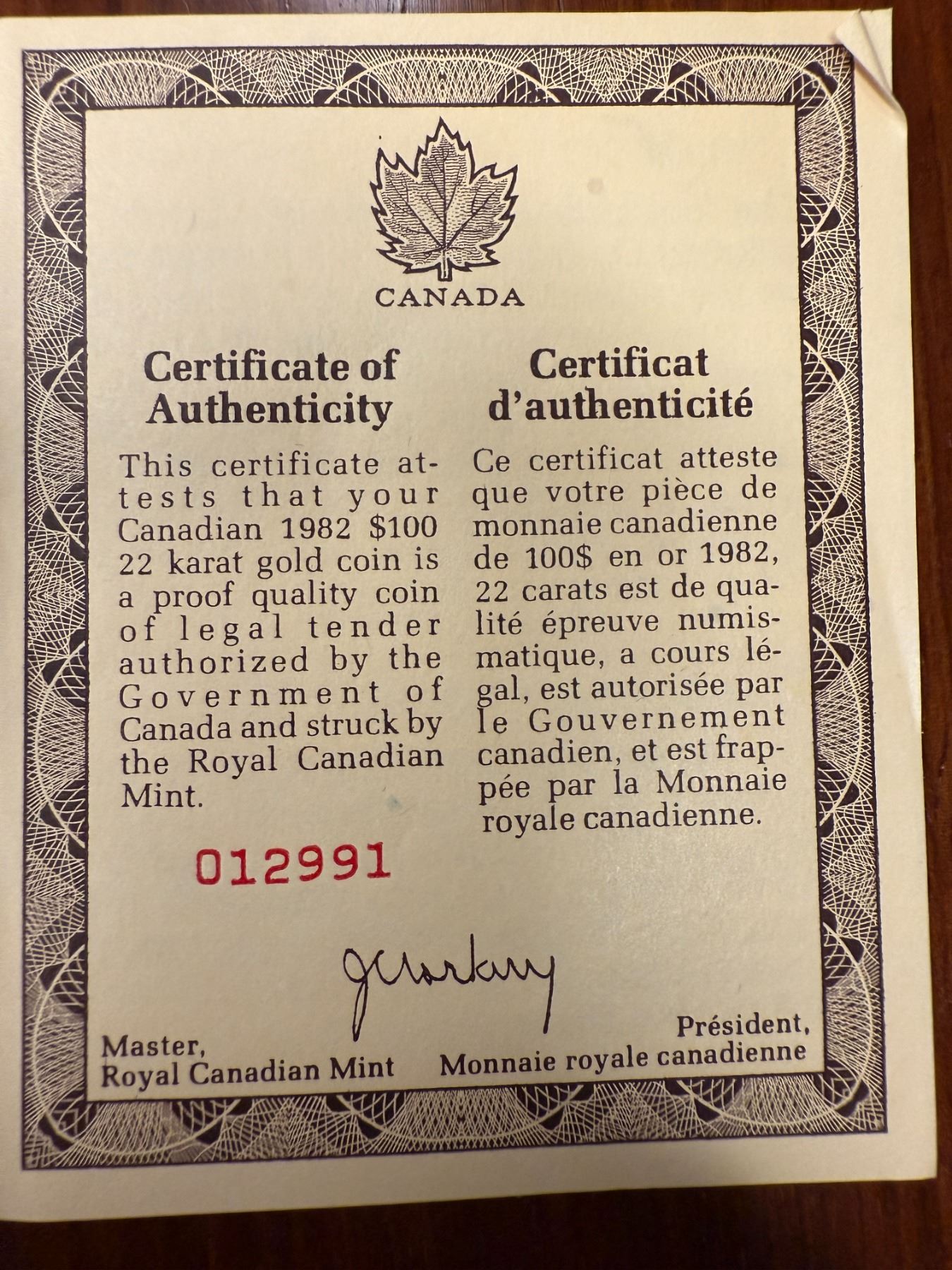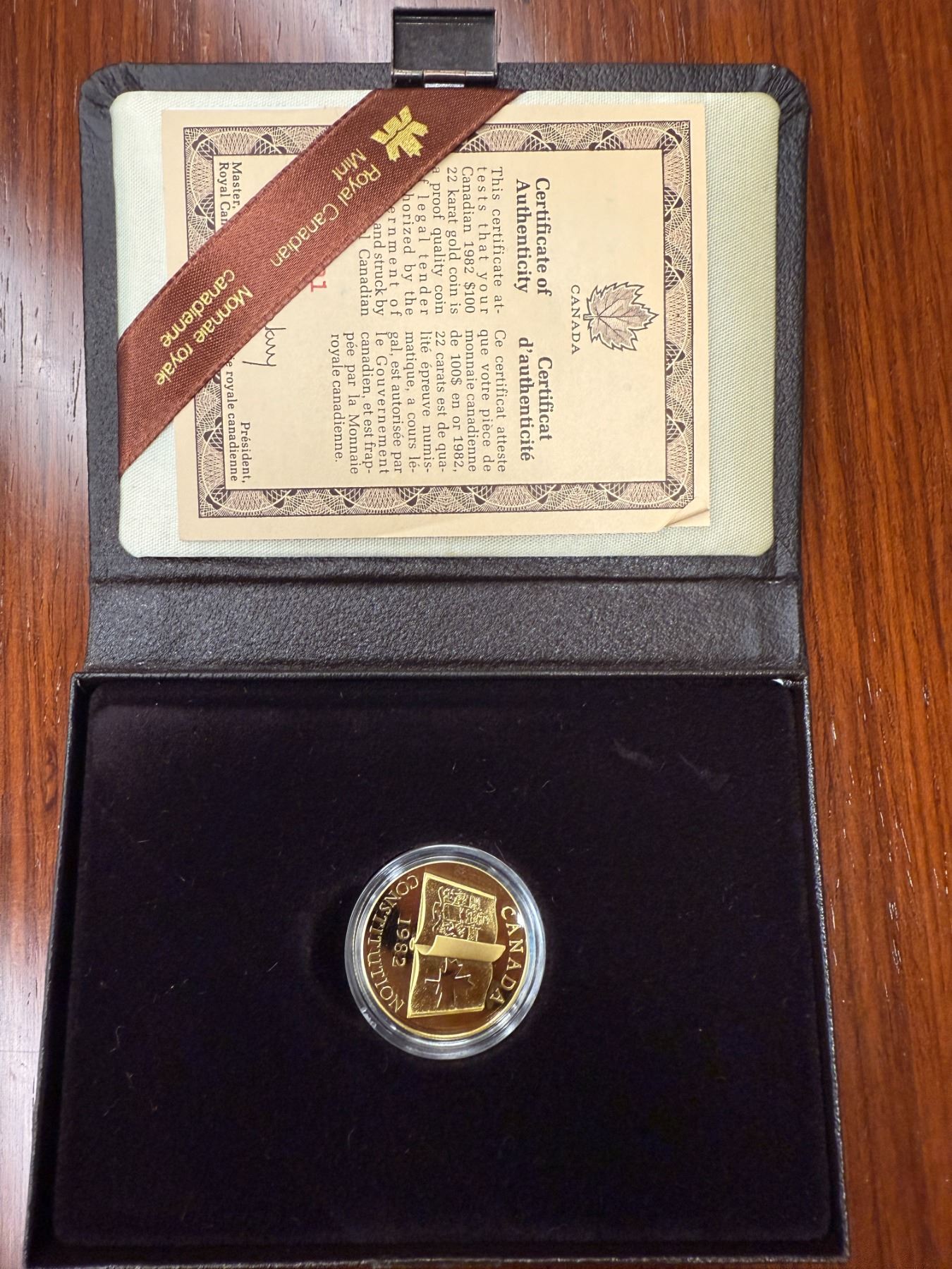 Canadian 1982 Patriot of The Constitution $100 Gold Coin - 22 Karat Gold (91.6%) w/ COA - 16.97g Weight