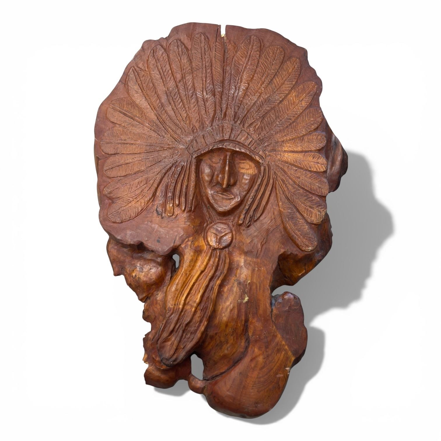 Carved burl wood sculpture depicting a Native American Indian in a headdress, signed 'W.W.' with the date '94'. Measures 22-Inch long. The detailed carving showcases the natural burl wood grain. Item is as pictured.