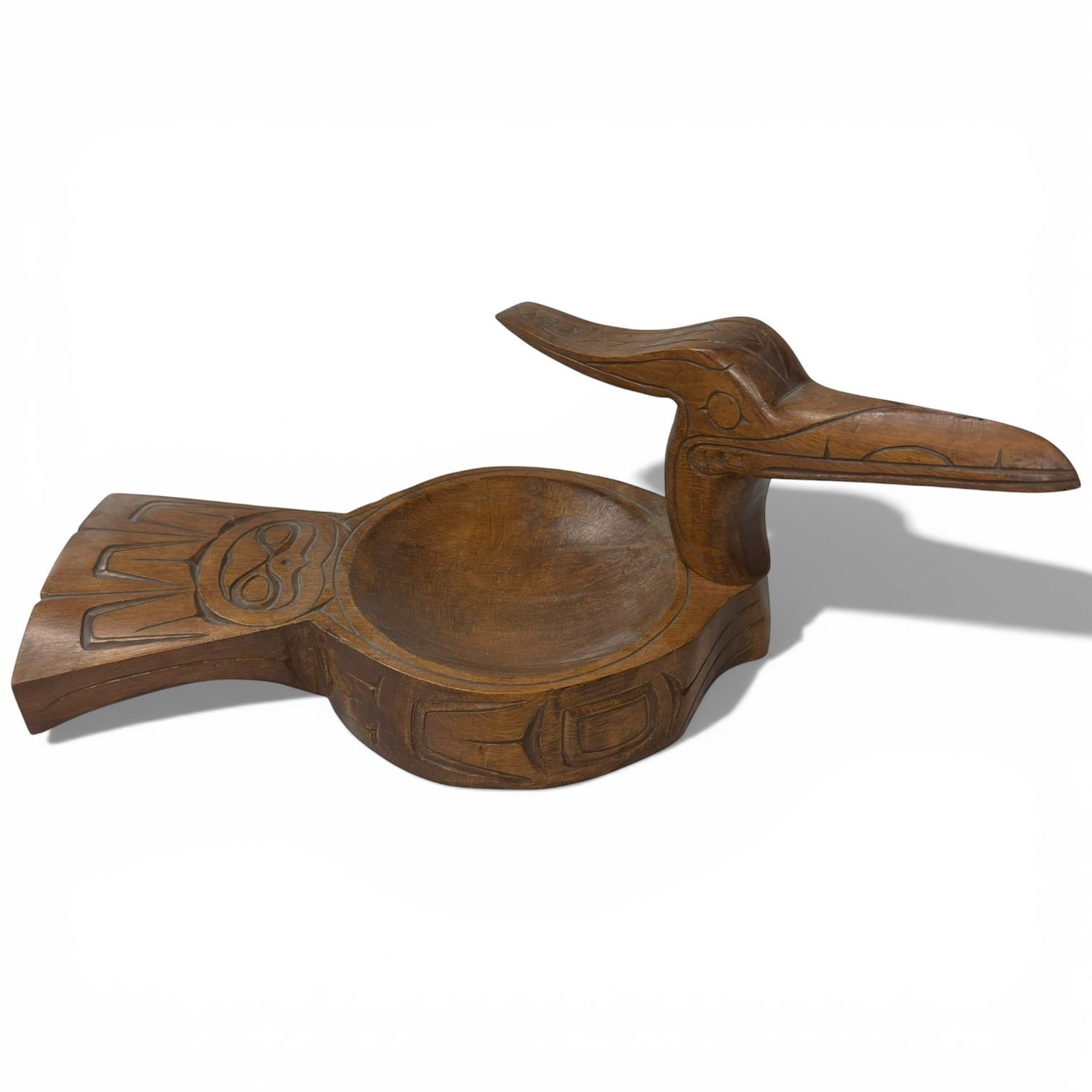Carved Cedar First Nations Grease Bowl with Articulated Loon Head * Unsigned (17" nose to tail x 7" wide)