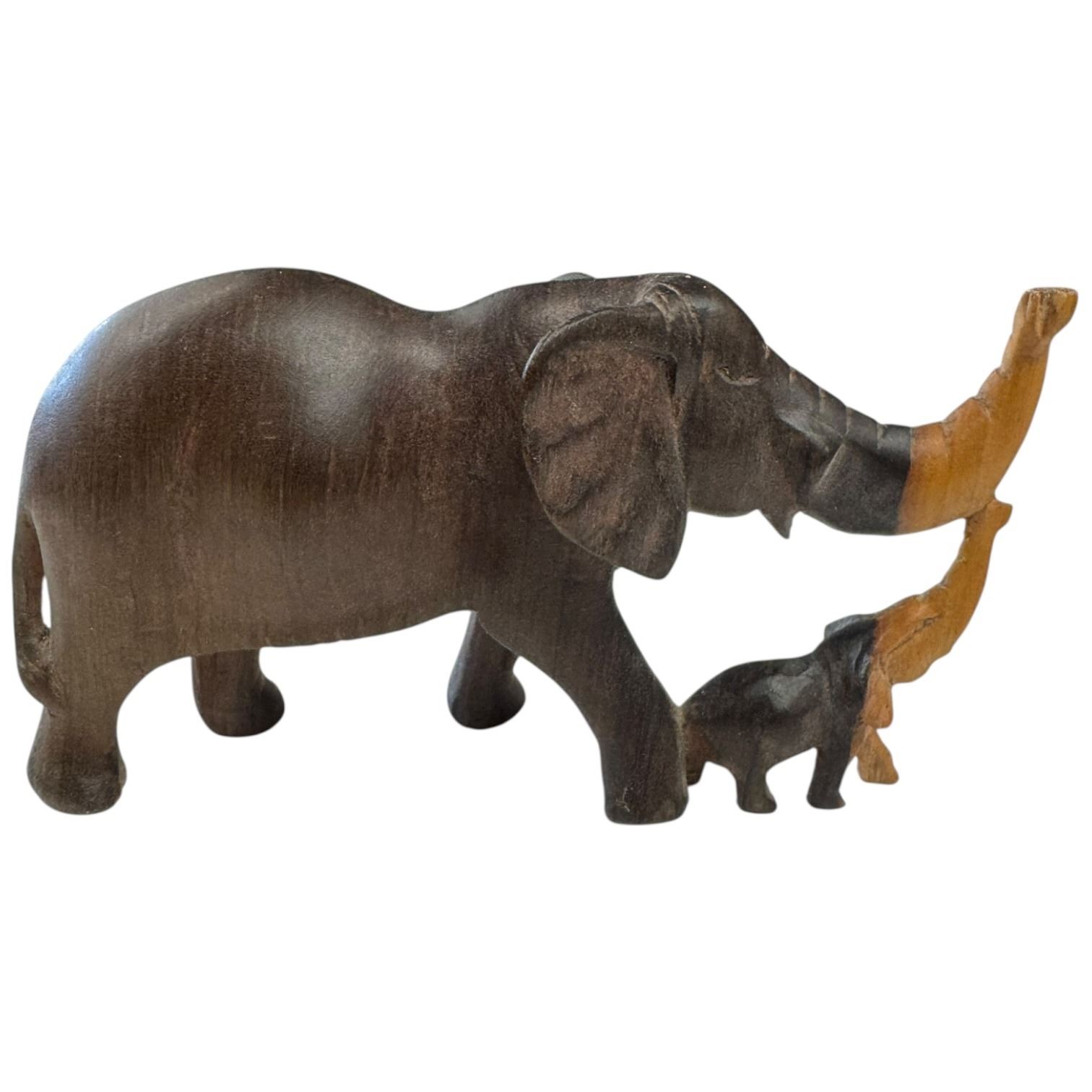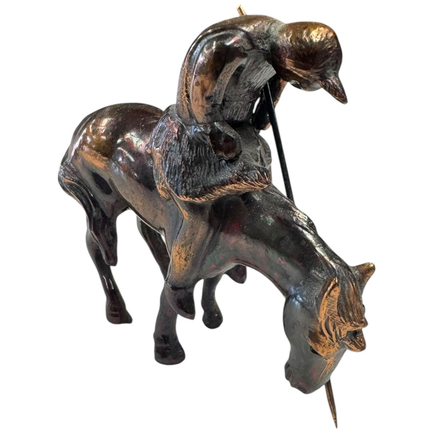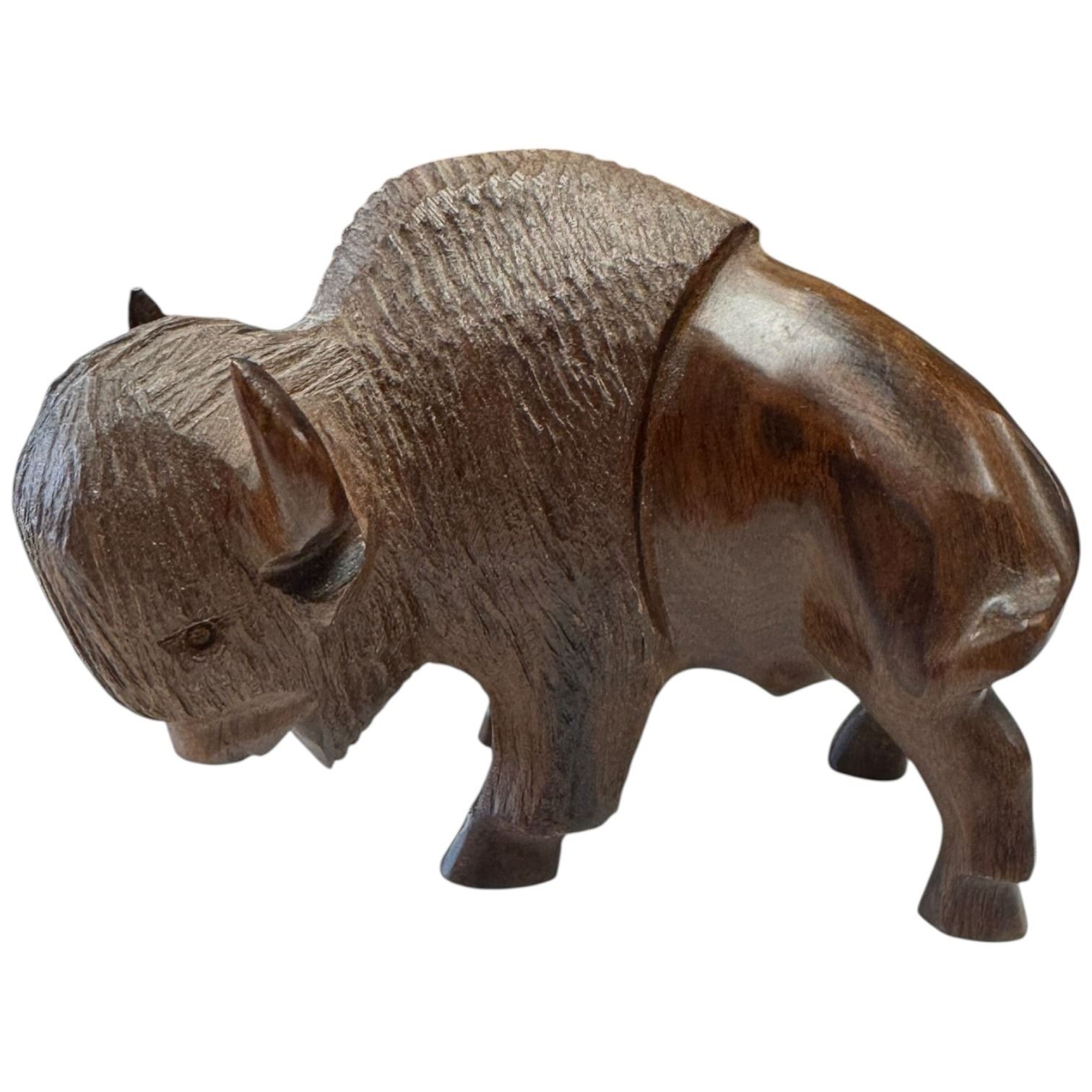 Carved Wood Buffalo & Elephant Statuette & Mini Copper Hunter on Horse (Buffalo is 4" x 6" x 4" tall)
