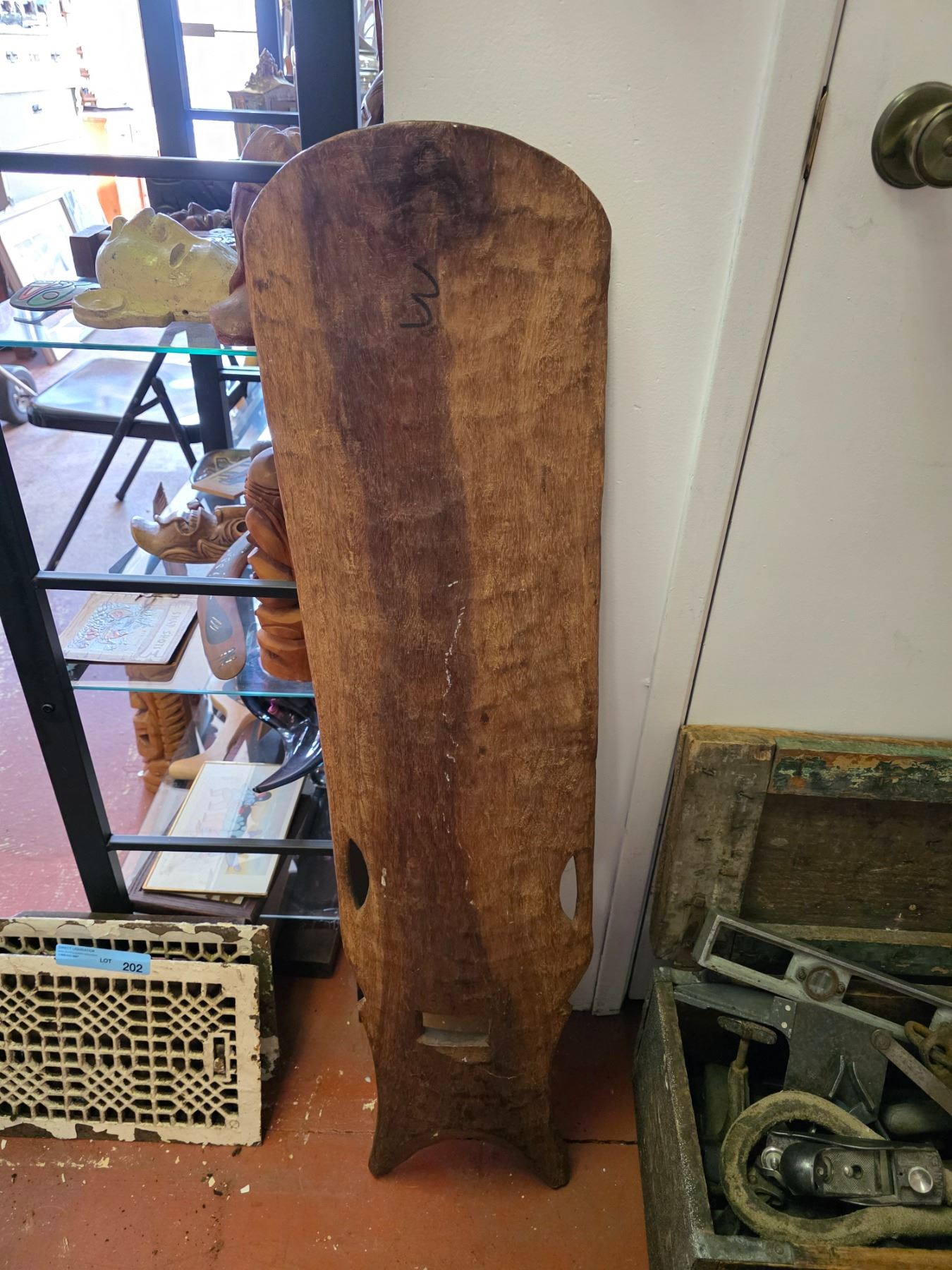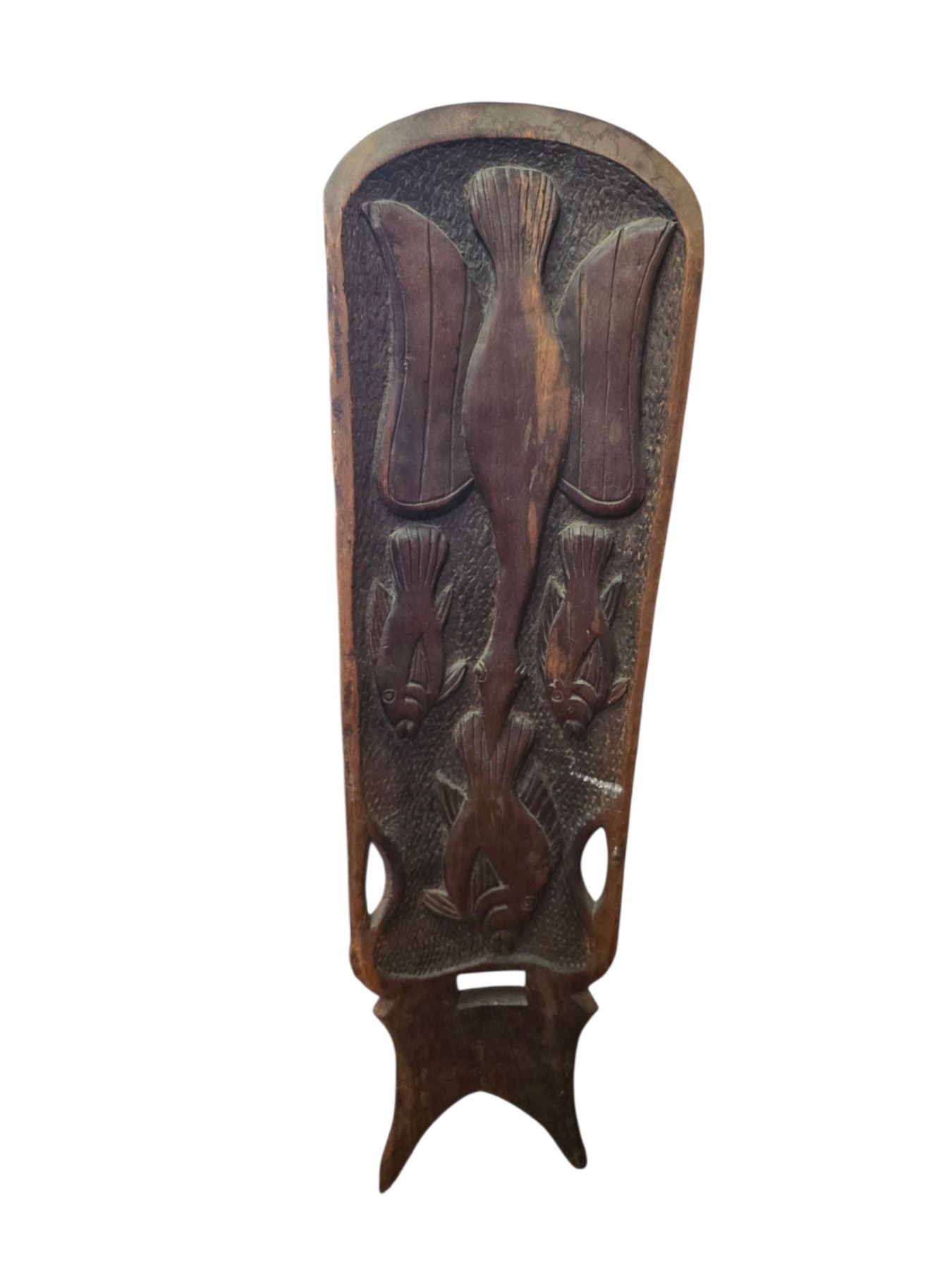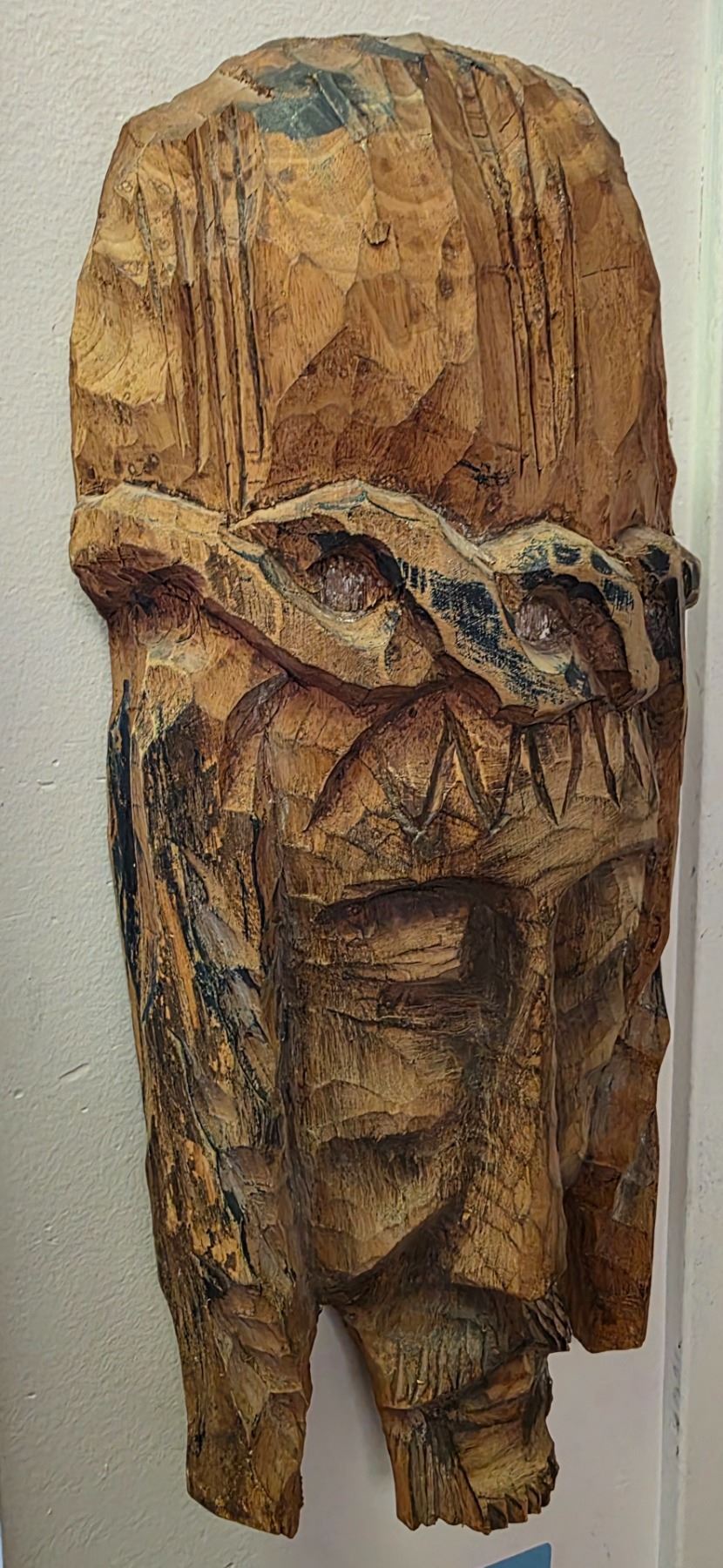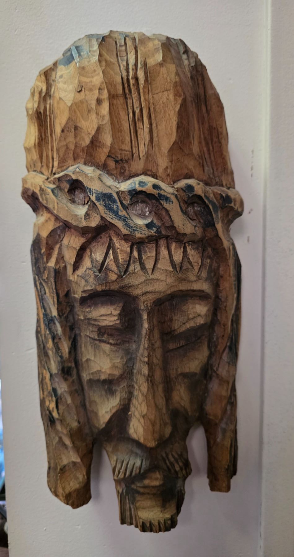 Carved Wooden Christ Face Mask (H16") and Tribal-Style High-Back Chair Panel (H41")