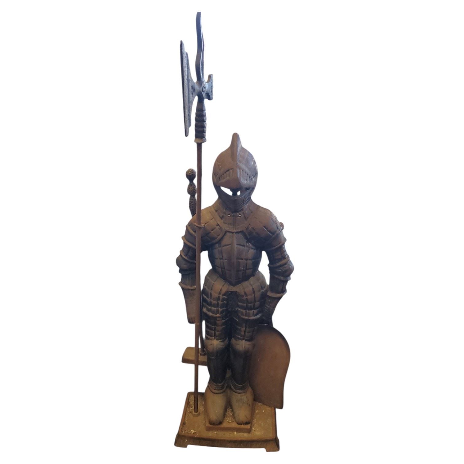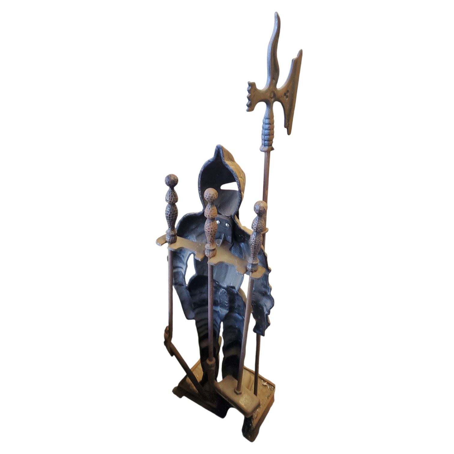 Fireplace tool set featuring a cast iron knight in armour design with patina finish. Measures 30-Inch tall. Includes tools such as poker, shovel, and brush integrated into the knight's design. Suitable as a functional fireplace accessory or decorative piece. Item is as pictured.