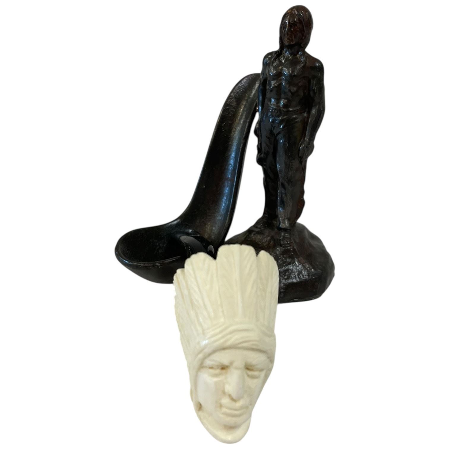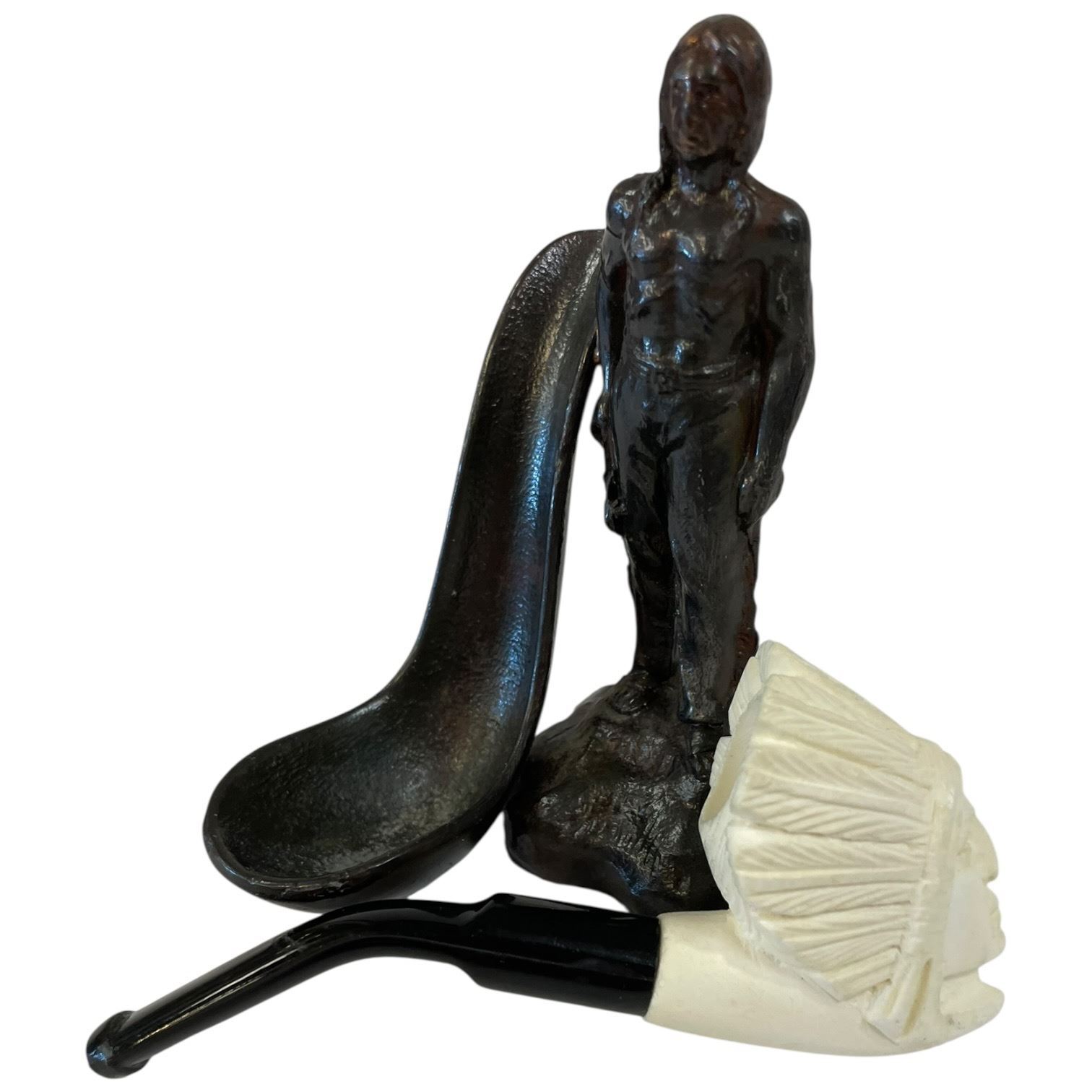 Cast Metal Figural Native Pipe Holder with Chief's Head Pipe