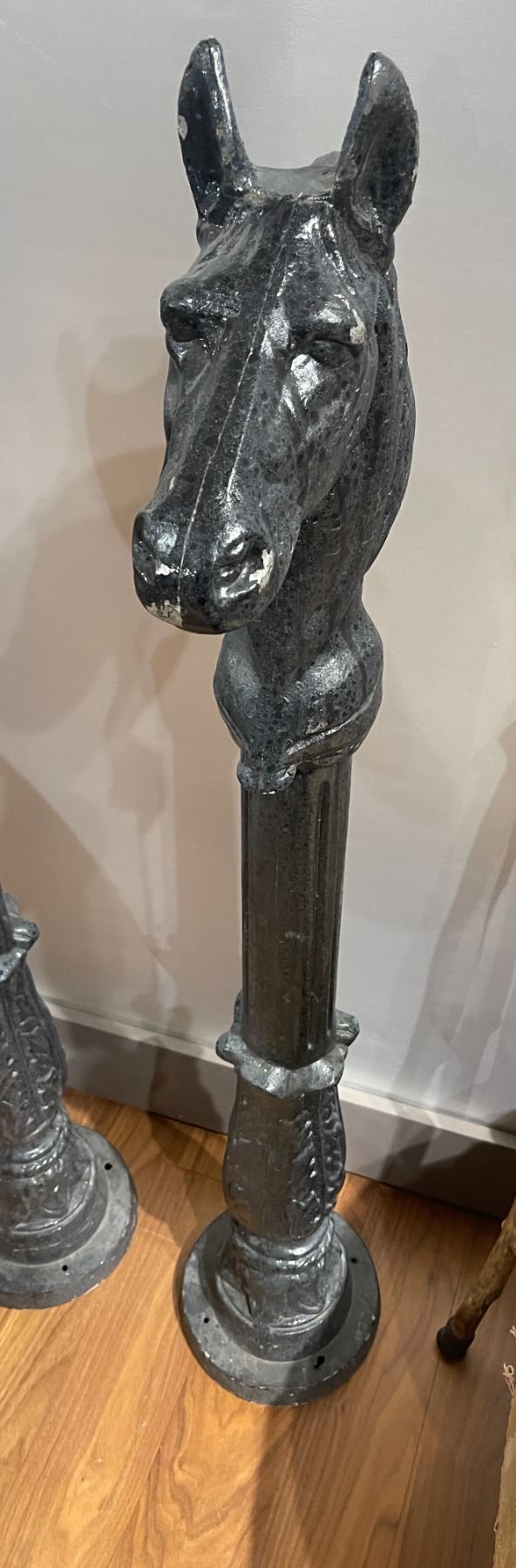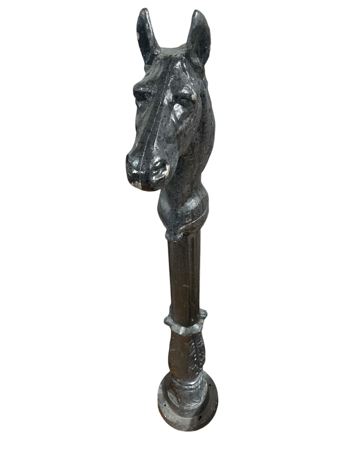 Cast metal reproduction hitching post featuring a horse head design. Measures 45-Inch in height. Suitable for decorative use. Item is as pictured.