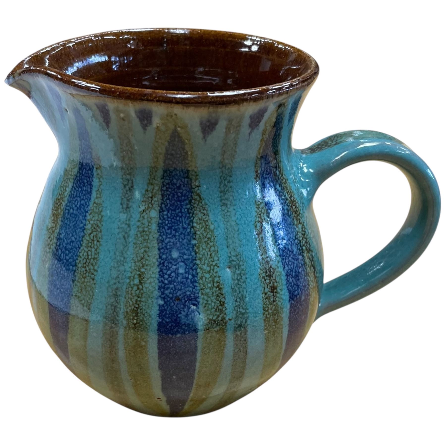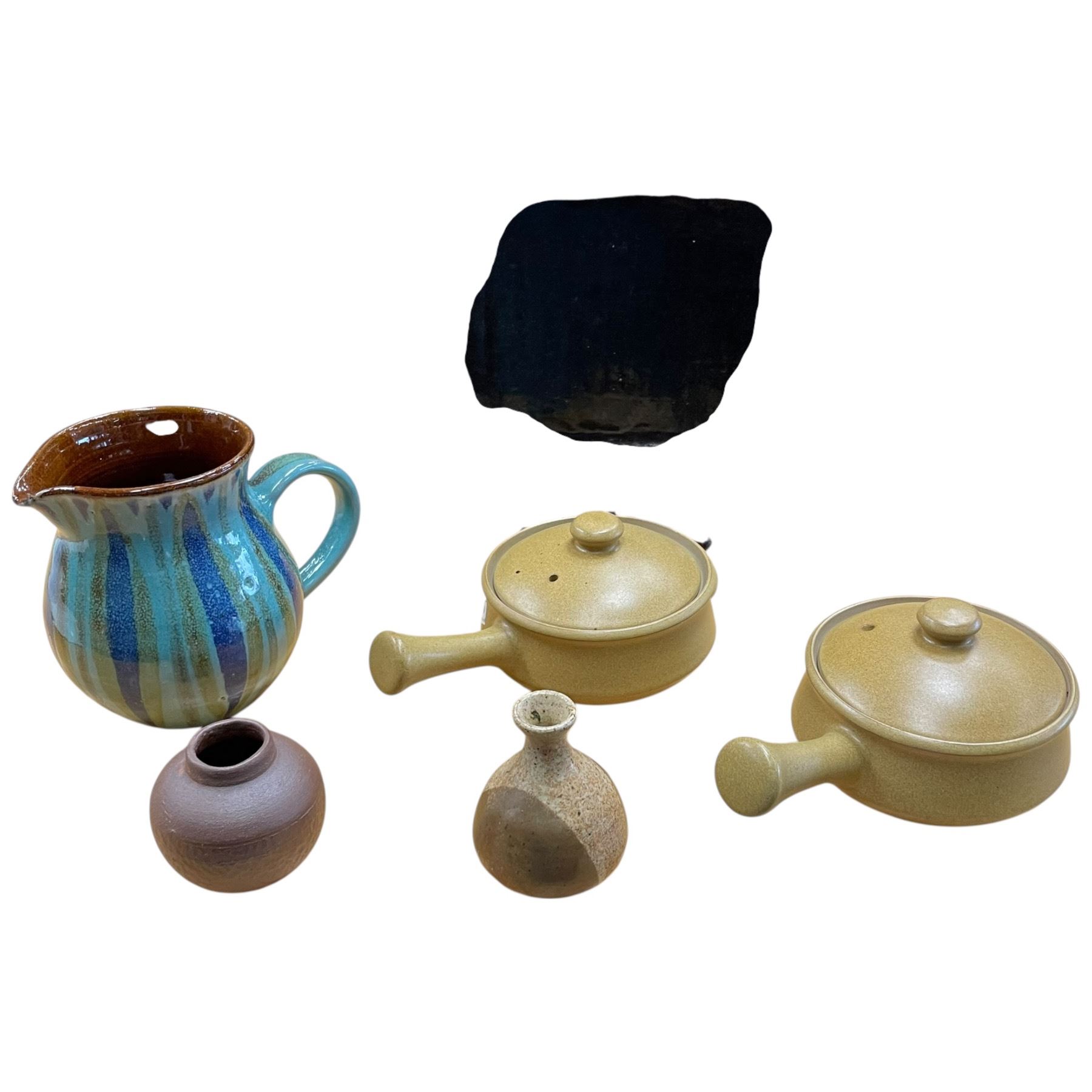 Collection of ceramics and pottery including Denby handled edge soup bowls, a lazed jug, two small vases and a plate measuring 9.75x7.25. Items feature varying finishes and styles. Item is as pictured.