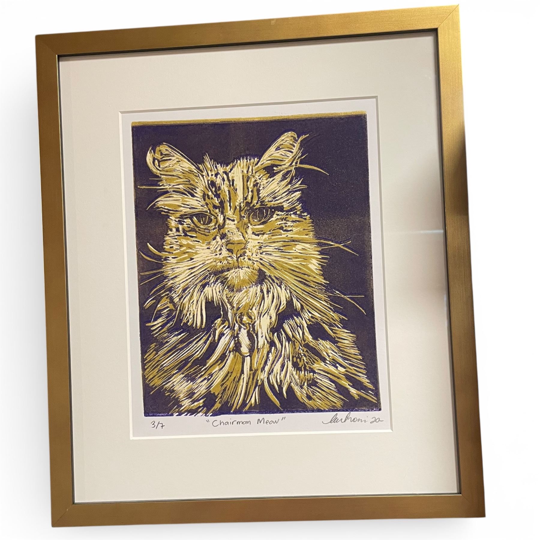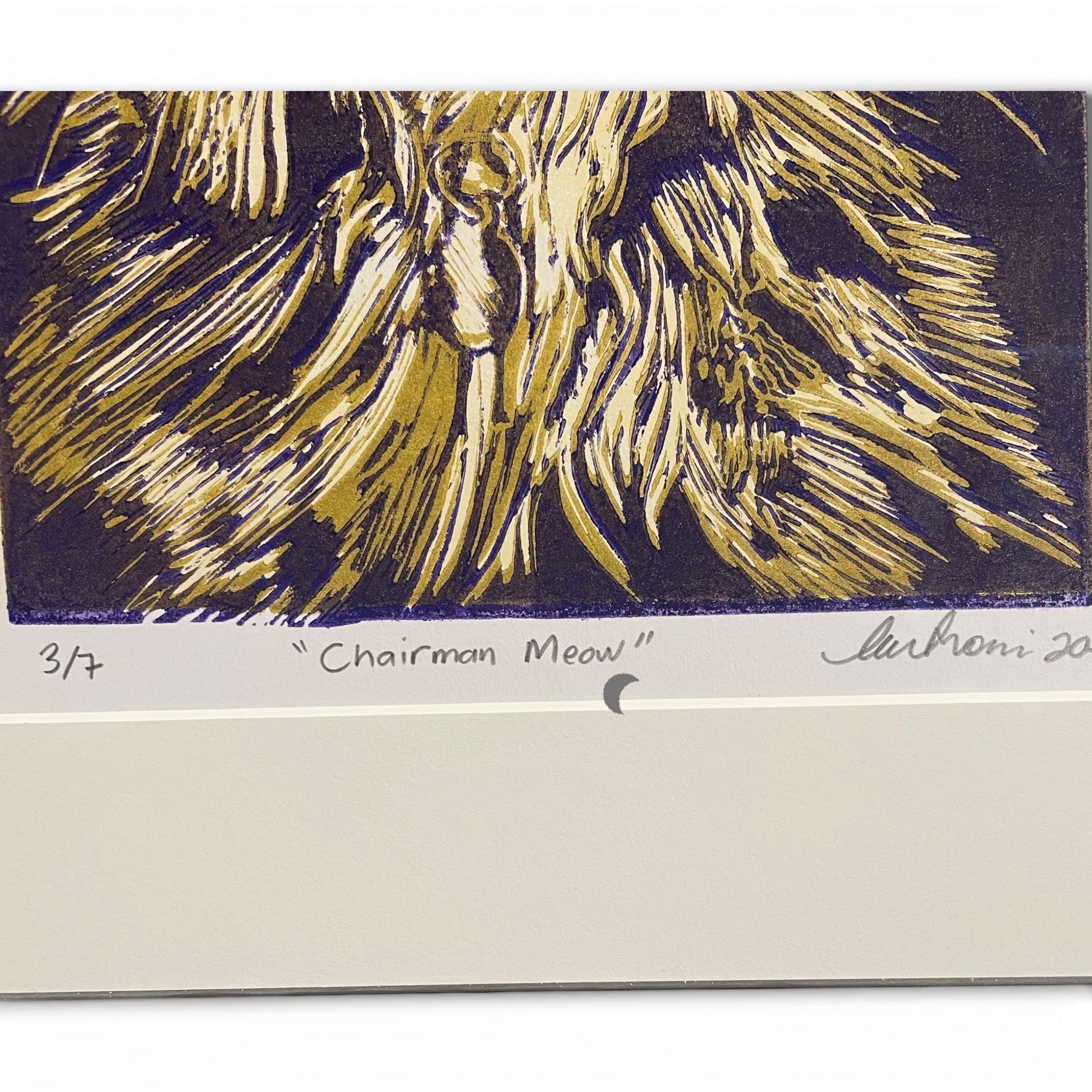 Limited edition block print titled 'Chairman Meow,' number 3 out of 7. Signed artwork possibly by Lurkoni. Features feline-themed design. Measures 14.5 x 16.5-Inch. Item is as pictured.