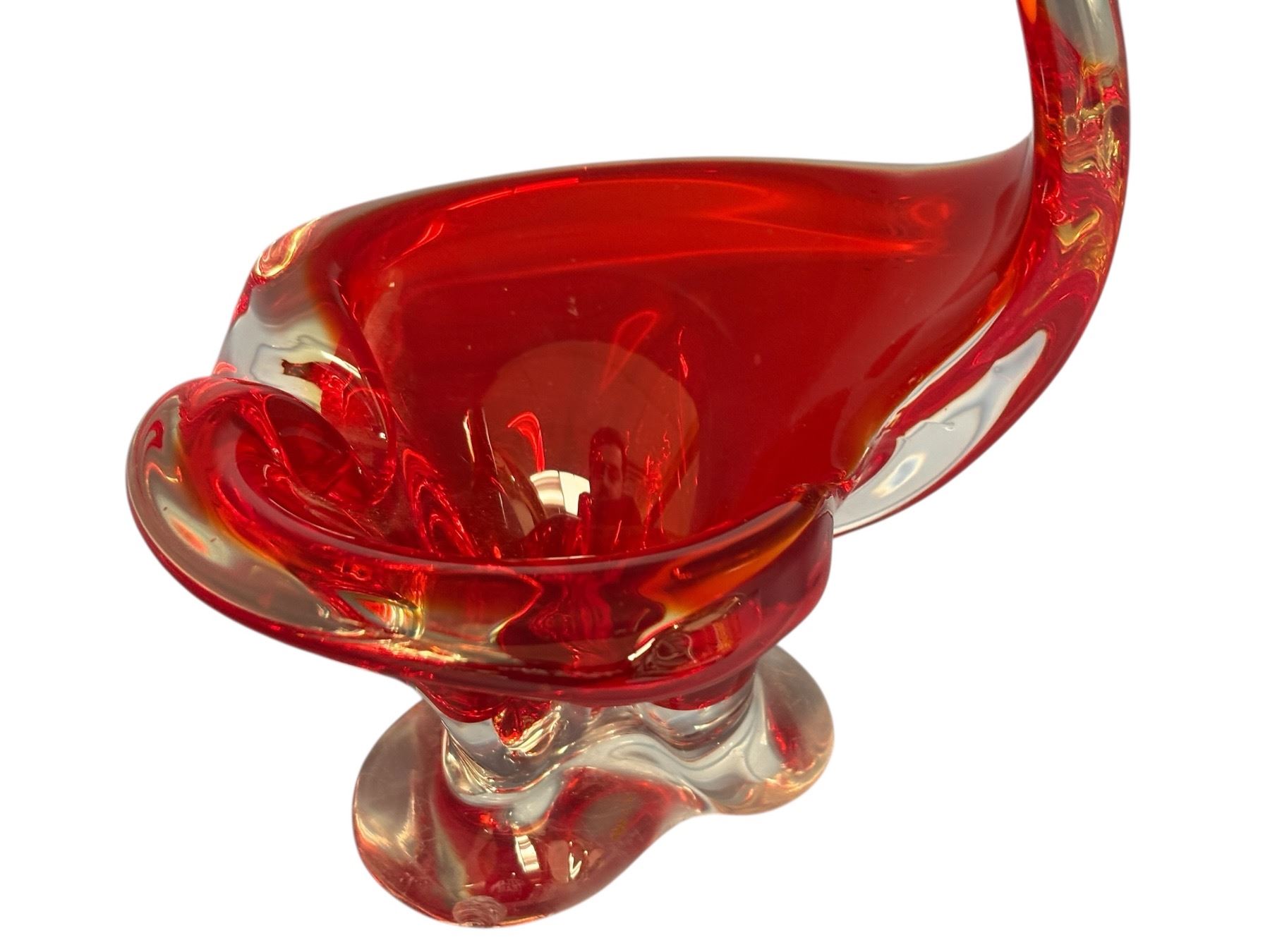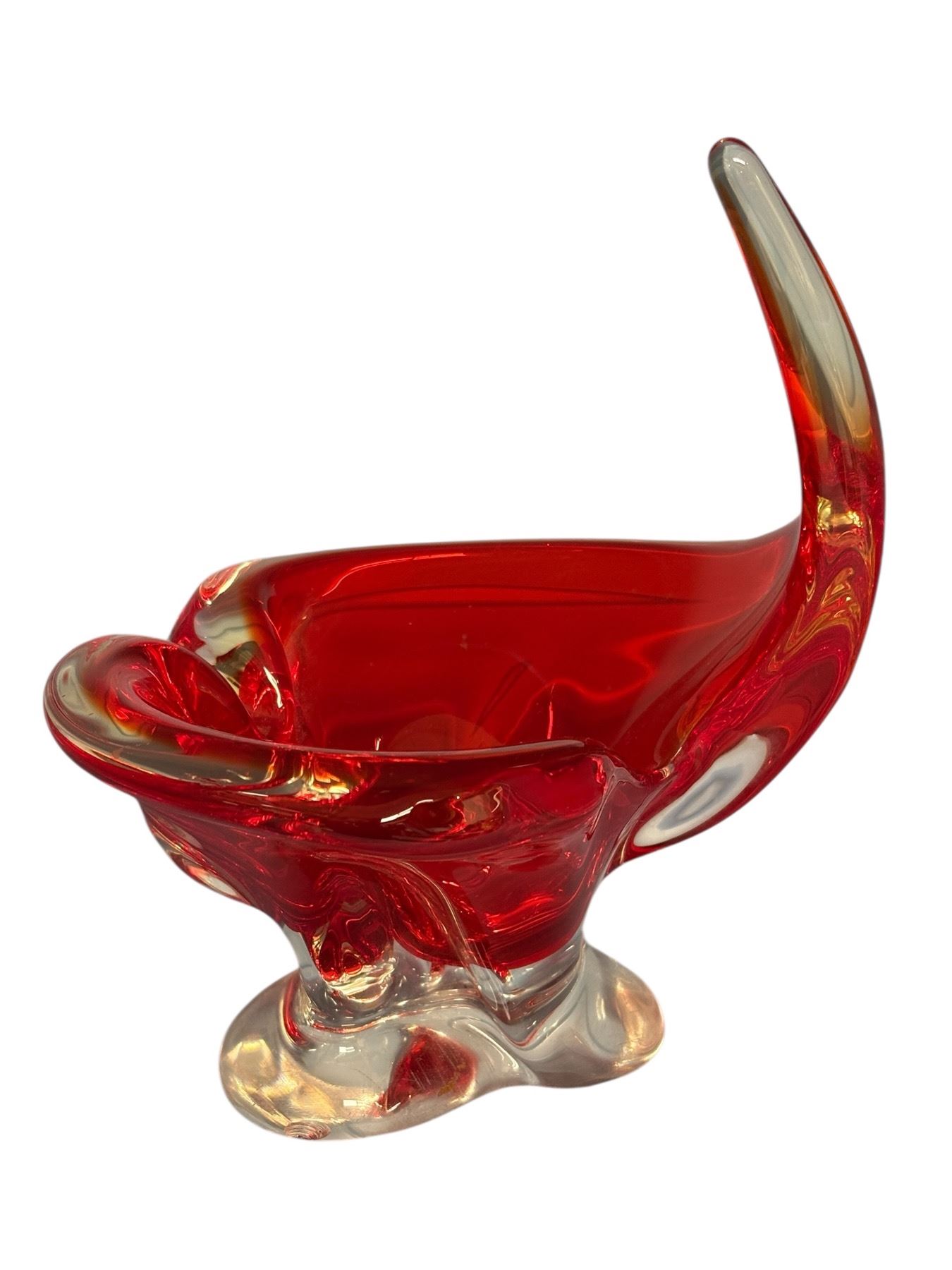 Chalet Artistic Glass centerpiece in a red swirl splash design. Measures 8 inches tall. Produced between 1960-1975 during the Quebec-based company's operational years. Known for distinctive sculptural forms, this piece features vibrant red coloring characteristic of Chalet Artistic Glass.