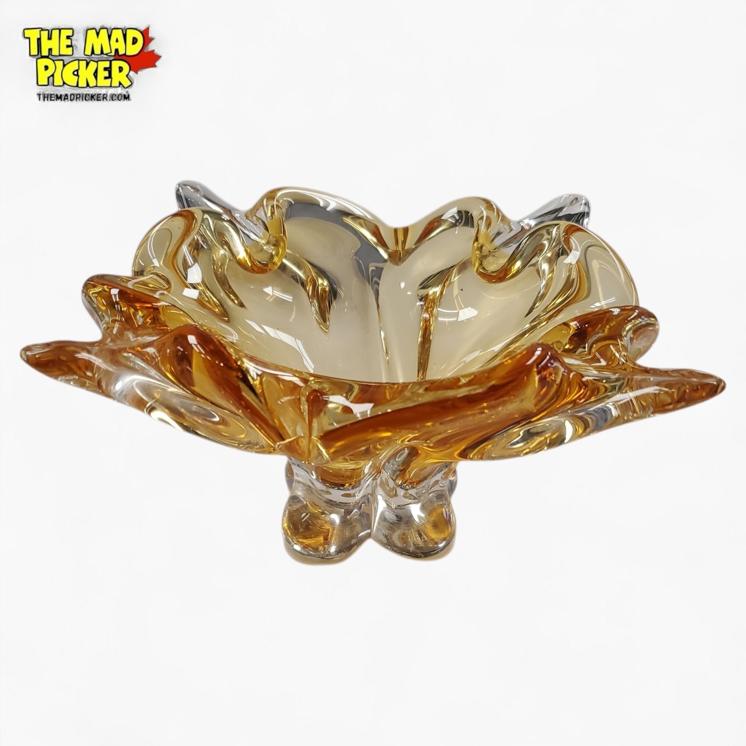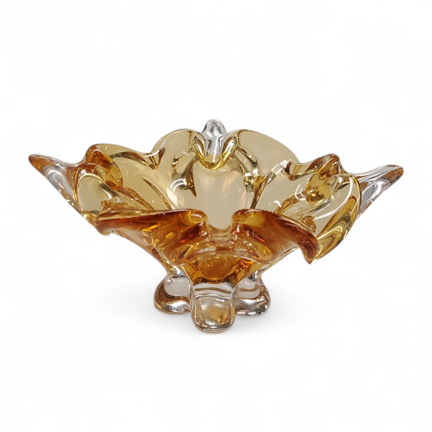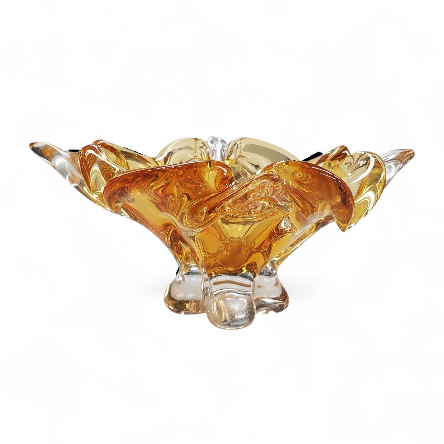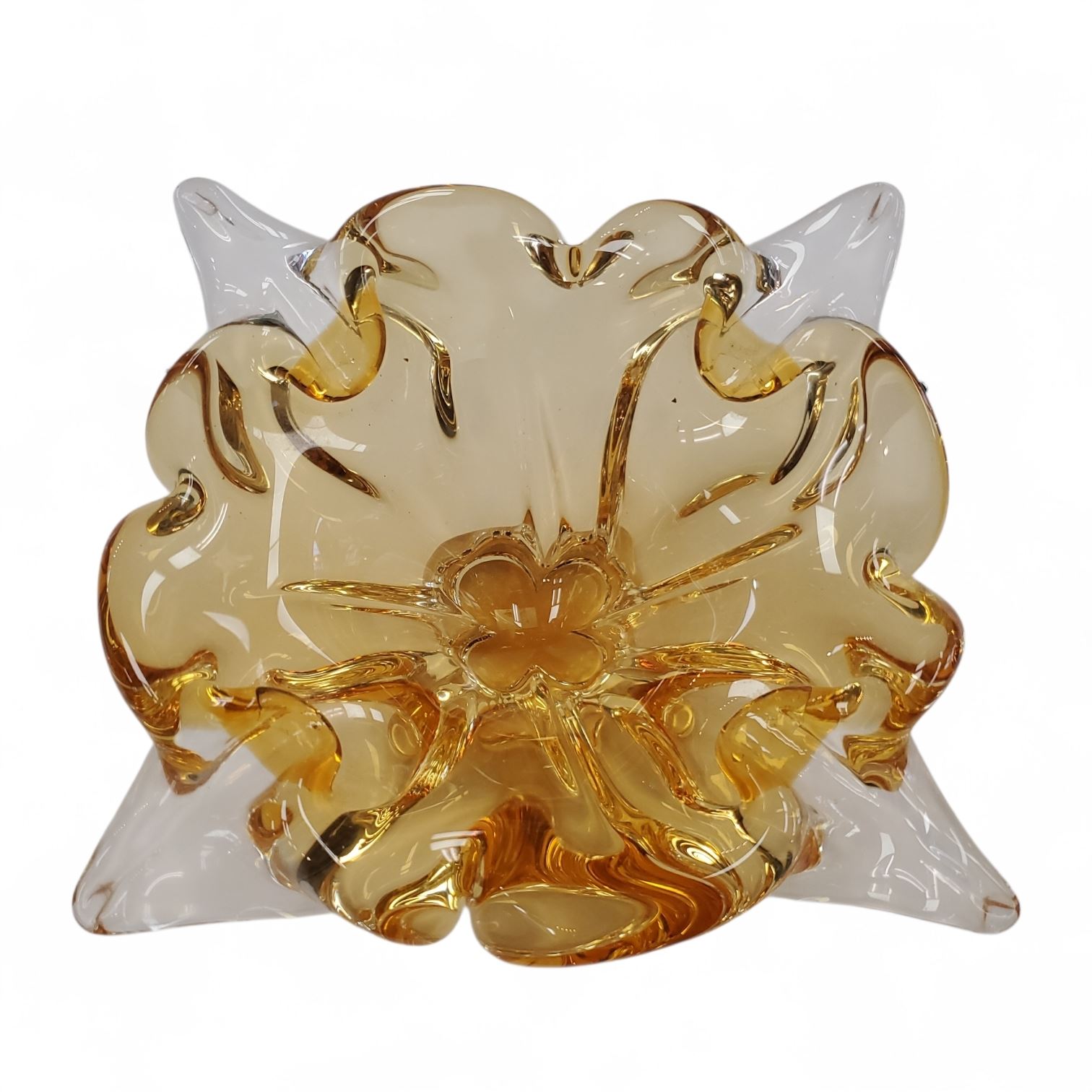 Vintage Chalet Art Glass bowl in amber or honey tone, hand-blown with a distinctive 4-point freeform design. Made in Canada between 1962 and 1975. Characteristic of Chalet's mid-century modern style, this unsigned piece showcases their organic, light-catching craftsmanship. Approximately 8-12 inches.